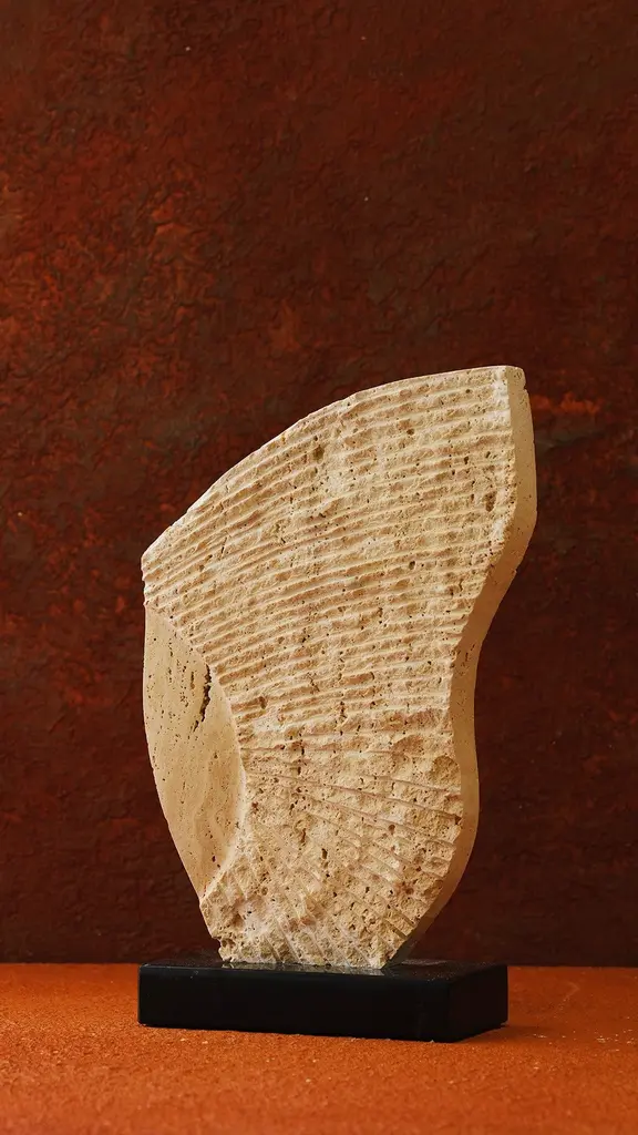 Handmade Travertine Sculpture, Beige Stone On Black Base & Wind-Carved Textural Detail