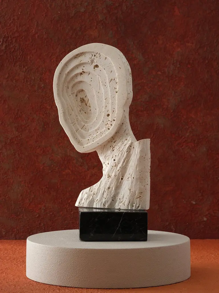 This Handmade Travertine Silhouette Sculpture evokes raw elegance and artistic introspection. Carved from natural beige travertine, its abstract head shape features concentric cut-outs that mirror the contours of thought and identity. The hand-sculpted surface texture mimics the folds of draped fabric and the natural movement of stone, creating a compelling juxtaposition of form and material. Resting atop a polished black marble base, it stands as a sophisticated accent for bookshelves, console tables, or modern mantels. A conversation-starting tribute to individuality and the organic beauty of stone.