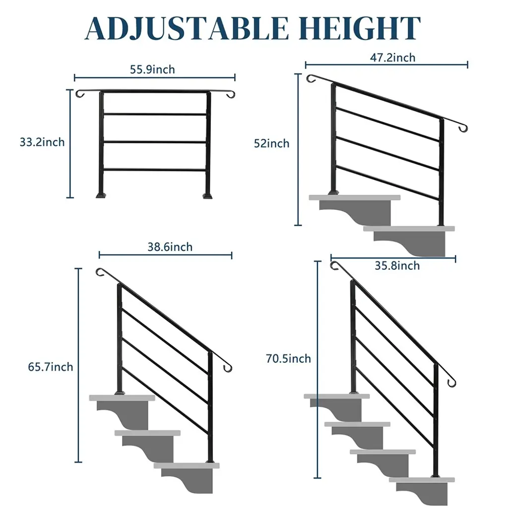 Elevate the safety and style of your outdoor steps with our robust Handrails for Outdoor Steps. This wrought iron handrail is a versatile solution designed to fit either one to four steps with ease, providing sturdy support for children, the elderly, and pregnant women. Its black powder-coated finish not only adds a sleek, minimalist touch to various exteriors but also ensures durability against the elements, resisting rain and rust. Perfect for residential homes, gardens, office buildings, hotels, or any establishment with stairs, this handrail is a blend of functionality, strength, and aesthetics. Features: 1. Universal Fit: Can be adjusted to accommodate 1 to 4 steps, ensuring a perfect match for various staircases. 2. Superior Durability: Crafted from solid wrought iron with a long-lasting powder-coated surface, which is more rigid than aluminum products. 3. Weather-Resistant: Designed with an outdoor lifestyle in mind, resistant to rain and rust, and easy to maintain. 4. Quick and Easy Installation: Our handrail comes with everything you need to attach the handrail to steps, offering a hassle-free installation that transforms your space in no time. 5. Elegant Design: The handrail's sleek appearance complements any outdoor decor, enhancing safety without compromising style. Specifications: 1. Material: Wrought Iron 2. Color: Black Package includes: 1 x Outdoor Handrail 1 x Installation Kit