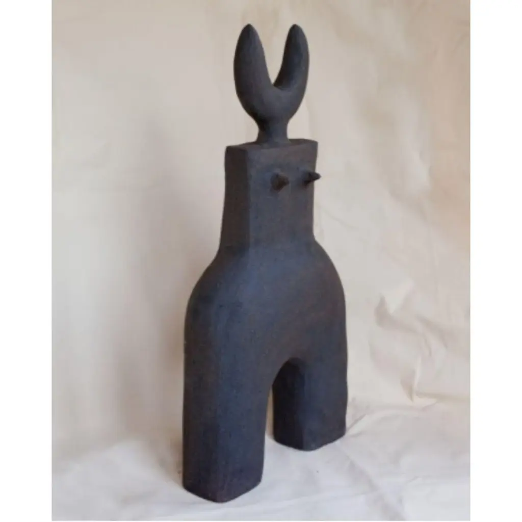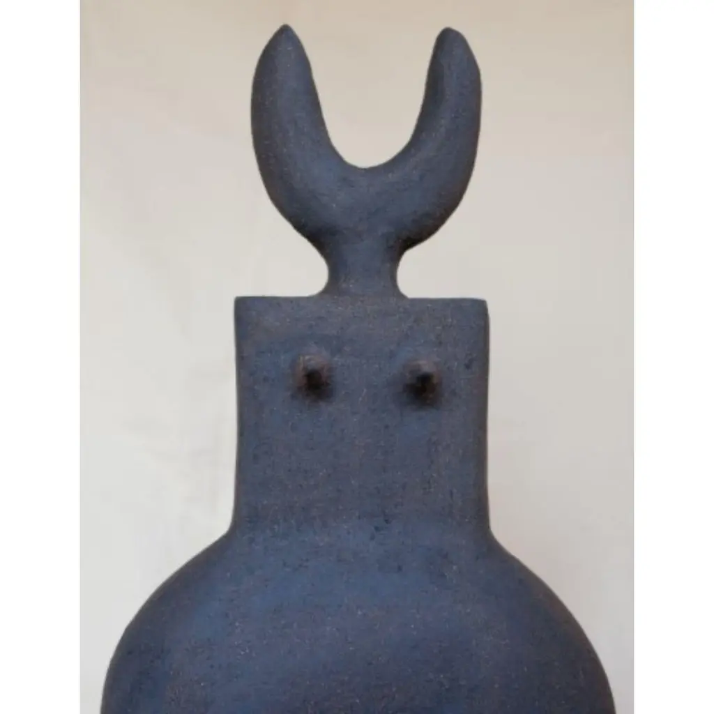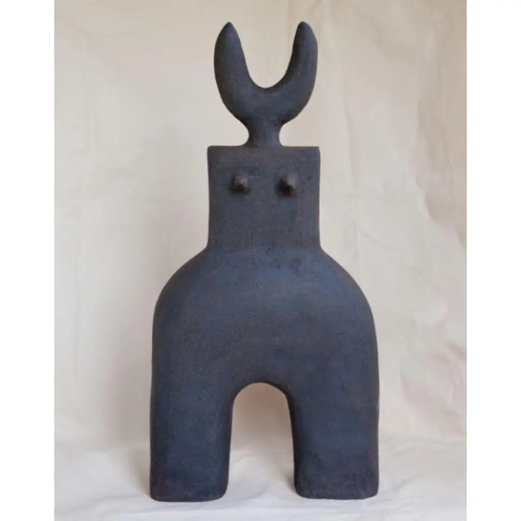 Haniwa Warrior 11 Sculpture by Noe KuremotoMaterials: Black stoneware sculptureDimensions: D11 x W31 x H65 cm My interpretation of ancient clay figurine Haniwa.For years I was afraid to become an artist.Afraid to voice my honest view of the world.Afraid to sacrifice the security and comfort of my day job.Afraid to admit it was killing my soul.Afraid of confrontation.So I stayed agreeable - to avoid it, at all costs.I did it long enough that I could no longer hear my own voice -the voice that said what I really want to do is make art.I kept quiet,so no one would know I was failing at my true calling.It became my deep, dark secret.I was too scared to lose that end of the month pay check.I’d tell myself – You have a mortgage, a family.A legitimate excuse, socially acceptable.But my soul grew weaker and weaker,the more I didn’t demand the best from myself.I became my worst self.Who could kill my own soul.This is how I came to make my Haniwa.I would like to share them with you.Especially you who are ready to take on your maximum challenge.One you’ve longed for in your heart, longer than you care to admit.Let us stand up, our souls united, stronger for taking this important true steptogether.All my strength to you.I salute you.- Noe Kuremoto 2021Noe Kuremoto is a ceramic artist who makes everything by hand using simple tools. She’s known for playful sculptural work that takes the form of functional wares. Her pieces mix child-like simplicity with contemporary sophistication, and incorporate her background in Fine Art and design with her cultural heritage. She shares the traditional Japanese view that sprits are everywhere, especially in nature – for Noe the truth of our universe can be found in wilderness. Her signature piece is a single flower vase - an ‘Ichirin Zashi’, which invites the sprit of nature into people’s homes in the simplest form possible. It’s representative of her desire to make a deeper connection in a world that can often feel shallow. “The single vase comes from my deep ocean of childhood memories, I hope every piece I make helps my sons to see the world as a beautiful place.” Her ceramics are like a beautiful dream that her hands, fire and clay turn into reality. Noe was born in Osaka Japan, and graduated in Fine Art with First Class Honours from Central Saint Martins College of Art. She works and lives in London with her family, including sausage dog Lassie.