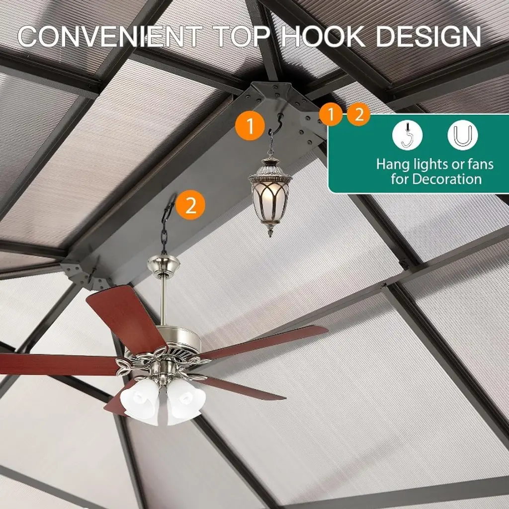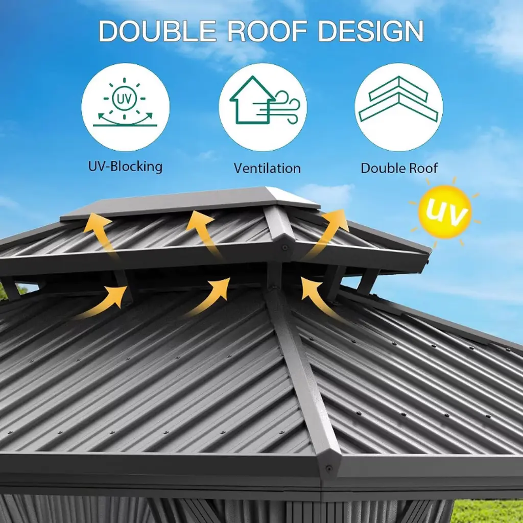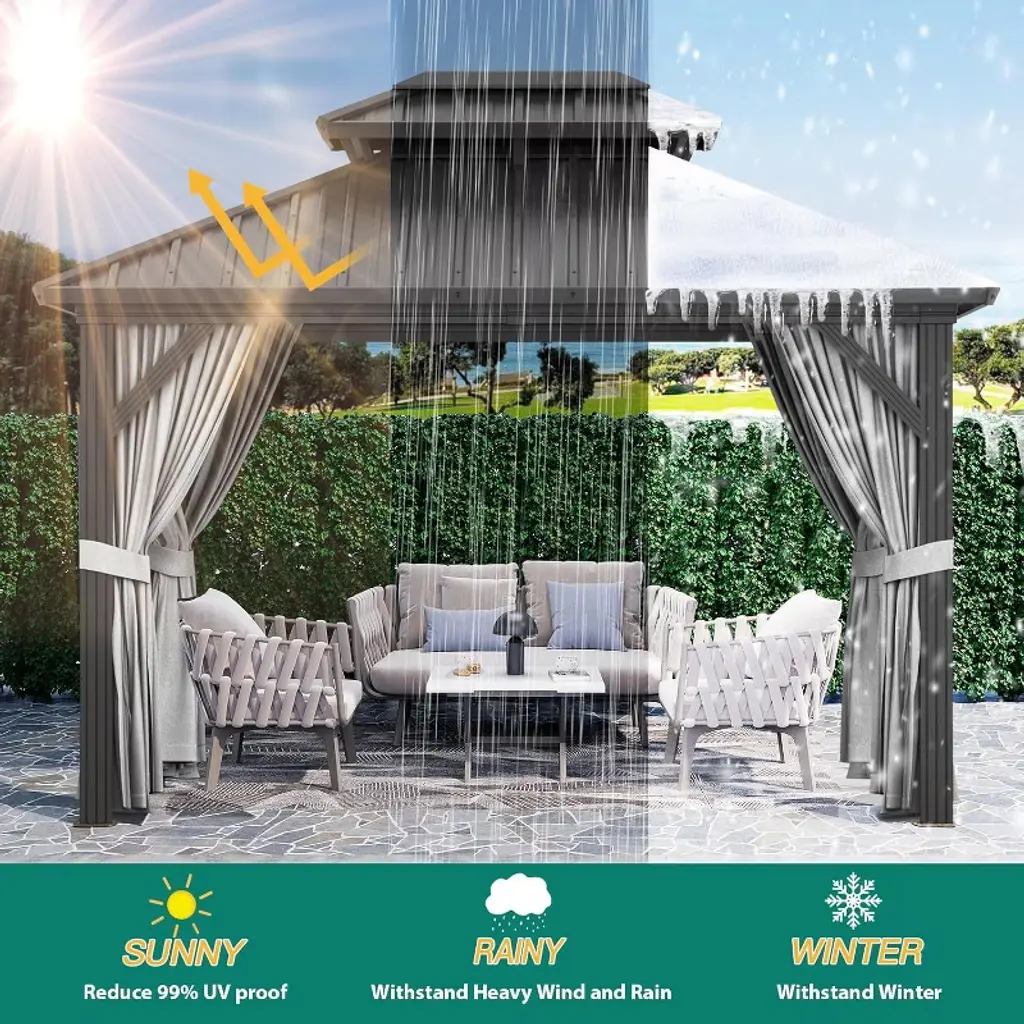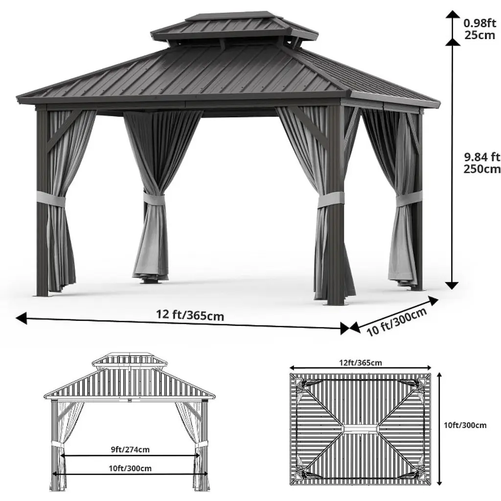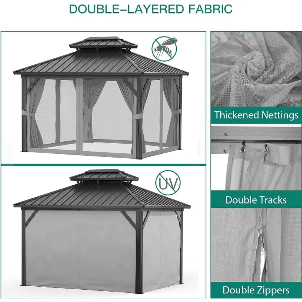 Introducing the Hardtop Gazebo 10x12FT, the perfect all-weather permanent pavilion designed to enhance your backyard, patio, or deck. Crafted with a durable aluminum alloy frame and a double metal roof, this gazebo offers exceptional strength and longevity. The galvanized sheet canopy ensures superior weather resistance, providing reliable protection against sun, rain, and wind throughout the seasons.Measuring 10x12 feet, this spacious gray canopy creates a comfortable outdoor shelter ideal for relaxing, entertaining, or dining. Its iron plate canopy and double top eaves design not only add to its sturdy construction but also improve ventilation and water runoff, keeping the area beneath dry and cool.Equipped with netting, the gazebo offers additional protection from insects, allowing you to enjoy the outdoors without disturbance. The metal frame canopy is engineered for durability and stability, making it a reliable carport cover or patio cover that withstands the elements.Key Features:- Robust aluminum alloy frame combined with iron plate canopy for enhanced durability- Double metal roof with galvanized sheets for excellent weather resistance- Spacious 10x12 feet design in a stylish gray color to complement any outdoor setting- Double top eaves improve airflow and water drainage- Included netting provides insect protection for a comfortable outdoor experience- Versatile use as a backyard pavilion, patio cover, deck shelter, or carport cover- Designed to offer reliable sun protection and shelter from rain and windUpgrade your outdoor living space with this weather-resistant, durable, and stylish Hardtop Gazebo. Perfect for year-round use, it provides a safe and comfortable shelter that combines functionality with elegant design. Transform your backyard into a relaxing retreat or a lively gathering spot with this premium aluminum frame canopy.
