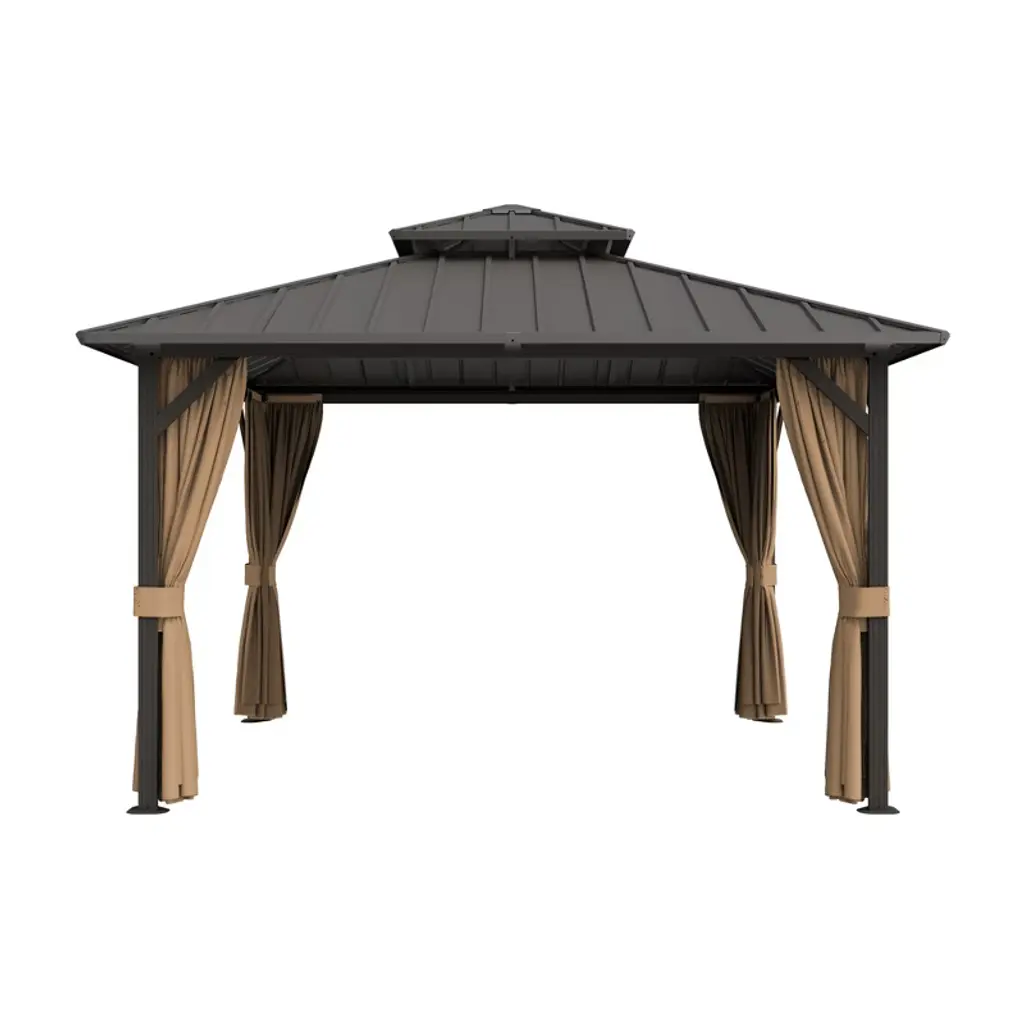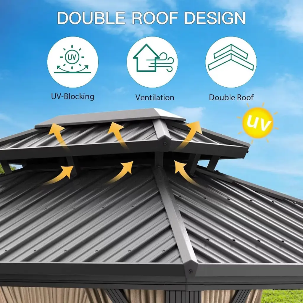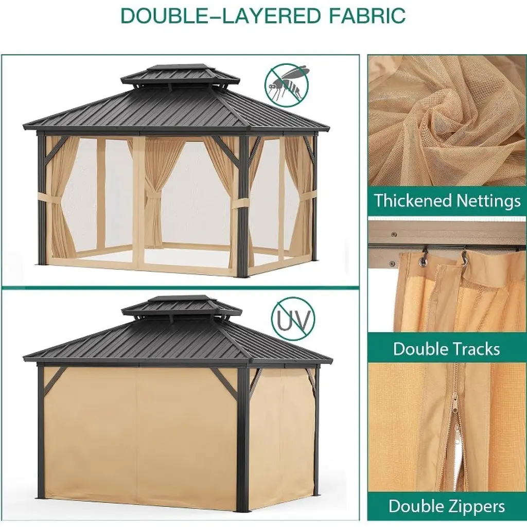 Introducing the Hardtop Gazebo 10x12FT, the ultimate outdoor shelter designed to elevate your backyard, patio, or deck experience. Crafted with a robust aluminum alloy frame, this canopy promises durability and long-lasting performance. The double metal roof design features a galvanized steel canopy with double top eaves, providing superior protection against rain, sun, and harsh weather conditions.Measuring 10x12 feet, this spacious pavilion offers ample room for gatherings, relaxation, or outdoor dining. The aluminum columns, beams, and corner top frames ensure a sturdy structure that withstands wind and weather, while the iron middle top frame adds extra reinforcement for stability.The canopy is covered with 180G waterproof polyester fabric, making it resistant to water and easy to clean. Included is a high-quality nylon mosquito net that keeps bugs at bay, allowing you to enjoy your outdoor space comfortably without interruptions.Key Features:- Durable Aluminum Alloy Frame: Lightweight yet strong, resistant to rust and corrosion.- Double Metal Roof with Eaves: Enhanced weather protection and ventilation.- Spacious 10x12FT Size: Perfect for family gatherings, parties, or quiet relaxation.- Waterproof 180G Polyester Fabric: Keeps you dry and shields from UV rays.- Nylon Mosquito Netting: Enjoy bug-free outdoor living.- Reinforced Structure: Aluminum columns, beams, corner frames, and iron middle frame for maximum stability.This all-weather permanent pavilion is designed to blend seamlessly with your outdoor décor while providing a reliable shelter year-round. Whether you're hosting a barbecue, enjoying a quiet afternoon, or protecting your outdoor furniture, the Hardtop Gazebo 10x12FT is your go-to solution for comfort and style. Upgrade your outdoor living space today with this versatile and sturdy canopy in an elegant khaki color.