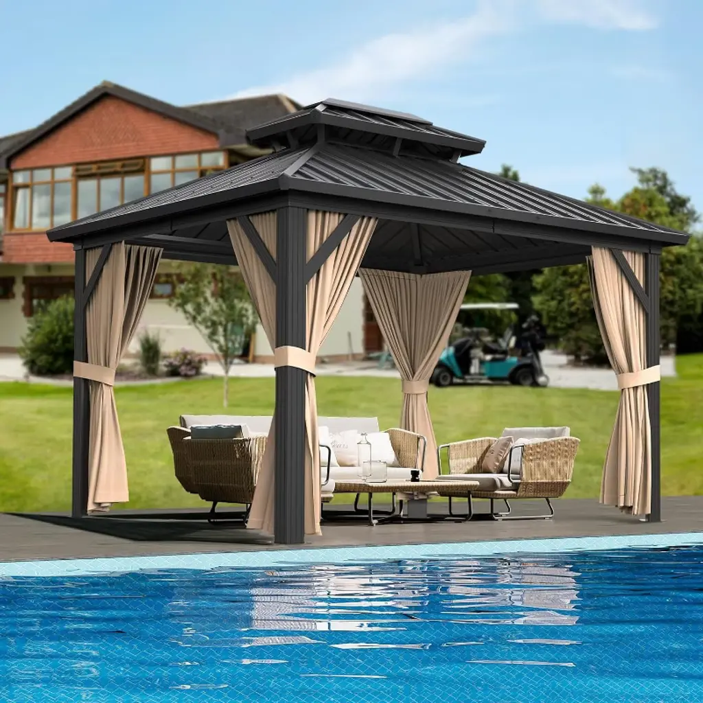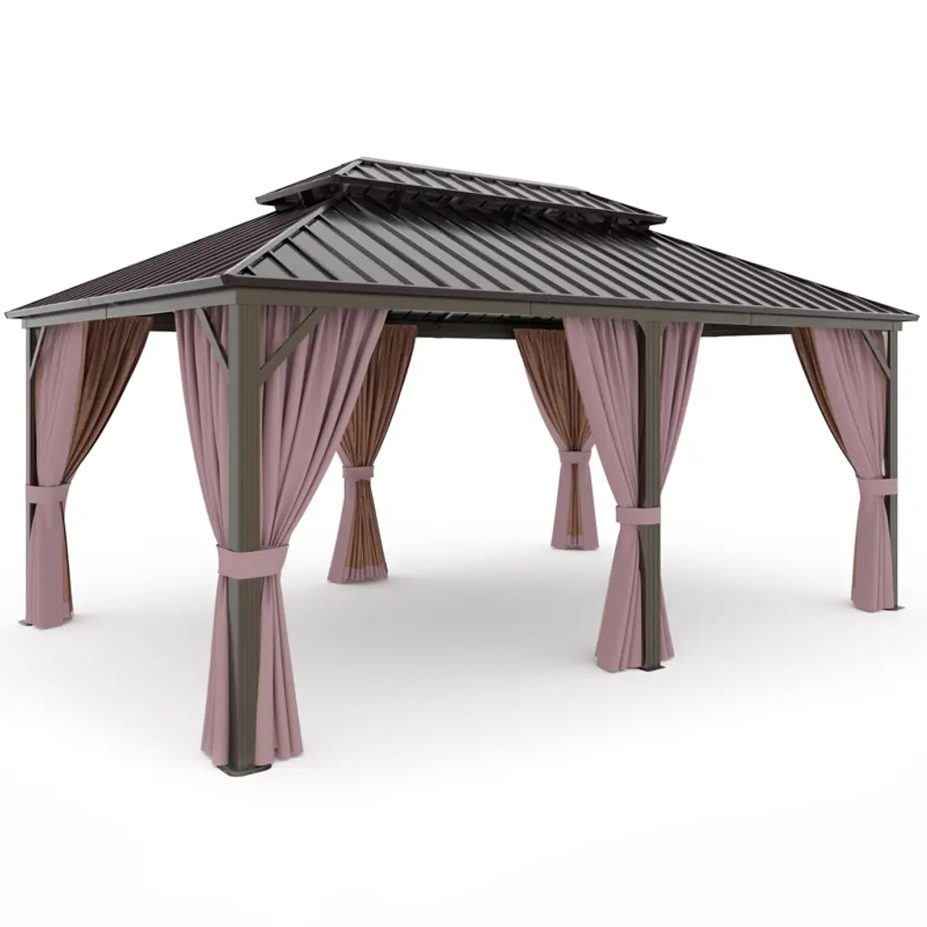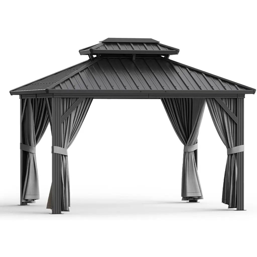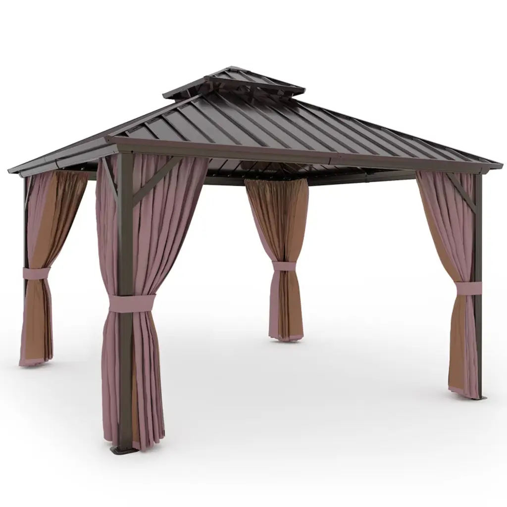 Introducing the Hardtop Gazebo 10x12FT, the ultimate outdoor shelter designed to elevate your backyard, patio, or deck experience. Crafted with a robust aluminum alloy frame, this canopy promises durability and long-lasting performance. The double metal roof design features a galvanized steel canopy with double top eaves, providing superior protection against rain, sun, and harsh weather conditions.Measuring 10x12 feet, this spacious pavilion offers ample room for gatherings, relaxation, or outdoor dining. The aluminum columns, beams, and corner top frames ensure a sturdy structure that withstands wind and weather, while the iron middle top frame adds extra reinforcement for stability.The canopy is covered with 180G waterproof polyester fabric, making it resistant to water and easy to clean. Included is a high-quality nylon mosquito net that keeps bugs at bay, allowing you to enjoy your outdoor space comfortably without interruptions.Key Features:- Durable Aluminum Alloy Frame: Lightweight yet strong, resistant to rust and corrosion.- Double Metal Roof with Eaves: Enhanced weather protection and ventilation.- Spacious 10x12FT Size: Perfect for family gatherings, parties, or quiet relaxation.- Waterproof 180G Polyester Fabric: Keeps you dry and shields from UV rays.- Nylon Mosquito Netting: Enjoy bug-free outdoor living.- Reinforced Structure: Aluminum columns, beams, corner frames, and iron middle frame for maximum stability.This all-weather permanent pavilion is designed to blend seamlessly with your outdoor décor while providing a reliable shelter year-round. Whether you're hosting a barbecue, enjoying a quiet afternoon, or protecting your outdoor furniture, the Hardtop Gazebo 10x12FT is your go-to solution for comfort and style. Upgrade your outdoor living space today with this versatile and sturdy canopy in an elegant khaki color.
