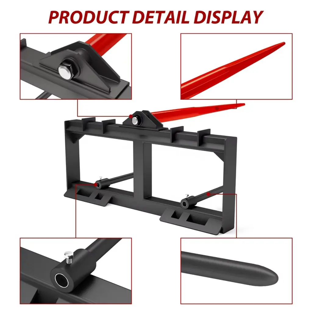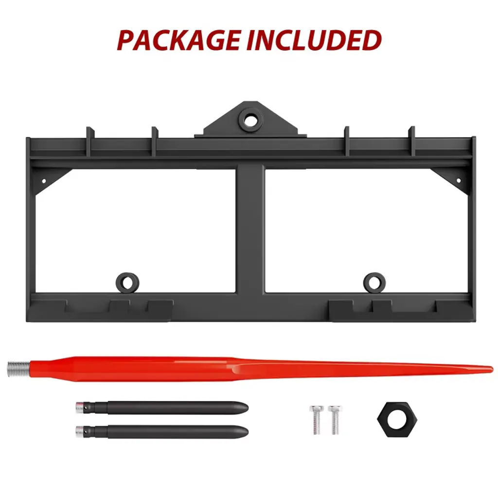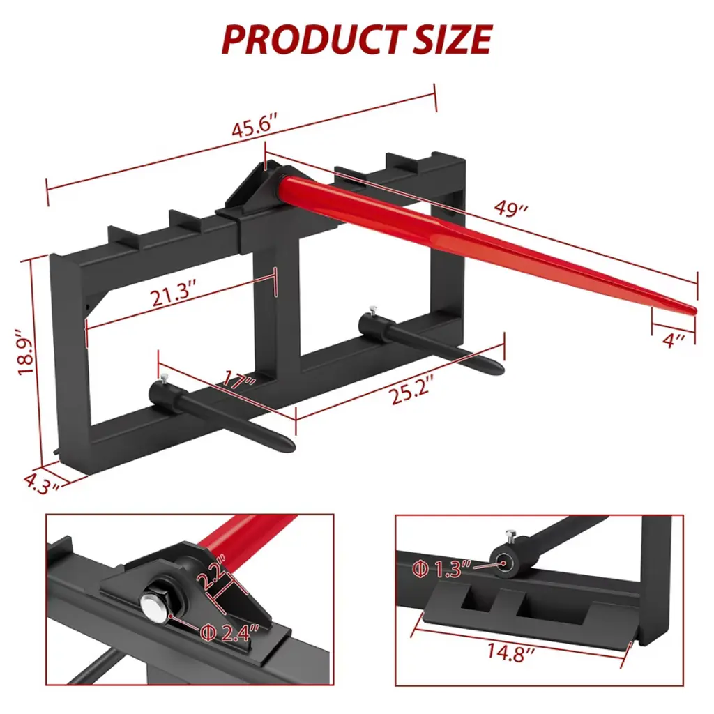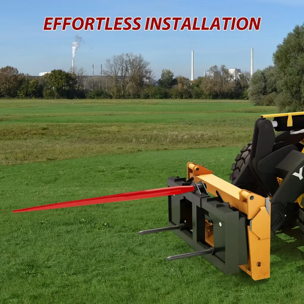 1.Heavy-Duty Steel for 3000lbs Loads Crafted from rugged heavy-duty steel, this 49" hay spear is built to handle demanding farm tasks with a 3000-pound loading capacity. Its robust construction resists bending, warping, and wear, ensuring long-lasting performance even when lifting and transporting large, dense hay bales¡ªideal for daily agricultural use. 2.Versatile Skid Steer Conversion Transform your skid steer loader into a multi-functional workhorse with this attachment. It streamlines hay handling, making it easier to lift, move, and stack bales, while also supporting other agricultural workloads. This versatility enhances efficiency, reducing the need for multiple tools and saving time on the farm. 3.Quick Attach for Easy Installation Designed with a quick attach system, the hay spear fits most tractors and skid steer loaders seamlessly. Installation is fast and hassle-free, requiring no complex tools¡ªso you can spend less time setting up and more time getting work done. Its user-friendly design ensures compatibility with standard quick attach setups. 4.Stable Handling with Stabilizer Spears Included with the main 49" spear are two 17" stabilizer spears, which provide extra support and balance when lifting heavy hay bales. This added stability prevents bales from shifting, tilting, or falling during transport, reducing the risk of accidents and ensuring secure handling¡ªeven with uneven or oversized loads. 5.Wide Compatibility Across Equipment Tailored to work with a range of agricultural machinery, including lawn mowers, skid steer loaders, and tractors, this hay spear is a versatile addition to any farm equipment collection. Whether you¡¯re managing a small homestead or a larger operation, it adapts to your tools, making hay handling more efficient across different setups.