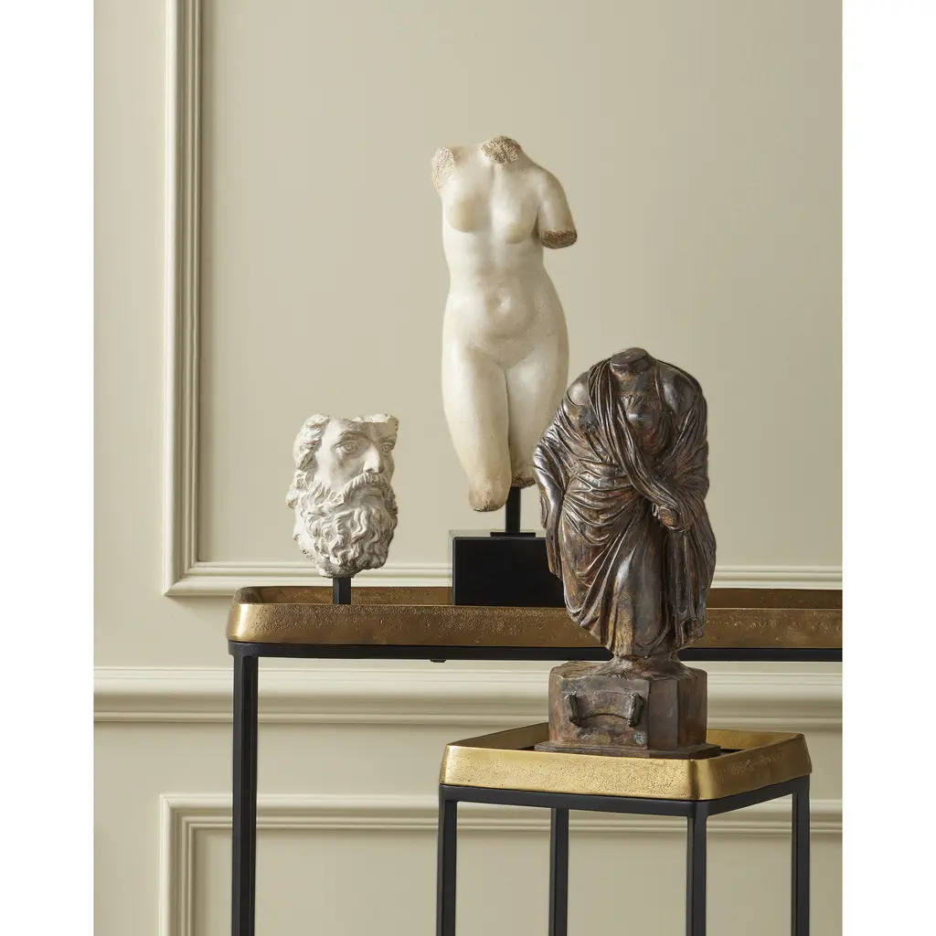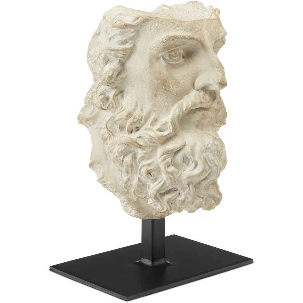 Made of composite in an aged beige finish with random spritzes of antiquing, the Head of Zeus masquerades as an artifact. The marble-like sculpture has two artisans to thank for its feeling of authenticity: the mold maker, who is central to the work; and the painter, who hand-paints the piece to create the illusion that it was unearthed after being carved ions ago. The white sculpture is mounted on a metal base in a black finish.