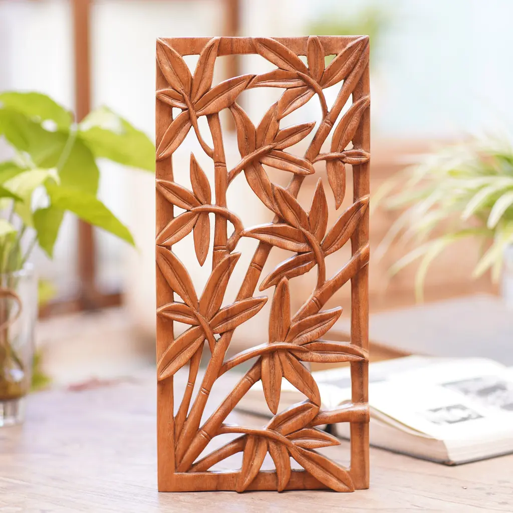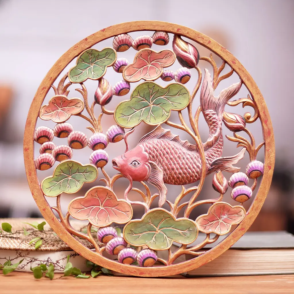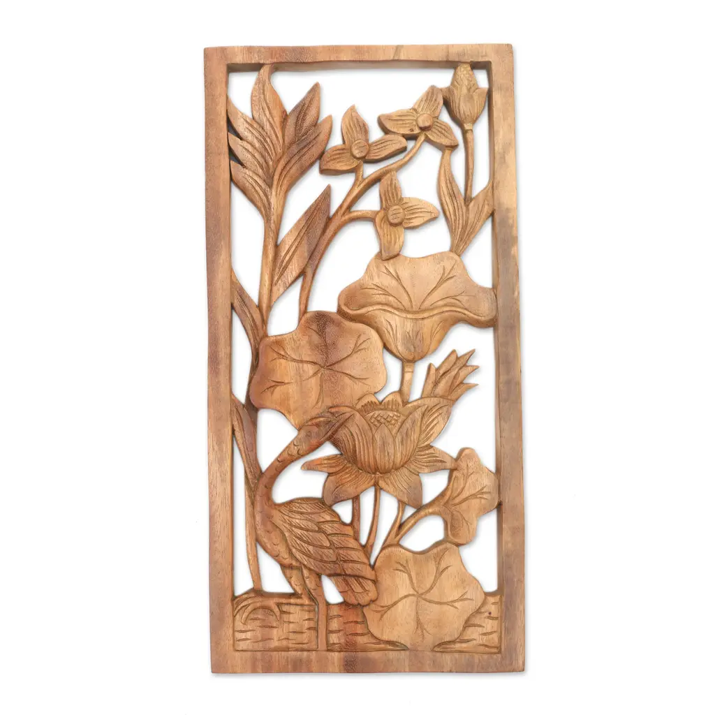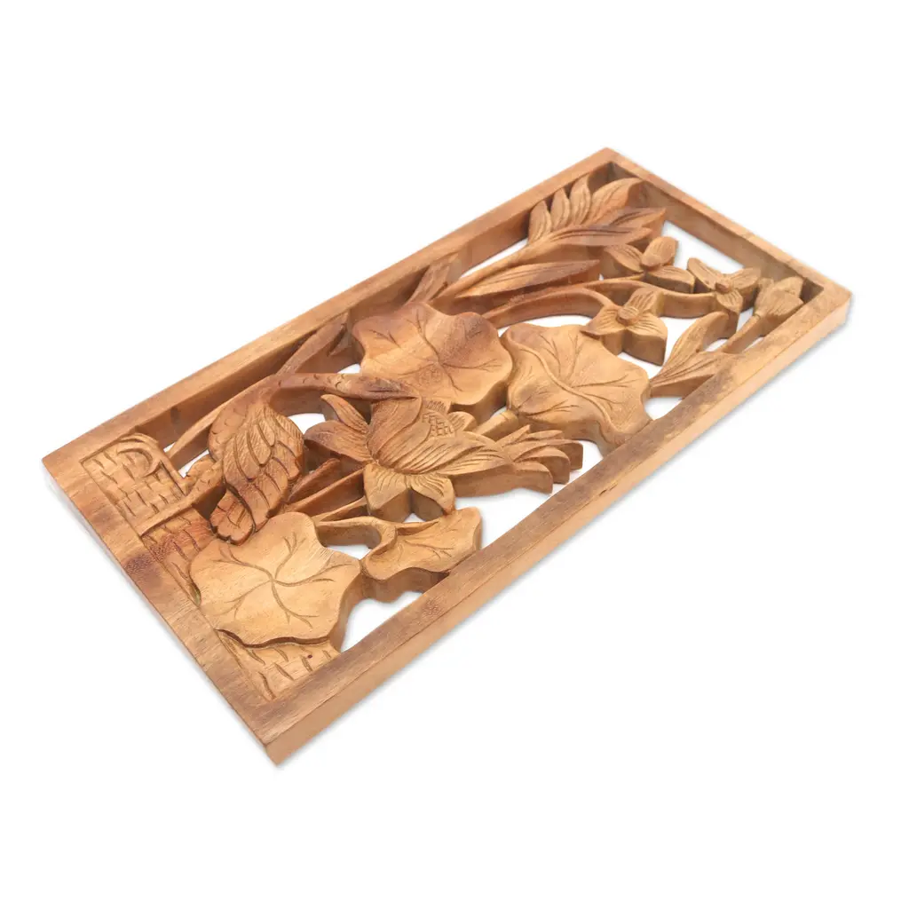 This lucky heron is surrounded by luscious lilies and lotuses in a wall panel of sumptuous artistry. Luh Mas Sri Pertamiari takes pride in presenting this captivating wall sculpture, carved by hand of seasoned suar wood with exquisite detail.