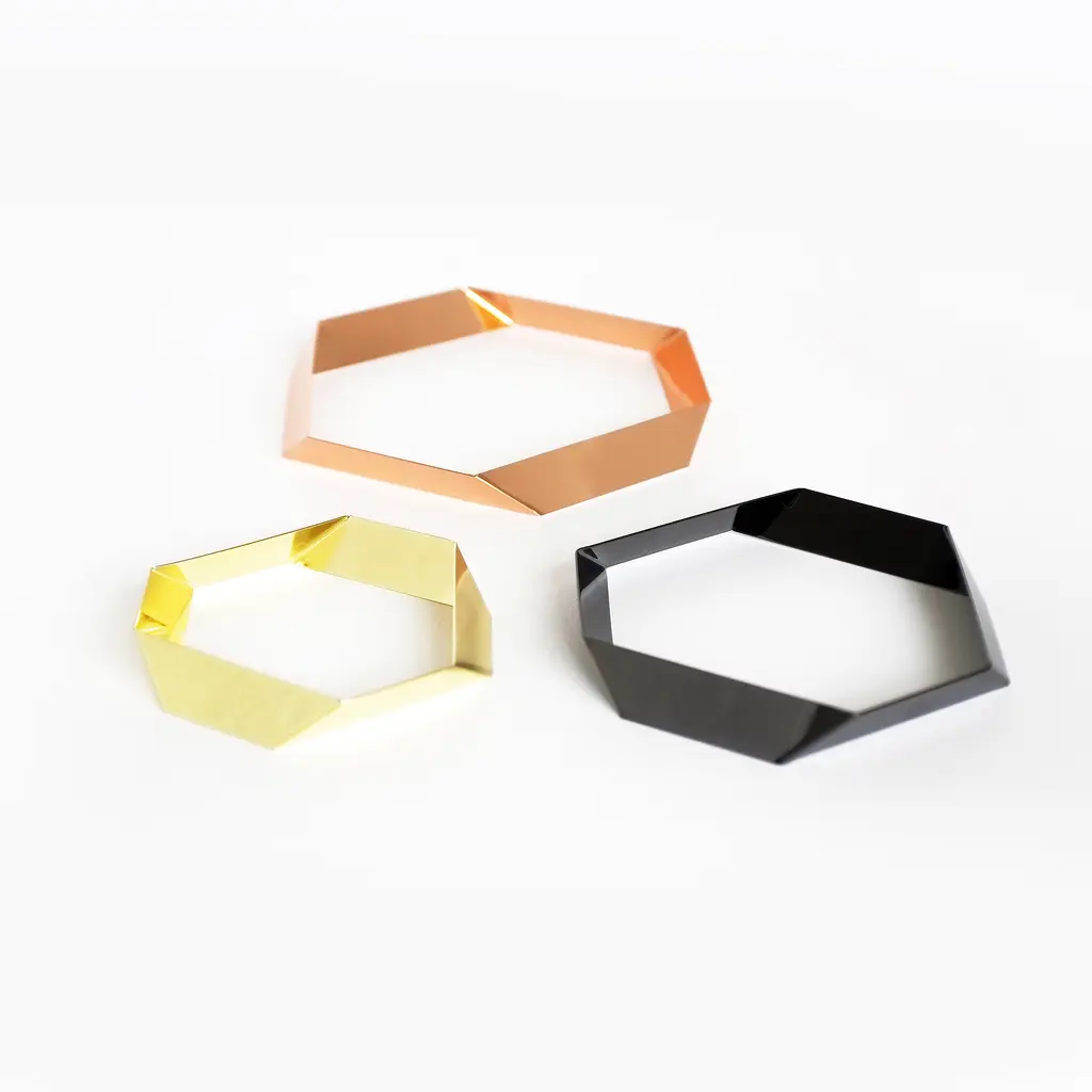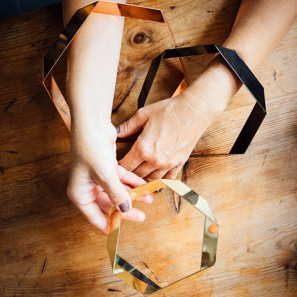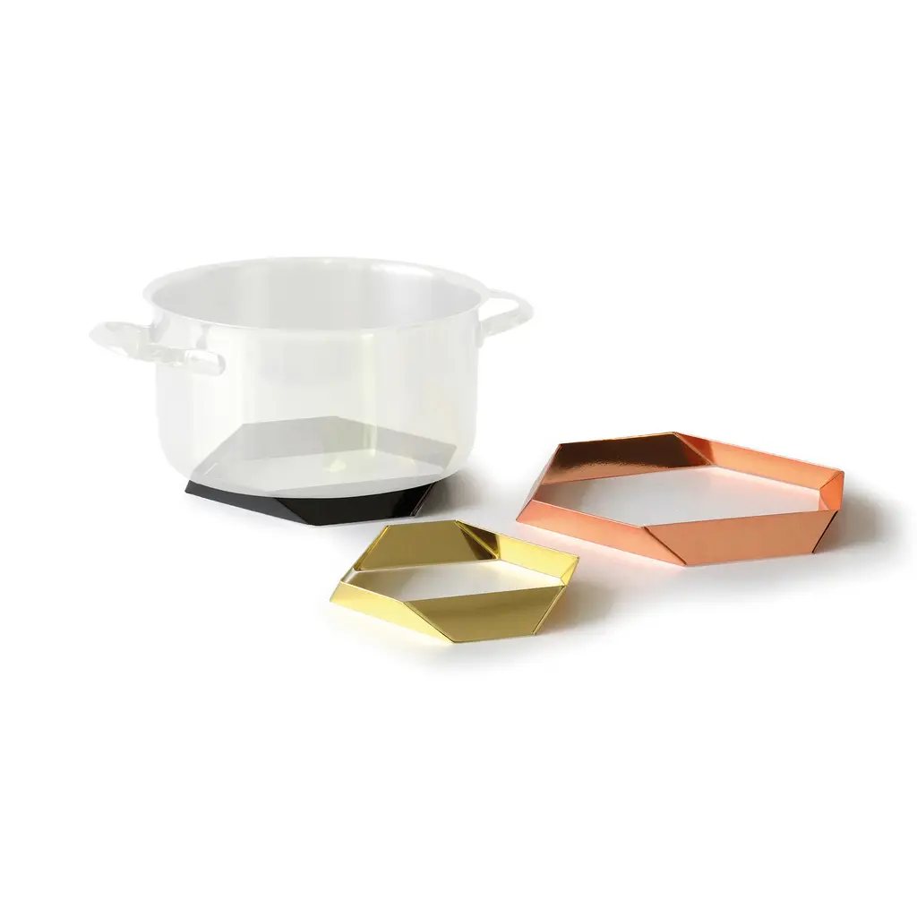 Polished metal strips are expertly folded and transformed into prismatic objects. When arranged one inside the other, HEXAGON becomes a floral table sculpture, while each individual element serves perfectly as a trivet for pots of various common diameters. The robust, galvanized surface is available in elegant brass, copper, and vintage finishes, adding a touch of sophistication to any table setting. A+H FOREIGN AFFAIRS is a carefully curated selection of products designed by Jörg Adam and Dominik Harborth for international labels.