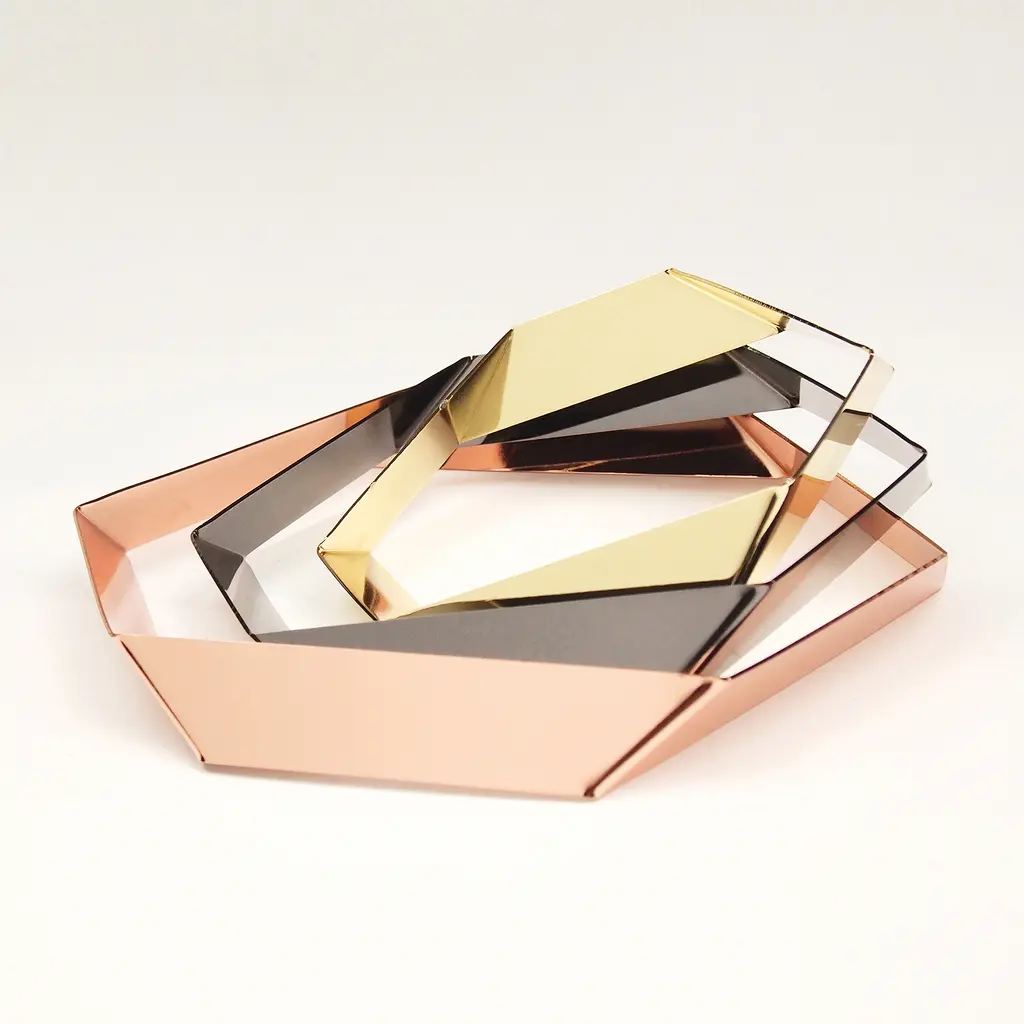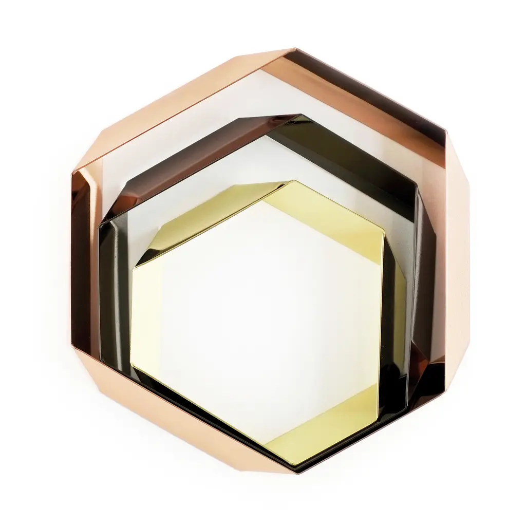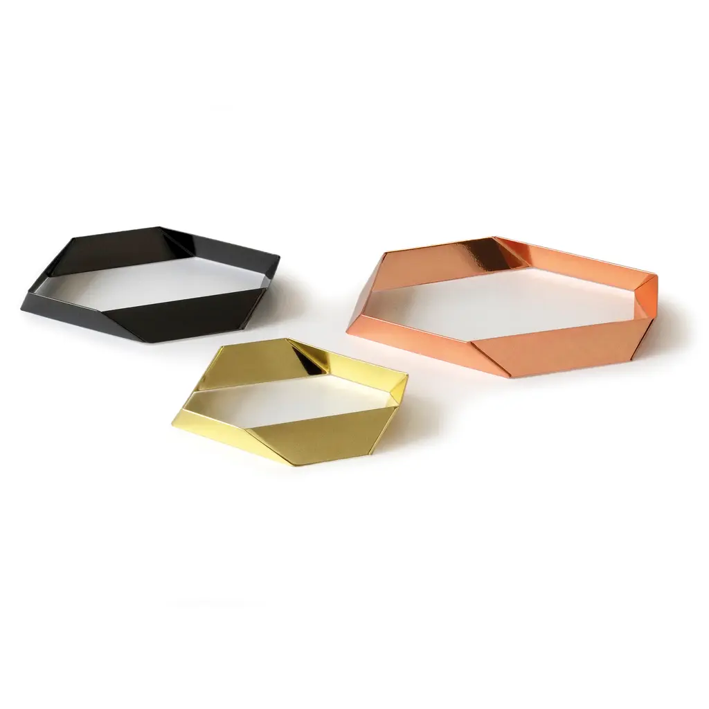 Polished metal strips are expertly folded and transformed into prismatic objects. When arranged one inside the other, HEXAGON becomes a floral table sculpture, while each individual element serves perfectly as a trivet for pots of various common diameters. The robust, galvanized surface is available in elegant brass, copper, and vintage finishes, adding a touch of sophistication to any table setting. A+H FOREIGN AFFAIRS is a carefully curated selection of products designed by Jörg Adam and Dominik Harborth for international labels.