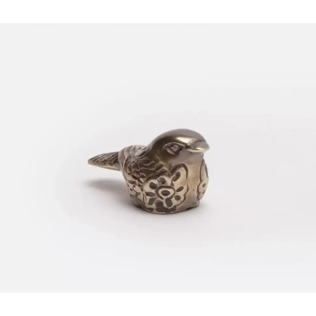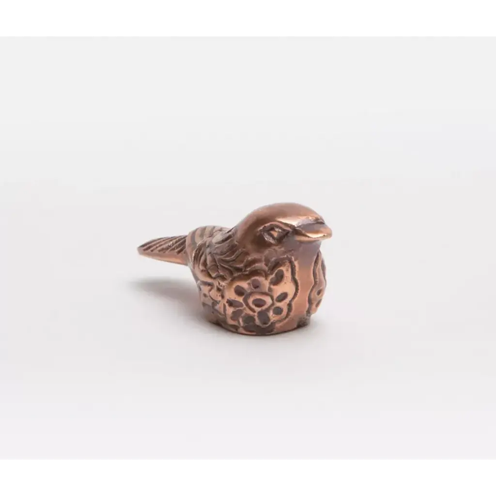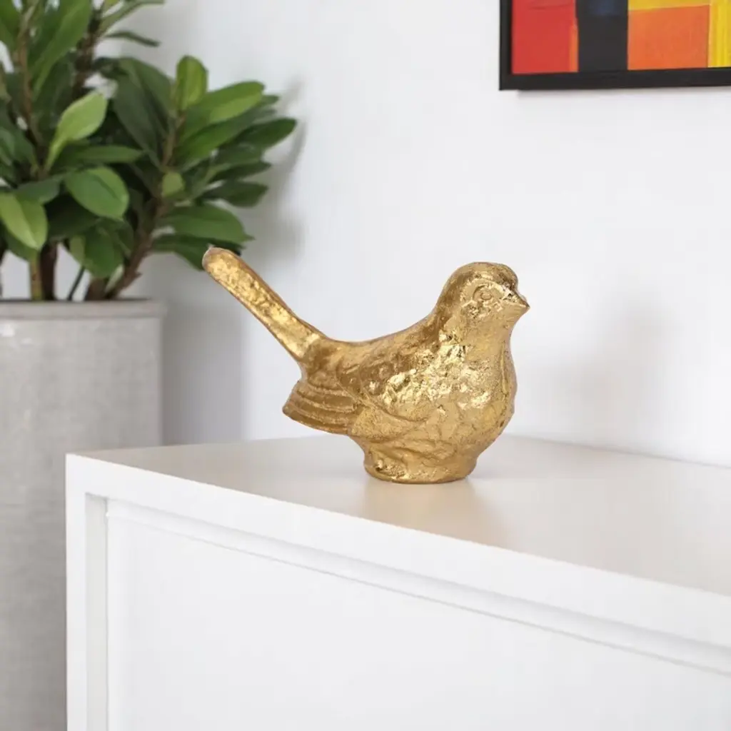 The 5-inch gold cast iron bird figurine is the perfect decorative accessory for your home. This pretty bird brings a touch of elegance and some outdoor beauty to your space. This nature inspired sculpture will be a great addition to your space. Great to use on its own or mix with other decorations for the perfect look. This handmade tabletop sculpture features a charming rustic style that enhances any decor. The finish is purposefully distressed to add character, making it an eye-catching piece for both collectors and casual decorators. 2.75-inch h x 4.5-inch w x 2-inch d.