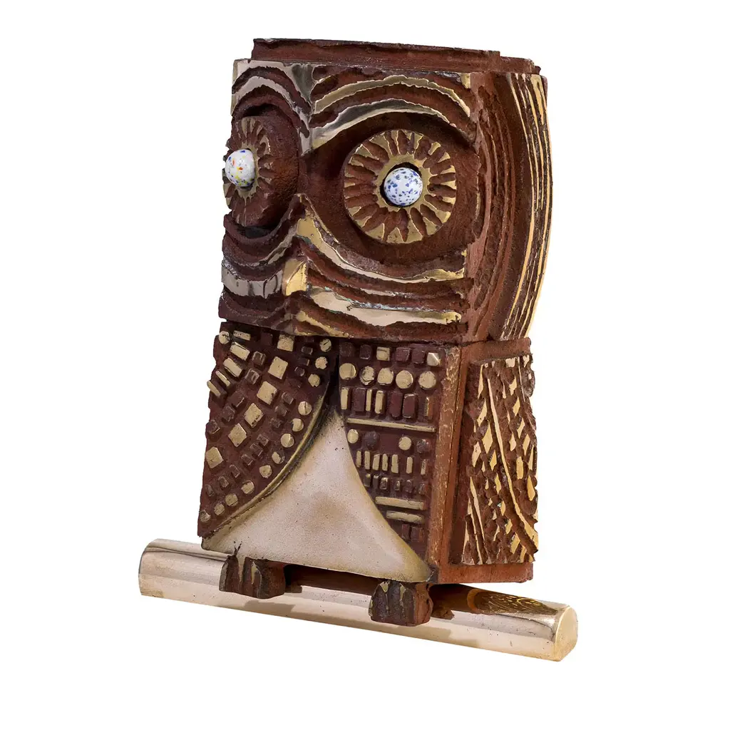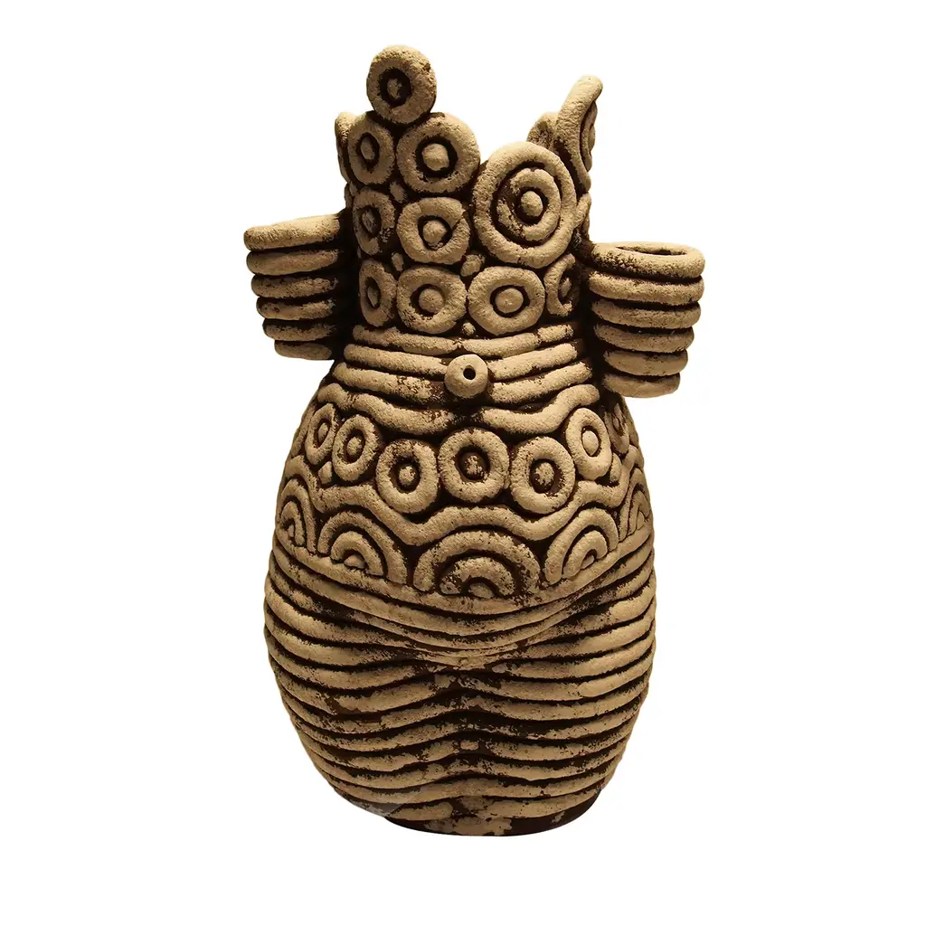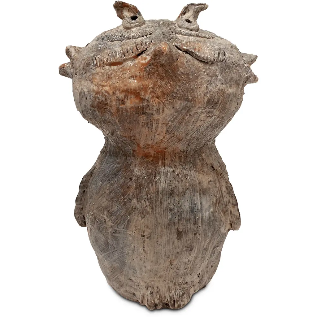 The Large Hoot Owl was created by Thai artist Arjan Deng, who is known for his one-of-a-kind ceramic statues of emotionally evocative characters. This is his interpretation of the wise animal, made of terracotta that is splattered with a reactive glaze to bring the sculpture a sizable dose of texture and character.