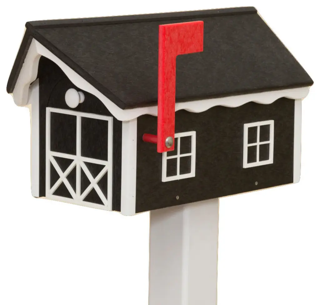 Amish handcraftedhorse barn mailboxweatherproof poly in multiple color combinations what a first impression and fantastic addition to your home''s curb appeal!manufactured at an old order amish homestead in lancaster pa, this mailbox is meticulously handcrafted from high density poly plastic to stand the test of time and use. Poly lumber is made of recycled high-density polyethylene materials. It resists splintering and rotting. No need for chemical weatherproofing treatments. It is also impervious to normal wood-destroying pests.bright and beautiful high quality poly plastic will last forever! Unlike mass-produced versions, these are individually handmade utilizing generational techniques and high quality materials. measures: 22"l x 11"w x12"h easy to install with pre-drilled mounting holes resists splintering and rotting durable, heavy-duty colorful poly plastic fade, rot & insect proof eco-friendly made from recycled plastic bottlesplease note: each is individually handmade-to-order by amish craftsmen guaranteeing you a unique, true one-of-a-kind piece.