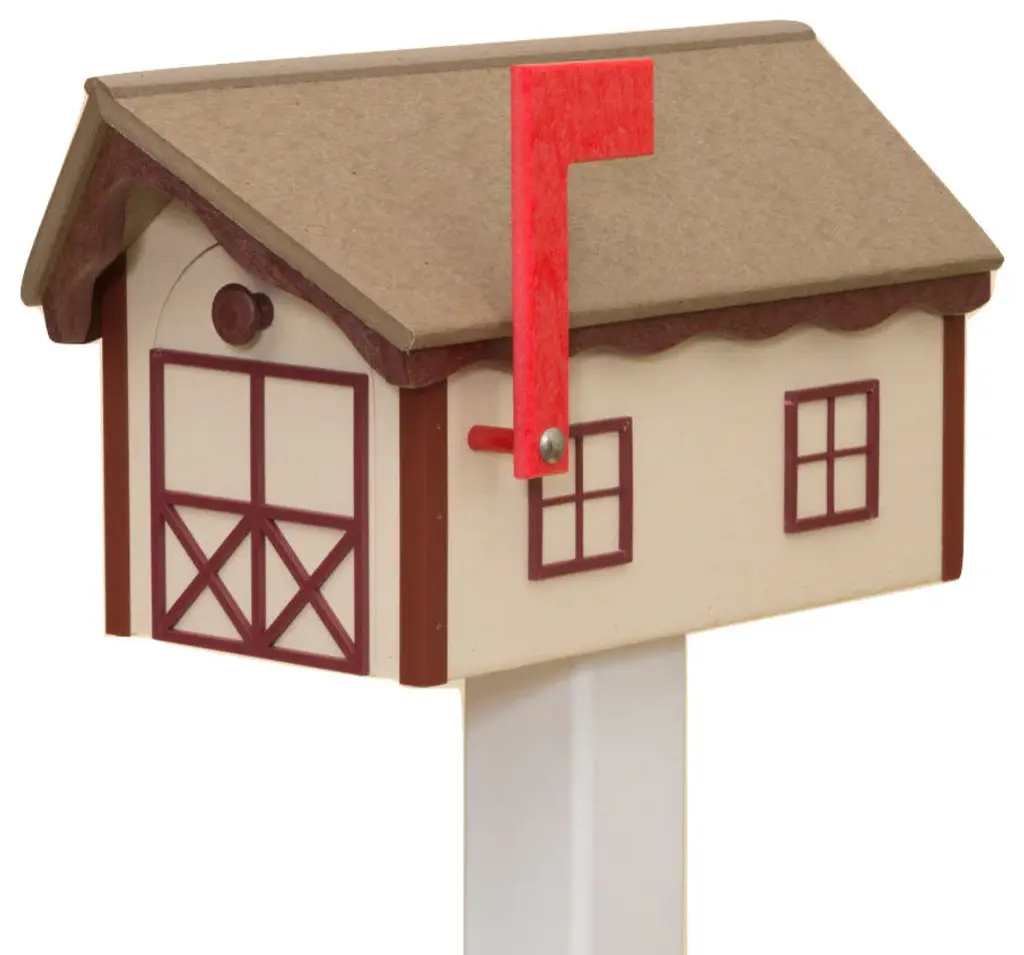 Amish handcraftedhorse barn mailboxweatherproof poly in multiple color combinations what a first impression and fantastic addition to your home''s curb appeal!manufactured at an old order amish homestead in lancaster pa, this mailbox is meticulously handcrafted from high density poly plastic to stand the test of time and use. Poly lumber is made of recycled high-density polyethylene materials. It resists splintering and rotting. No need for chemical weatherproofing treatments. It is also impervious to normal wood-destroying pests.bright and beautiful high quality poly plastic will last forever! Unlike mass-produced versions, these are individually handmade utilizing generational techniques and high quality materials. measures: 22"l x 11"w x12"h easy to install with pre-drilled mounting holes resists splintering and rotting durable, heavy-duty colorful poly plastic fade, rot & insect proof eco-friendly made from recycled plastic bottlesplease note: each is individually handmade-to-order by amish craftsmen guaranteeing you a unique, true one-of-a-kind piece.