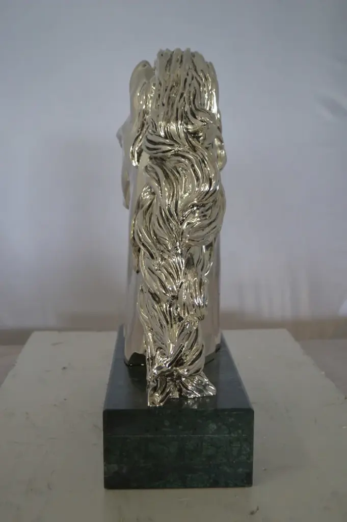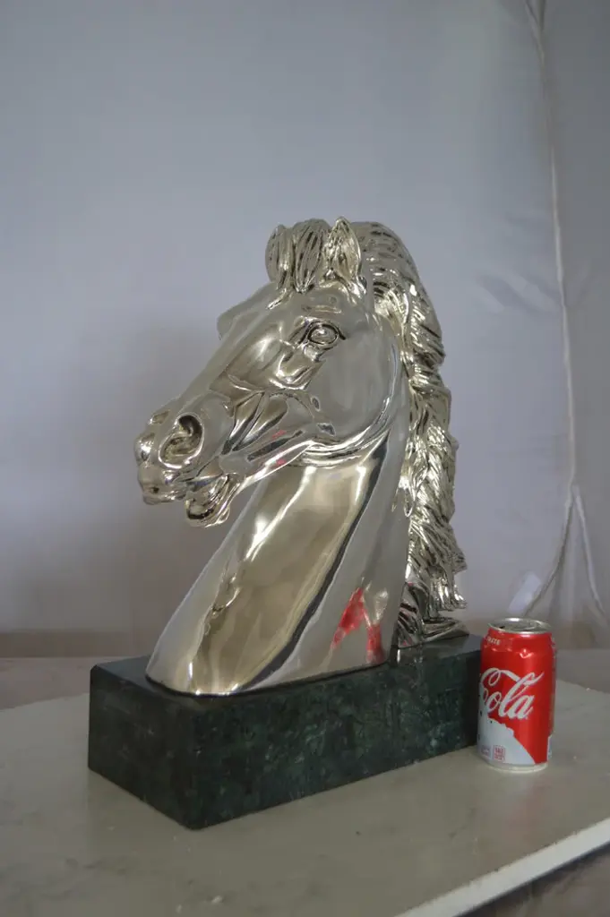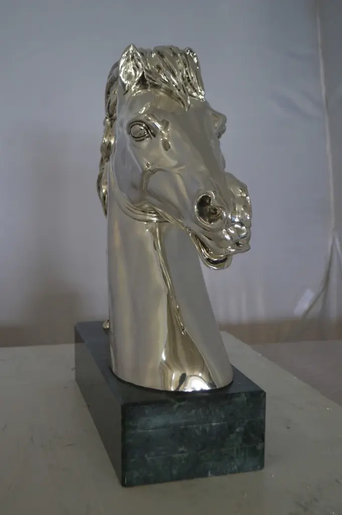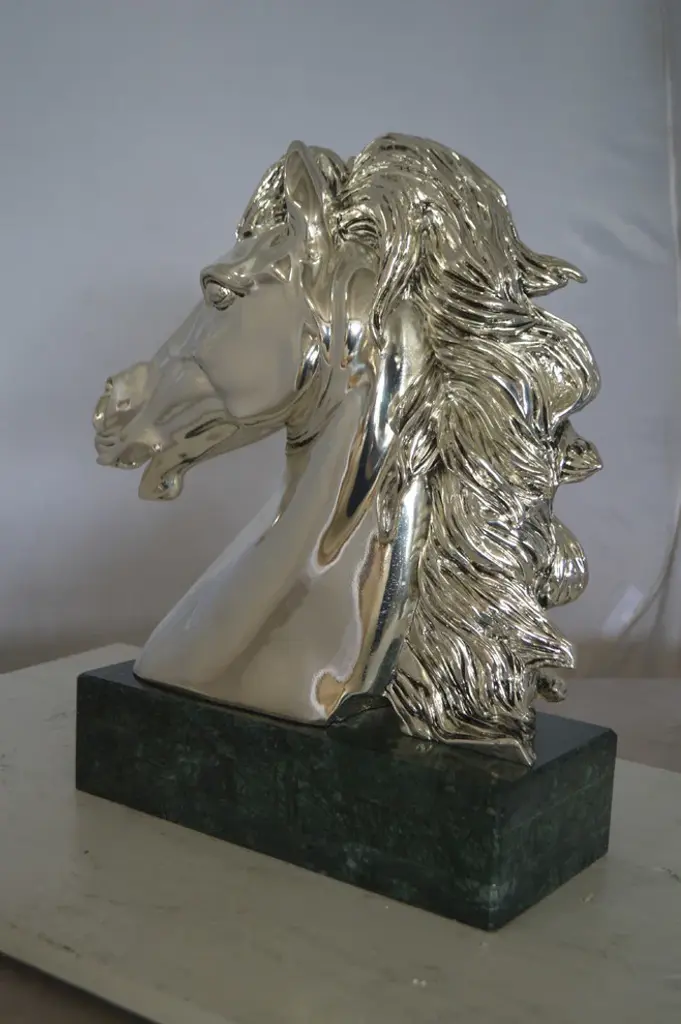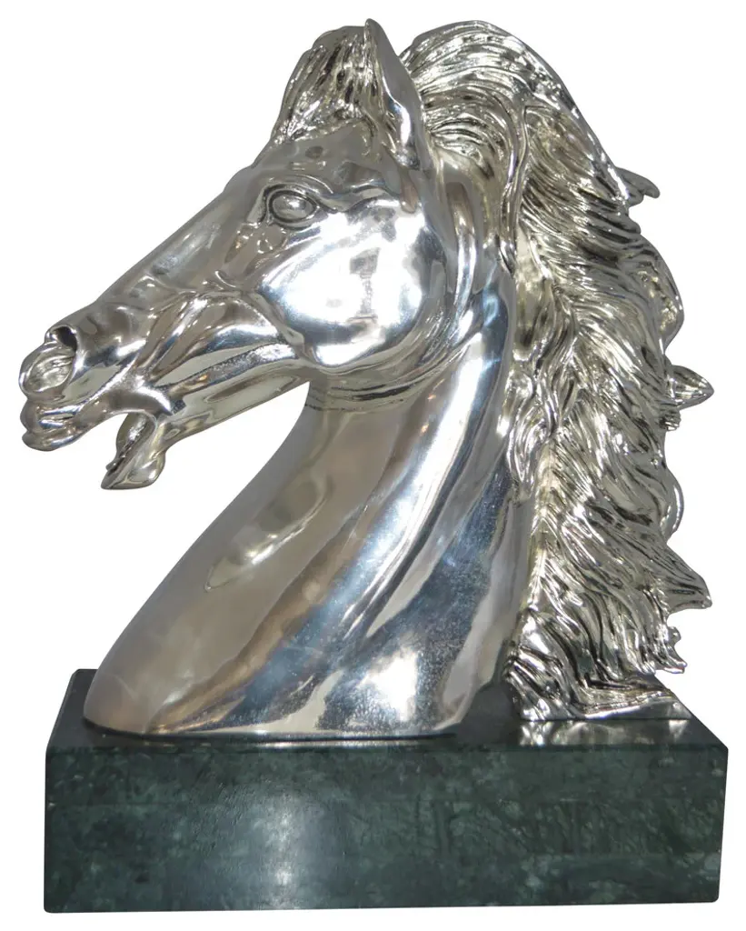 A beautiful Horse Bust, silver finish on a Large and heavy marble. This impressive statue will be a permanent fixture on the grounds of your estate for years to come. Size: 16"L x 7"W x 20"H. Weight is: 60Lb