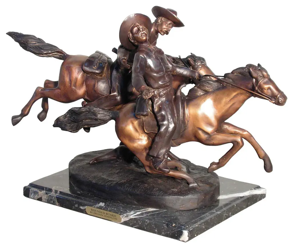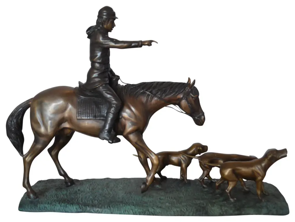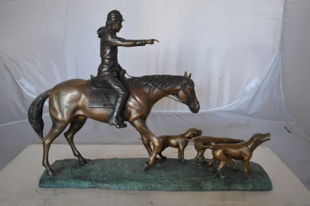 This bronze hunter on a horse is boldly commanding the dogs where to go This bronze statue includes multiple pieces on a bronze base. The base is covered in a patina, giving it a green color. This beautiful bronze statue is a perfect piece for any art enthusiast or anybody seeking to think back to a simpler time. Size: 27"L x 6"W x 18"H. Weight is: 22Lb