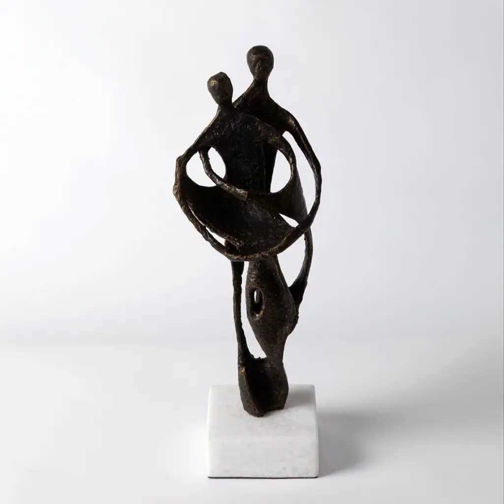 This solid iron sculpture portrays a loving embrace between a couple. Featuring a luxurious bronze finish and a white marble base, this sculpture brings a touch of love to any space.