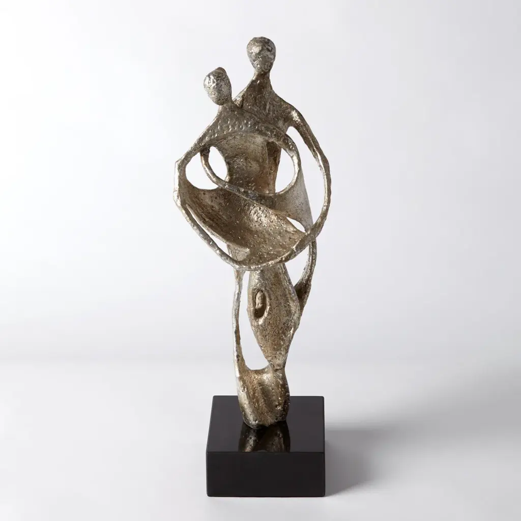 This solid iron sculpture portrays a loving embrace between a couple. Featuring a luxurious silver leaf finish and a black marble base, this sculpture brings a touch of love to any space.