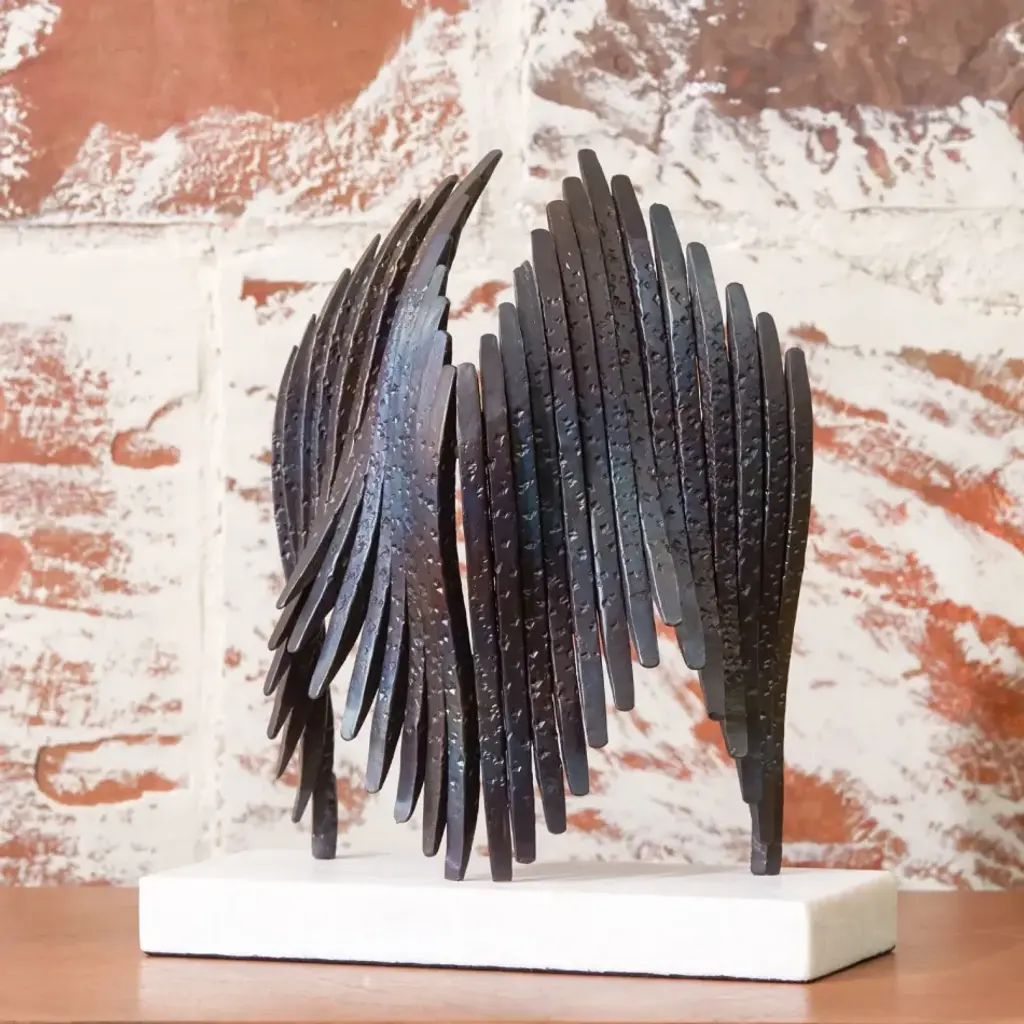 Robust yet delicately constructed, our iron Icarus winged sculpture sits on a block of white marble. Available in gold leaf and torched iron finishes. From a fashion forward perspective, Global Views offers accessories, furniture, statement lighting, and an assortment of rugs and mirrors to add beauty and joy to your home.