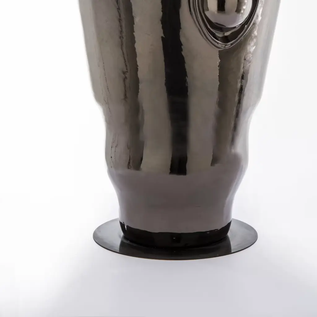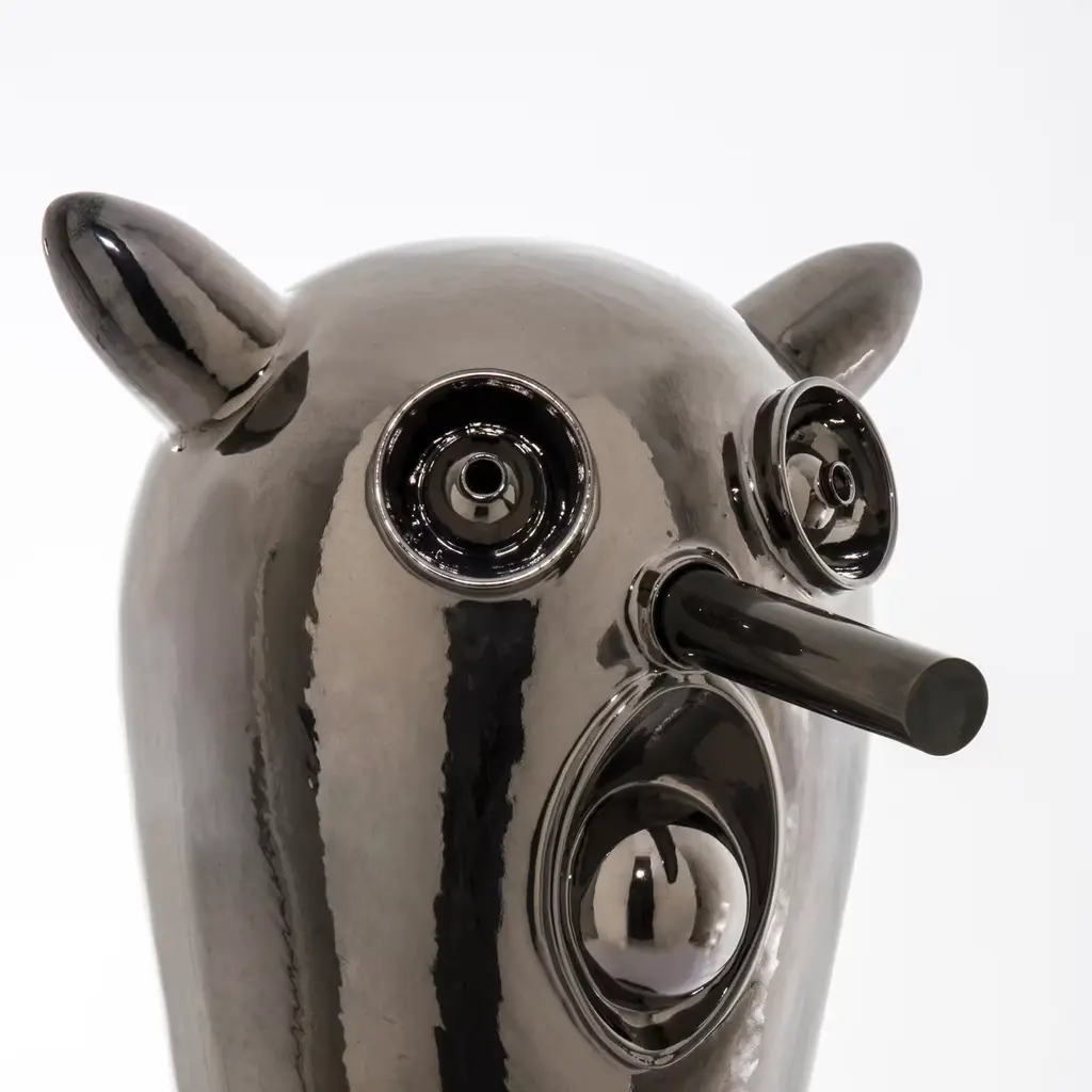 This unique sculpture adds personality to any home. The shape of this piece represents an animated head featuring a charming character with an elongated nose, two ears, and deeply set eyes. This object is crafted in ceramic with a bronze glaze, and the nose is in burnished brass, accessorized with an internal LED light which illuminates it from within.