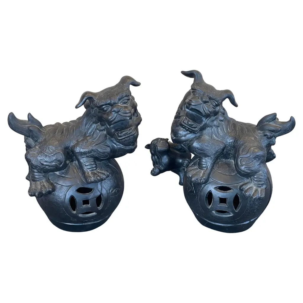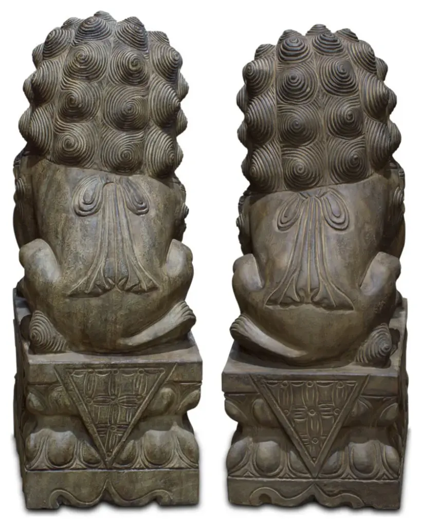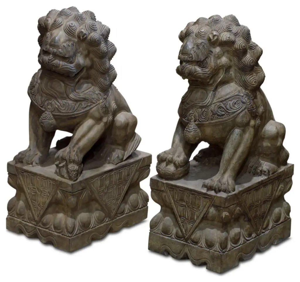 Always standing in pairs, Foo Dogs are fantasy lions in Chinese mythology who serve as guardians to prevent harmful things from happening to the family. This handsome pair is standing in commanding posture. The male, with a paw on a symbolic ball, protects the world, while the female, with a paw on a cub, protects the dwelling. A grand reproduction of the pair of Foo Dogs that guard the front gate of the Forbidden City in Beijing, China. Completely hand carved in stone. Each one is 9"x13"x24" and weighs approximately 150lbs. For indoor or outdoor use. Sold as a pair.This item will be shipped from Westmont, IL 60559 U.S.A Use: Decorative Piece/Statue Material: Stone Color: Stone Gray Make: Hand-sculpted, Hand-carved Origin: China Dimensions: W 9"/ D 13"/H 24" Weight: 350 lb each Attributes: 2 Piece Set, Stone, Animals, Dogs, Fantasy, Religious and Spiritual, Garden Statues and Decorative Objects Freestanding
