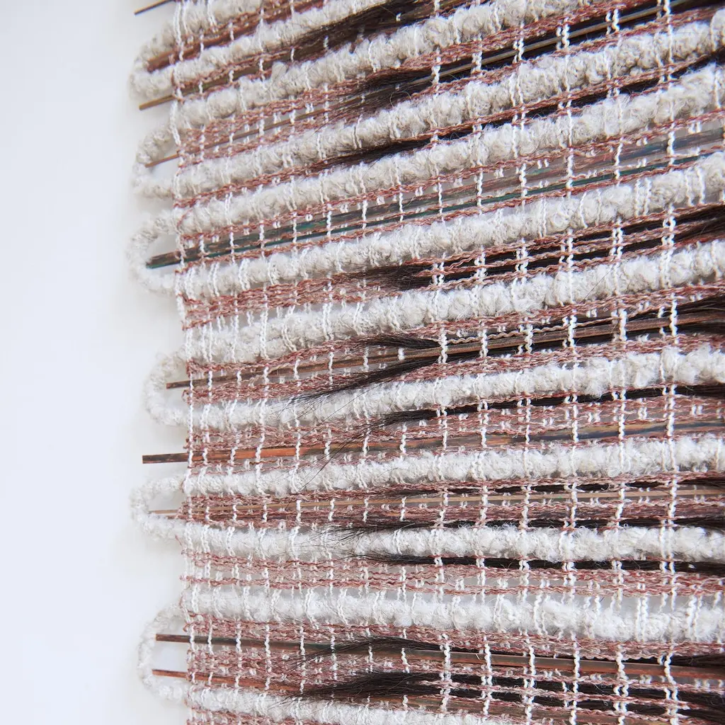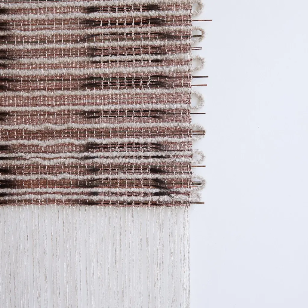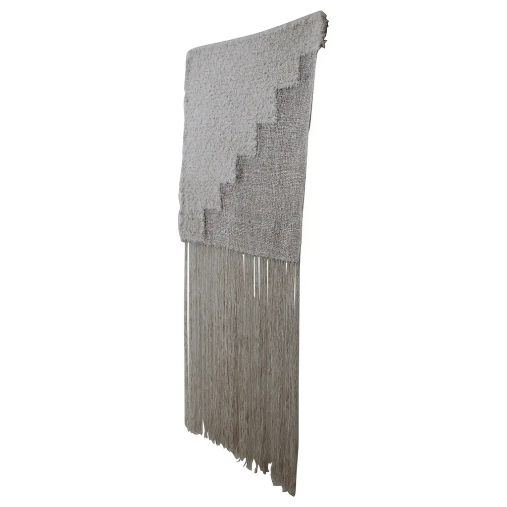 In Between #2 Wall Sculpture by Delphine CobbaertDimensions: W 100 x H 207 cmMaterials: Wool, Linen, Jute, Painted wood, Horsehair. Delphine Cobbaert is a Belgian textile artist, designer and craftswoman. Her artistic journey began when graduating in textile design at KASK Royal Academy of Fine Arts, Ghent. Delphine masters the technique of weaving using her hands and with respect for tradition. Her production process is layered, allowing intuition to have an impact on the material and the shape. In this way she discovered and developed a self-expression in her art and design through the medium of textiles. Her work is characterized by a harmony of subtle, layered lines of fragile and rough textures, colors and natural materials. Creating inner security is the most important experience. This translates into a design that feels natural, without excess. "Textile is not just an understanding for me, but it is a way of dealing with the senses. Seeing (the light), hearing (vibration) and feeling (touch) are stimulated by textiles. In our daily lives we are constantly in contact with textiles in an unconscious way because it is embedded in our human lives in different ways. The way in which we, as an individual, react to this, determines a large part of our identity."