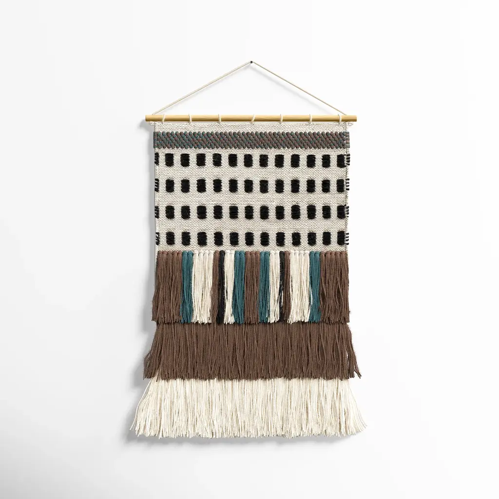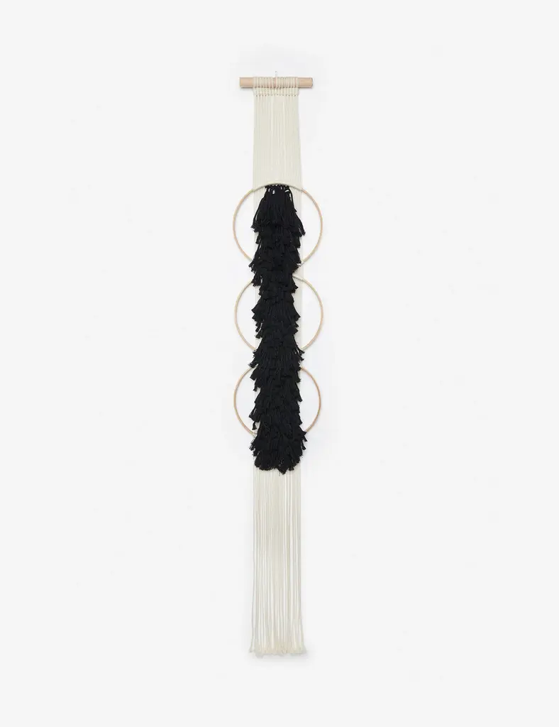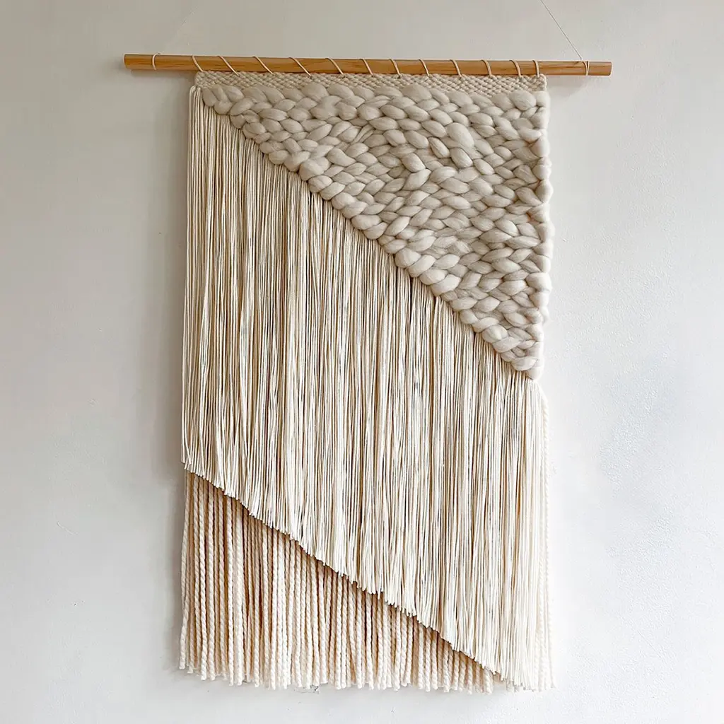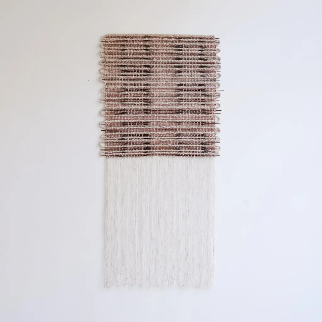 In Between #2 Wall Sculpture by Delphine CobbaertDimensions: W 100 x H 207 cmMaterials: Wool, Linen, Jute, Painted wood, Horsehair. Delphine Cobbaert is a Belgian textile artist, designer and craftswoman. Her artistic journey began when graduating in textile design at KASK Royal Academy of Fine Arts, Ghent. Delphine masters the technique of weaving using her hands and with respect for tradition. Her production process is layered, allowing intuition to have an impact on the material and the shape. In this way she discovered and developed a self-expression in her art and design through the medium of textiles. Her work is characterized by a harmony of subtle, layered lines of fragile and rough textures, colors and natural materials. Creating inner security is the most important experience. This translates into a design that feels natural, without excess. "Textile is not just an understanding for me, but it is a way of dealing with the senses. Seeing (the light), hearing (vibration) and feeling (touch) are stimulated by textiles. In our daily lives we are constantly in contact with textiles in an unconscious way because it is embedded in our human lives in different ways. The way in which we, as an individual, react to this, determines a large part of our identity."
