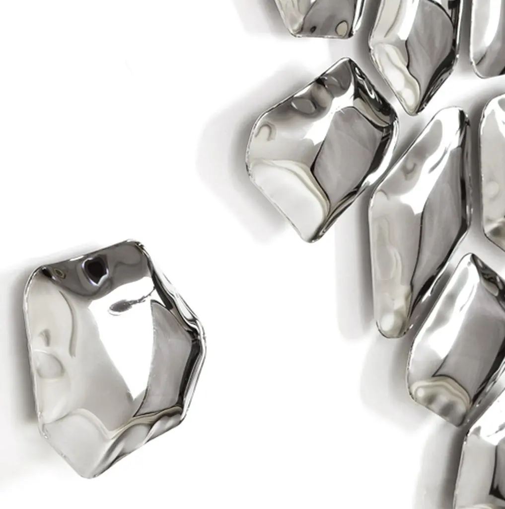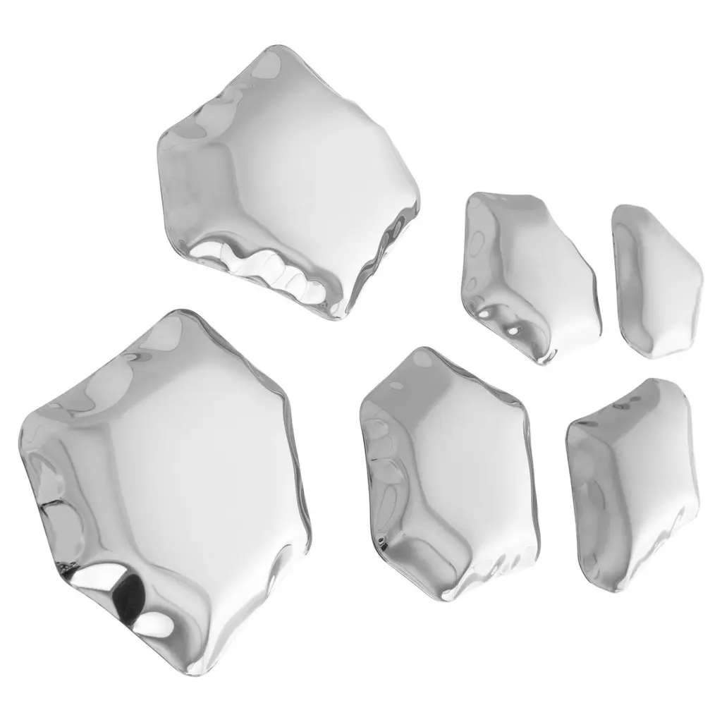 Kamyki is a series of wall hangers or decoration in unique but repeatable shapes. Kamyki are made of stainless steel polished to high gloss which gives them a very adorable look when mounted together to the wall to create a special pattern or design. They are often used to decorate the reception entrances, halls or bare and minimalistically structured walls inside or outside of the building. They have different diameters from 7 to 20 cm which can be easily adjusted according to the customer´s needs.Kamyki 6 set is available in carbon steel and stainless steel with the following finish options;Carbon steel:Cosmic blueStainless steel:PolishedEmeraldSapphireFlamed goldAbout the artist/ designer:Oskar Zieta - an architect, designer, artist and innovator. Born in 1975, after he graduated architecture at Szczecin University of Technology in 2000, he has got a scholarship at ETH Zurich. Over the course of 2 years of postgraduate studies he developed skills in parametric design and modern manufacturing technologies finalized with PhD graduation. Currently he runs the department of Industrial Design at School of Form. Laureate of many prestigious awards in design and technology. Inventor of FiDU - inner pressure metal forming technology - the keystone to Zieta Collection, Zieta Out of Ordinary as well as large scale sculptures like NAWA on Daliowa Island in Wroclaw and WIR in Galeria Pólnocna in Wroclaw.Ambassador of Warsaw Home & Contract Fair. Oskar Zieta has been awarded the AUDI - Mentor-Price 2011, the Red Dot Award 2008, DMY Award for Innovation in production process 2008, the YDMI 2008, the German Design Council Prize 2009, the Forum Aid Awards 2009, Technology Award Materialica 2009, MUST HAVE Design Lódz 2011 and was nominated to Mies Van Der Rohe Award 2019, the Schweizer Design Preis 2009 and the Dobry Wzór, 2009. His designs carved out their way into numerous prestigious collections including Centre Pompidou in Paris, the Pinakothek der Moderne in Munich, Zurich Design Museum and the Baden State Museum In Karlsruhe.Oskar Zieta is a CEO of Zieta Studio established in 2010 in Wroclaw. The company is an interdisciplinary team of architects, designers, engineers and technologists as well as production line and Industrial implementation workers. Specialists in many fields are permanent collaborators of Zieta Studio - psychologists, biologists, scientists and many others. FiDU Innovation Lab develops its own, innovative technologies of stabilizing sheet metal, i.e. FiDU and 3+ and their application to modern architecture, engineering and design.