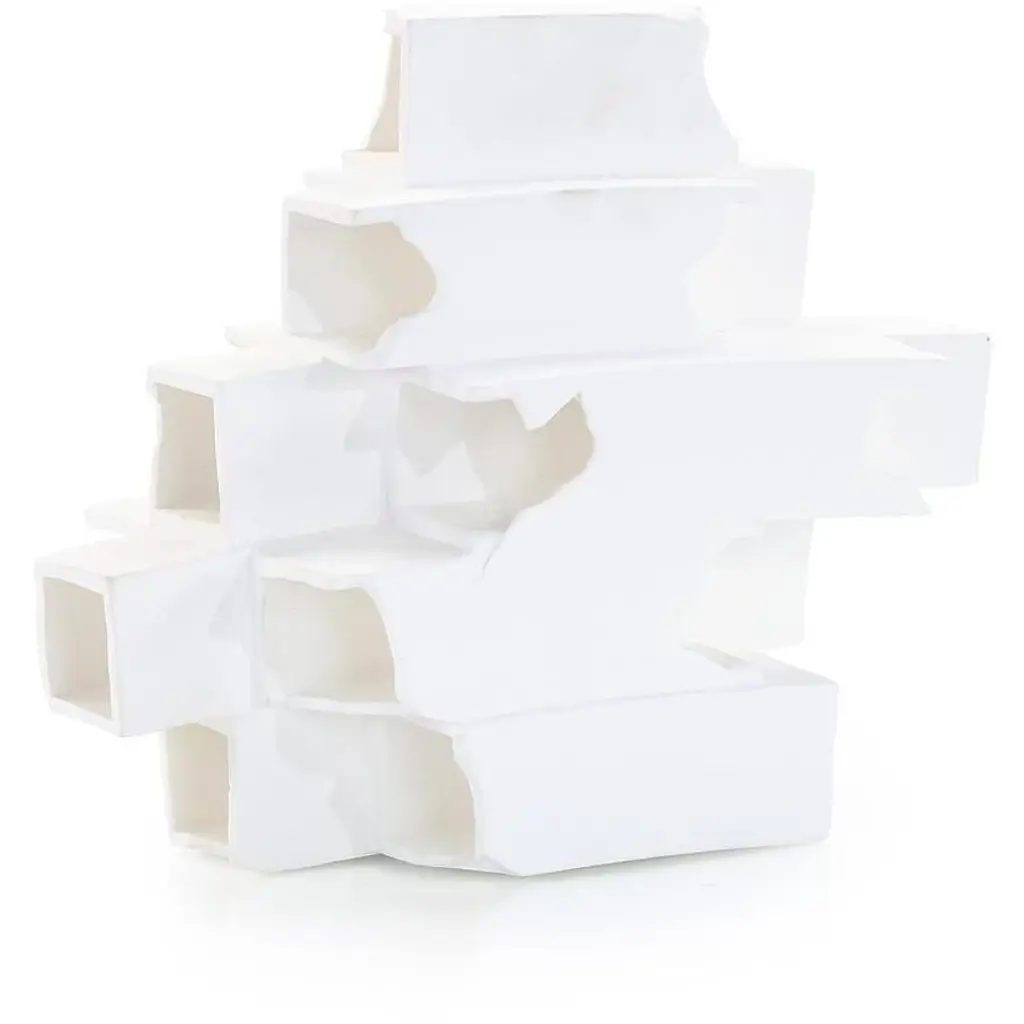 The Incline Sculpture is a stunning artistic accent that introduces an alluring sense of motion to any decor. Crafted from white porcelain, the piece displays a stylish arrangement of fragmented rectangular shapes. The rectangles are oriented in a slanted position, causing the entire piece to lean towards one side for a unique look.