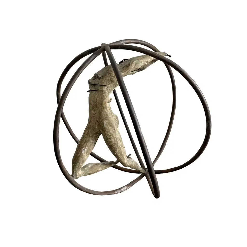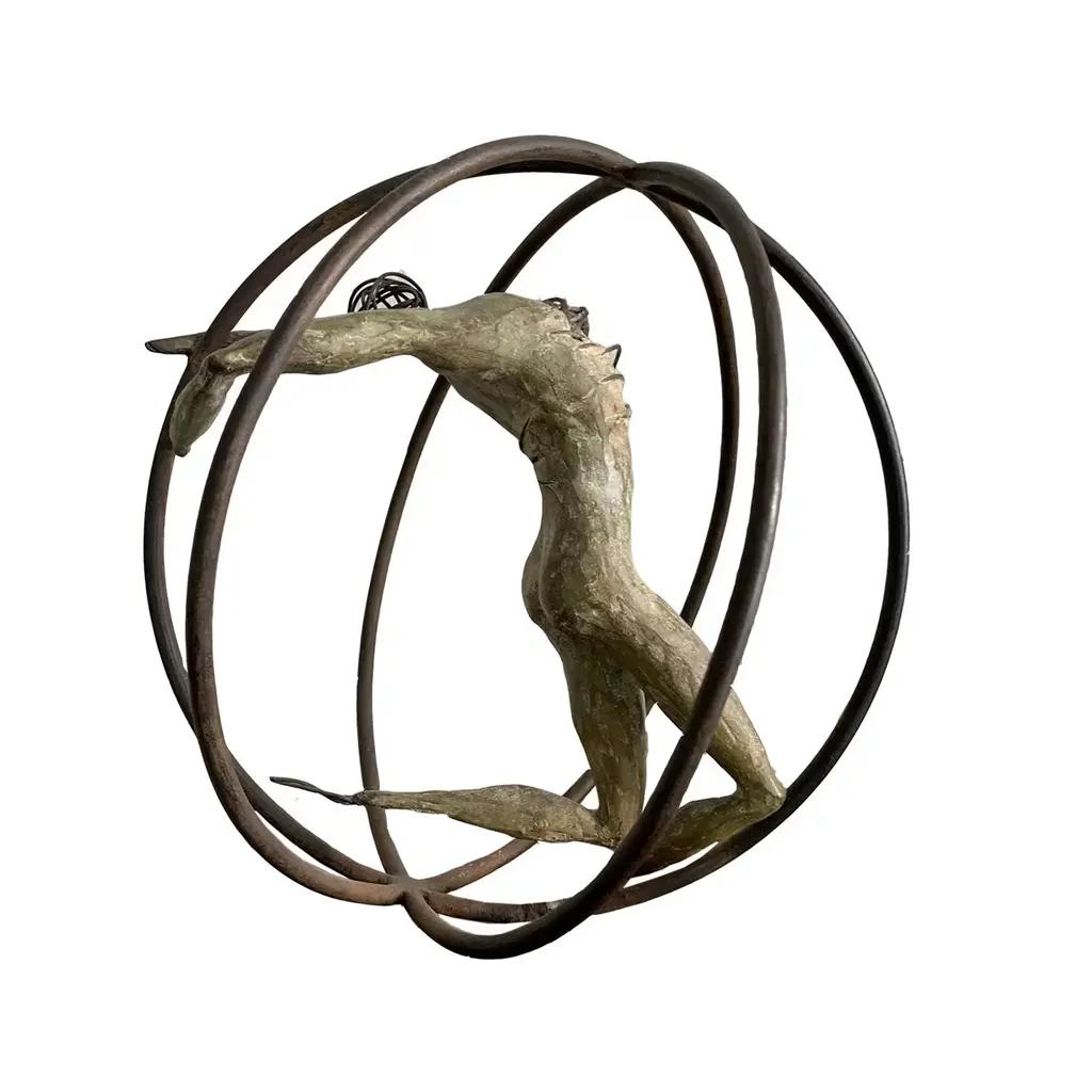 Embodying the perfect harmony between traditional craftsmanship and contemporary artistic sensibility, this sculpture is one of the artist's most appreciated works. Crafted by hand with the ancient lost wax method, the two mirroring figures are fashioned of bronze and elegantly dance in an iron sphere that can be rotated and moved, creating changing and unique sculptures.