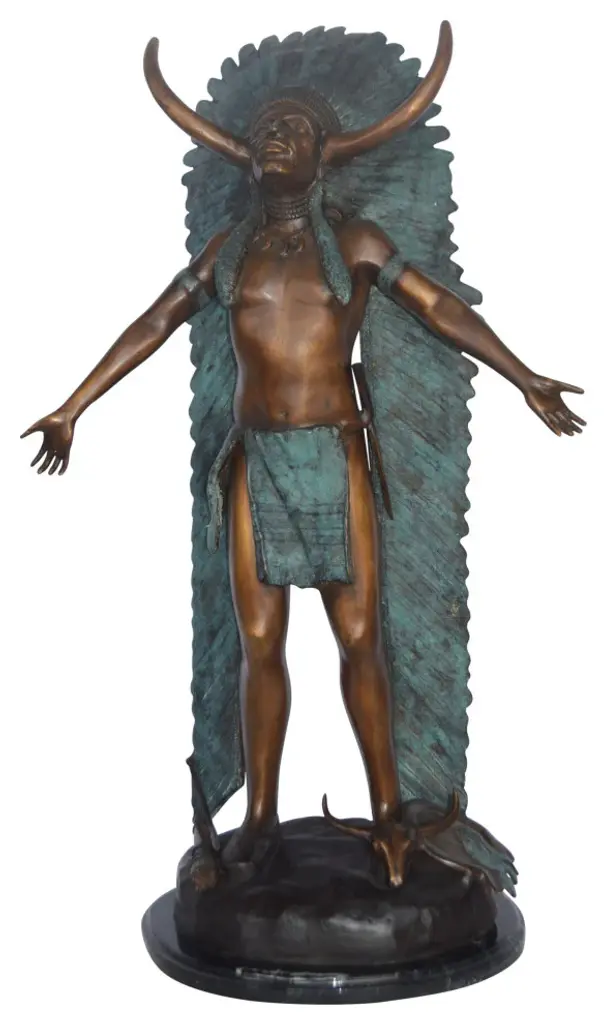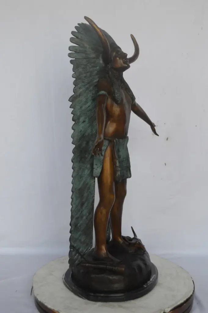 This bronze statue of an Indian tribe leader with a plume is an ancient symbol of fearlessness and leadership. This bronze statue uses a green patina finish to ensure the color of the plume. The work of art would look wonderful in any room, office, or building. Size: 22"L x 14"W x 38"H. Weight is: 59Lb