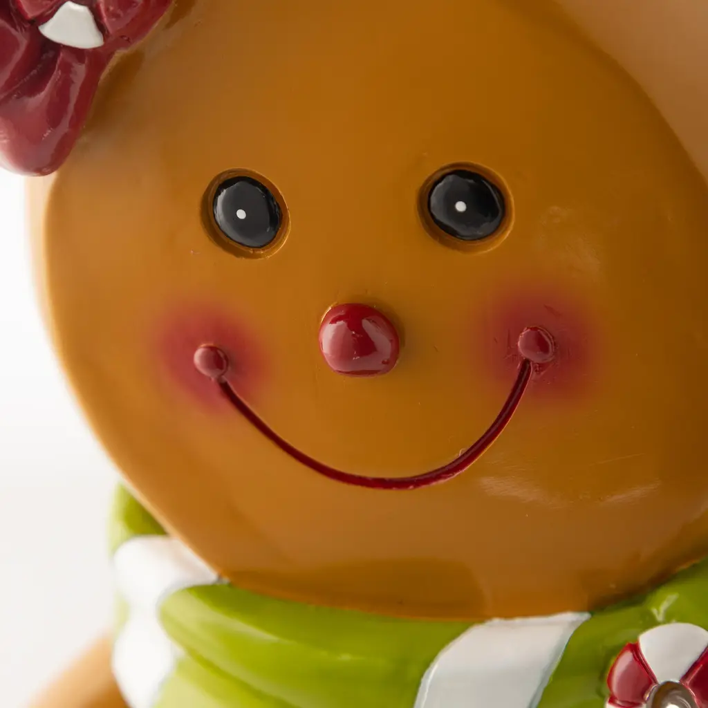 Our adorable Gingerbread Girl Shorty Statue will help you welcome the holidays in sweet style! Perfect on your porch, in your yard, at the hearth or anywhere indoors or out. Brighten any space with this sweet little accent that has great hand-painted details and embedded lights to make it shine. Nicely finished from front to back, our Gingerbread Girl is all dressed up in a colorful dress, scarf and bow with pretty candy embellishments. Crafted of weather-safe poly resin with a glossy finish resembling porcelain. This statue is beautifully hand painted with loads of charming details. Its battery-operated lights work on a timer (batteries not included).