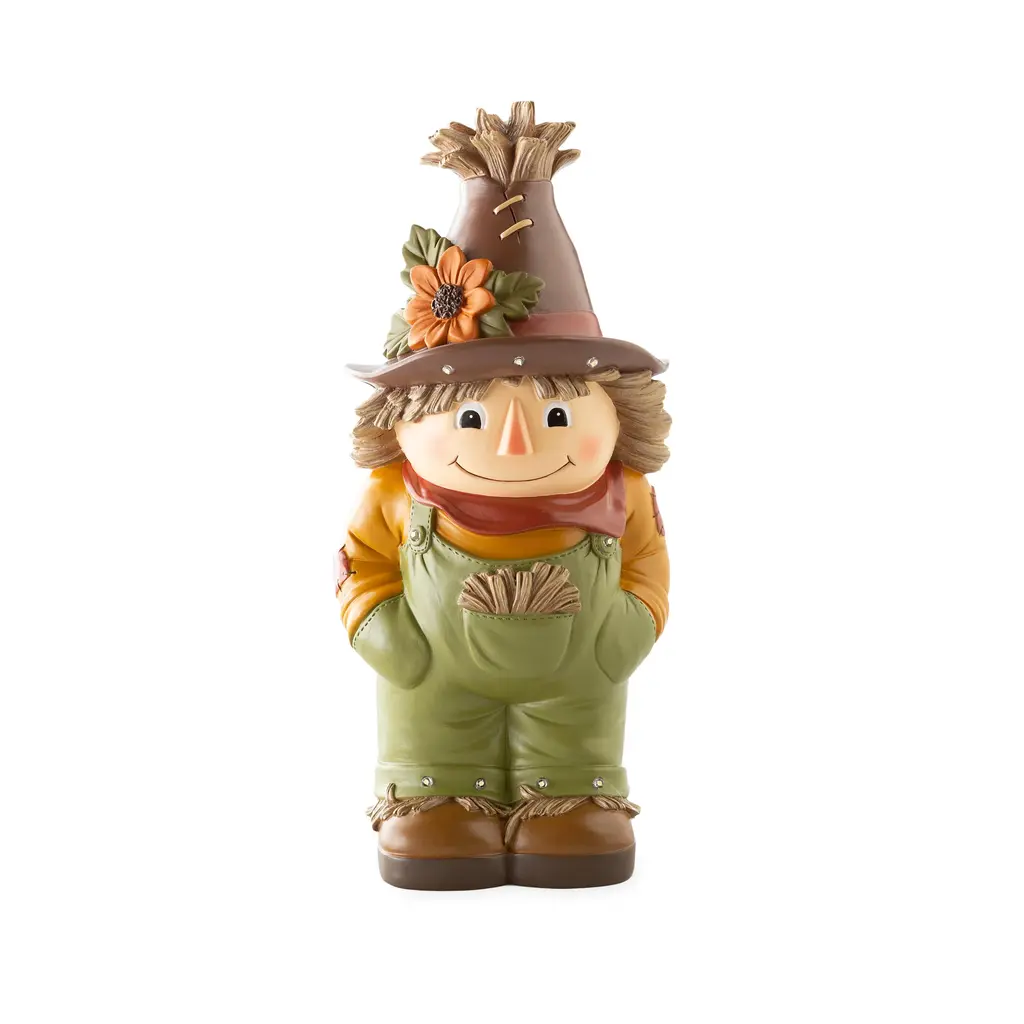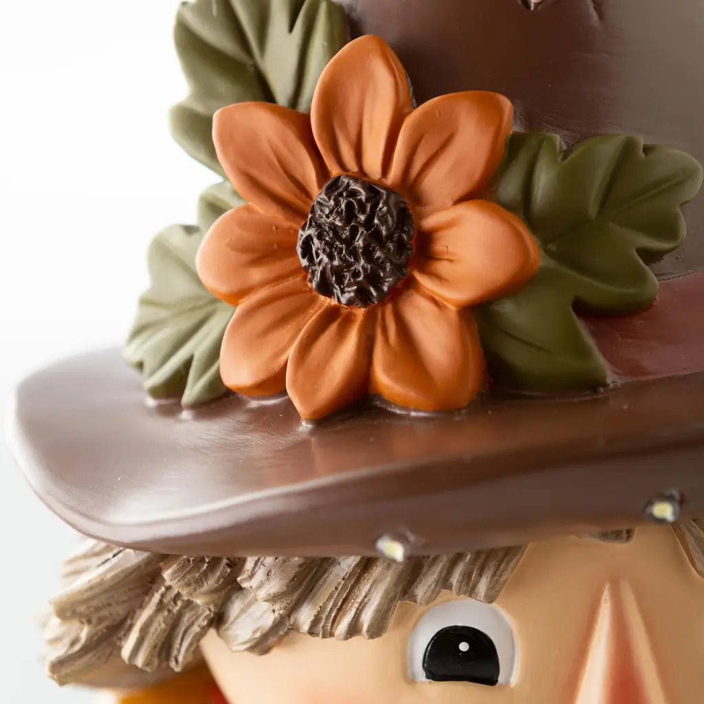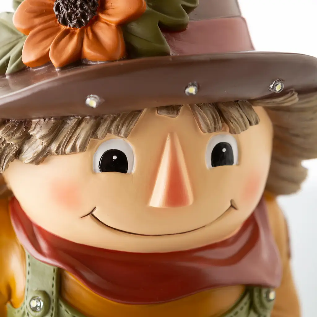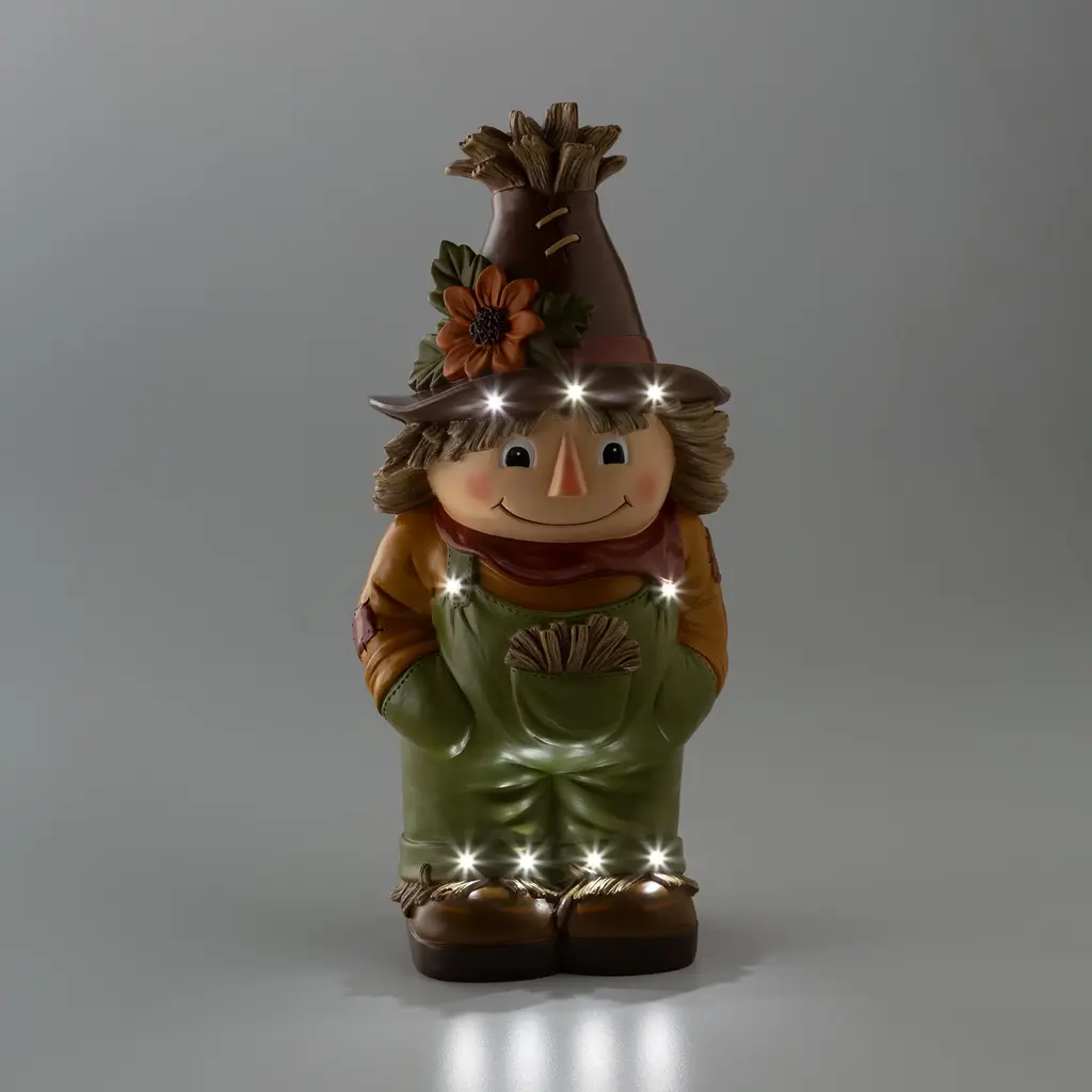 Our Indoor/Outdoor Lighted Scarecrow Shorty Statue is a whimsical take on a classic character. Perfect for Halloween or Fall, he'll grab the attention of anyone who sees him.This little guy may be too cute to scare off any crows, but he will gladly greet guests and passers by with a friendly smile. Outfitted in green, straw-filled overalls, boots and a delightful flower-topped hat, he is ready to stand sentry on your porch, in your yard or even inside.Made of weather-safe resin, the hand painted scarecrow resembles pottery without the breakage. Lights shine on his hat and overalls, thanks to a battery-operated timer.No-fuss battery-operated lights operate on a timer 6 hours on, 18 hours off. Takes 3 AA batteries, not included.