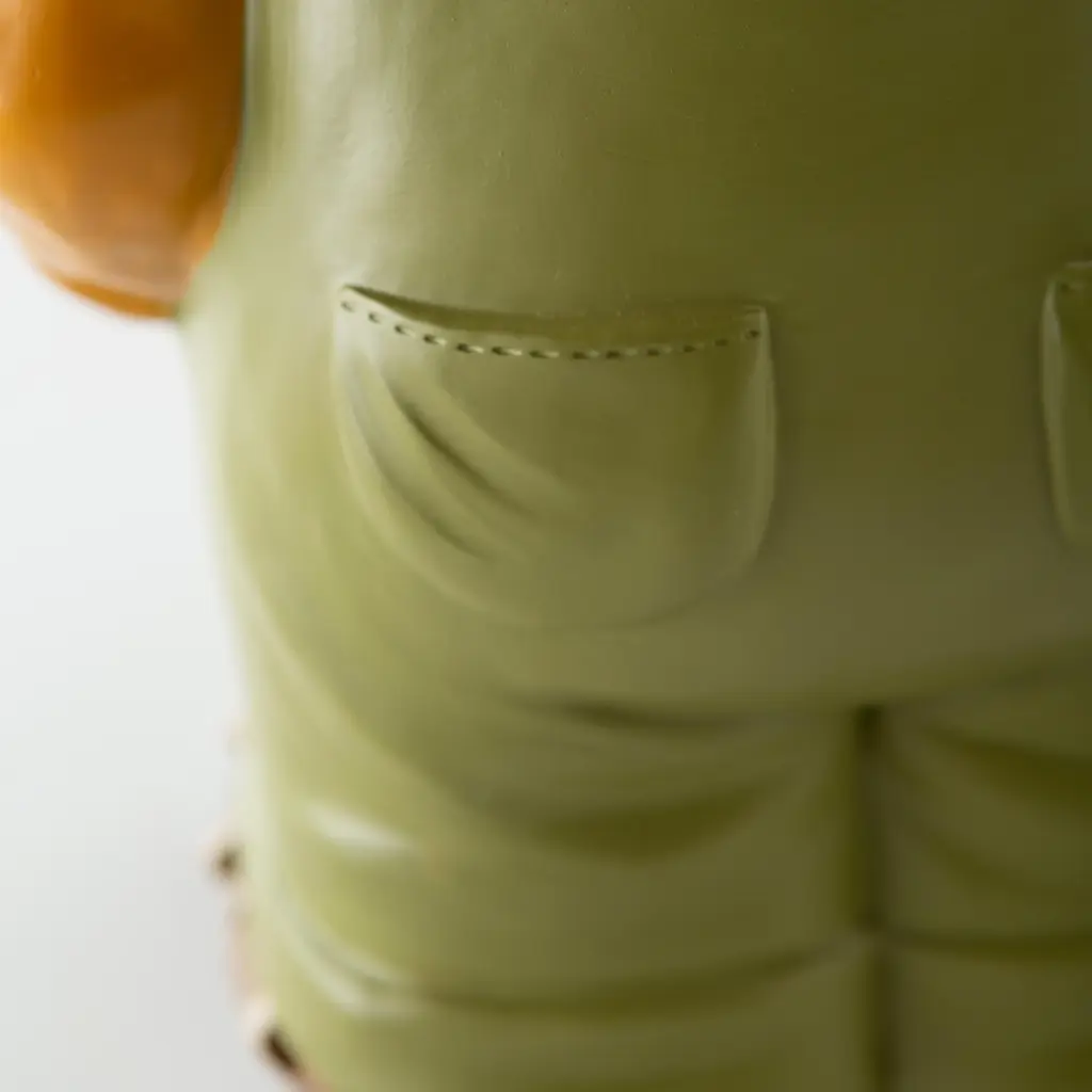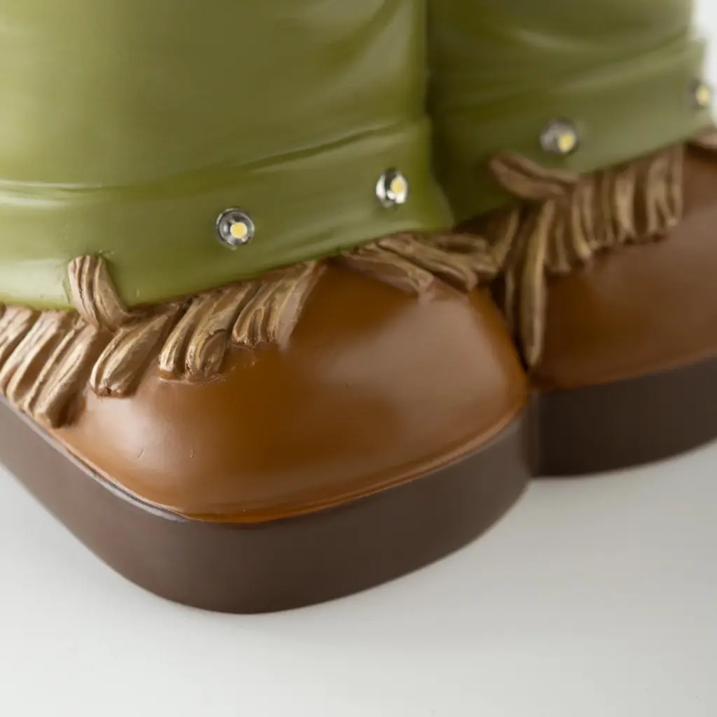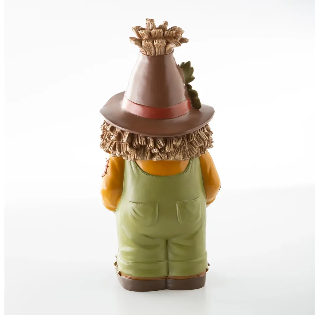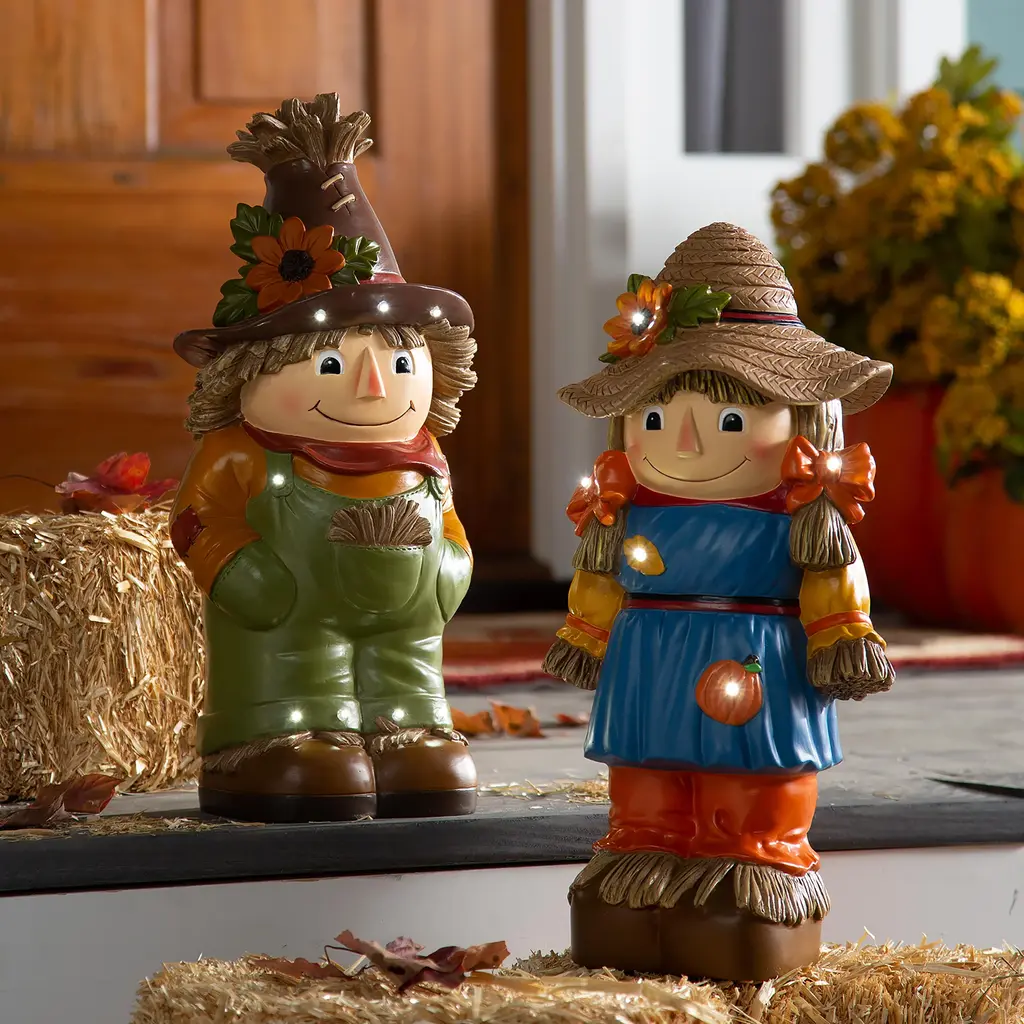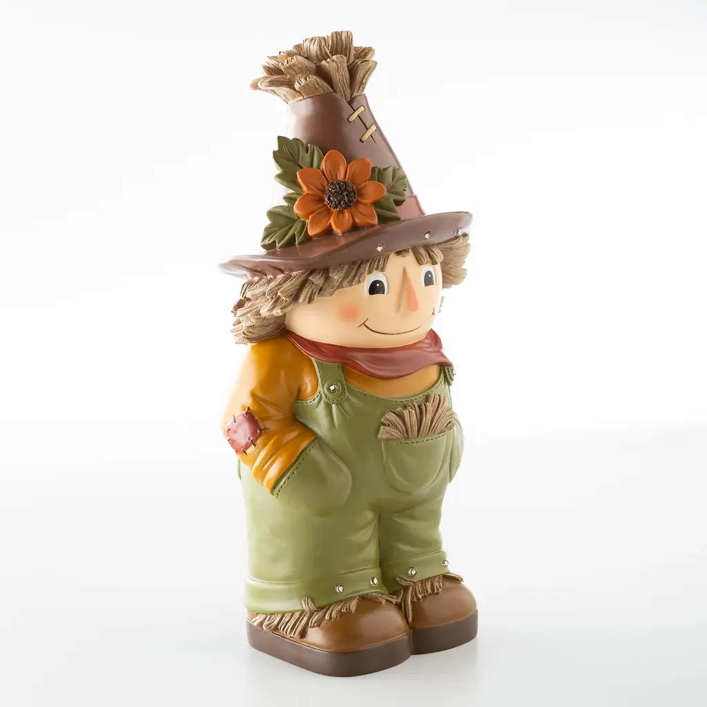 Our Indoor/Outdoor Lighted Scarecrow Shorty Statue is a whimsical take on a classic character. Perfect for Halloween or Fall, he'll grab the attention of anyone who sees him.This little guy may be too cute to scare off any crows, but he will gladly greet guests and passers by with a friendly smile. Outfitted in green, straw-filled overalls, boots and a delightful flower-topped hat, he is ready to stand sentry on your porch, in your yard or even inside.Made of weather-safe resin, the hand painted scarecrow resembles pottery without the breakage. Lights shine on his hat and overalls, thanks to a battery-operated timer.No-fuss battery-operated lights operate on a timer 6 hours on, 18 hours off. Takes 3 AA batteries, not included.