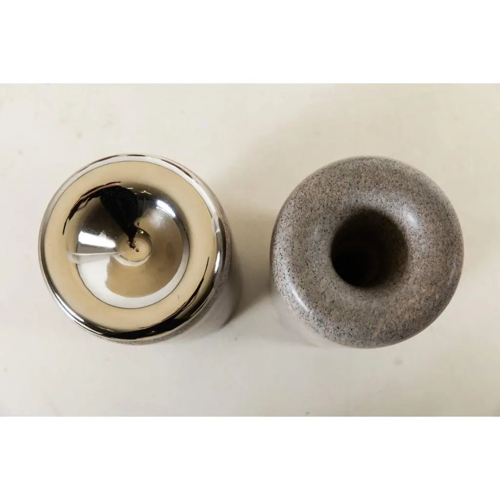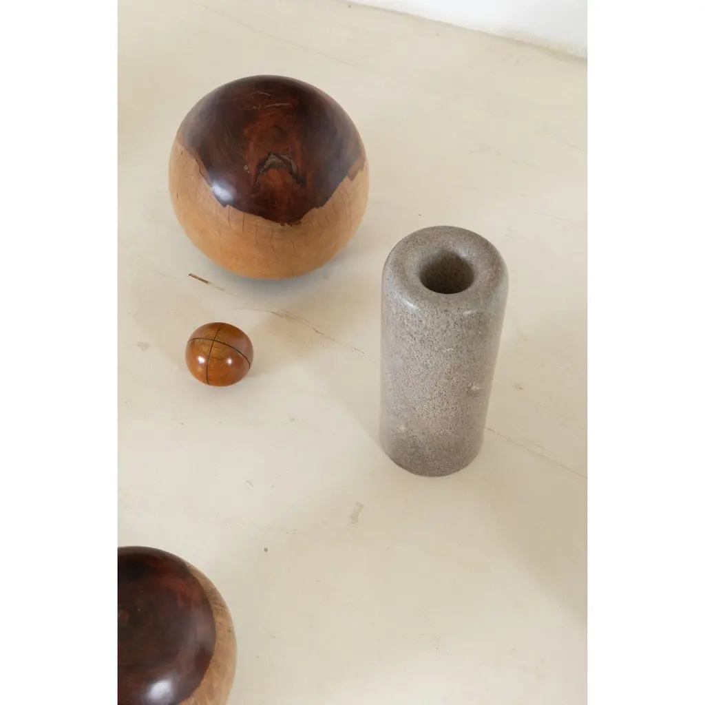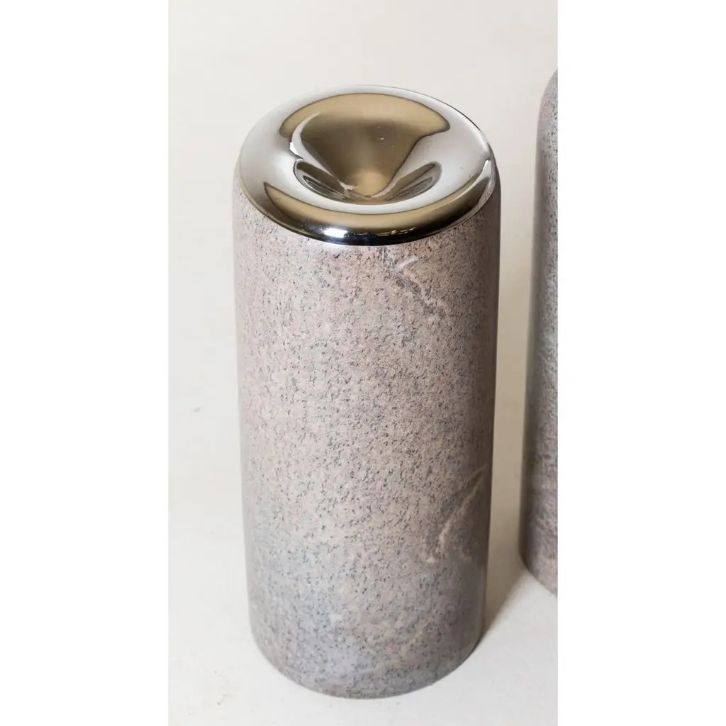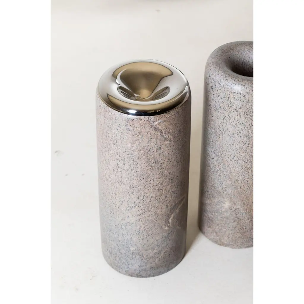 Infinito Soapstone and Nickel Sculpture by Alva DesignMaterials: Soapstone and nickel.Dimensions: Ø 18 x H 45 cm.One counter stool, one screen, one coffee table, two wall sconces, sculptures: furniture and objects that make up a Decollection (Descoleção).Each piece was designed separately, expressing its uniqueness to the fullest, whether in use, concept, materiality or design.Such a proposition is a provocation in the face of concepts such as linearity, repetition and construction of narratives that usually guide our product development.Alva is a furniture and objects design office, formed by brothers Susana Bastos, artist and designer, and Marcelo Alvarenga, architect. Their projects are the result of the meeting of these two visions, the architectural and the artistic, and beyond the usual rationality and functionality, they seek the unusual, new uses and an expressive materiality. The duo's creation process starts from a sensitive observation of people's daily lives, their habits and current needs, together with a perception of new potentialities to be artistically explored. In the development of each piece, the technical and aesthetic baggage of the brothers, acquired through important experiences in the architecture and fashion market, is added to a strong relationship with their Minas Gerais and Brazilian origins. In the execution phase, the selection of raw materials and the exquisite manufacturing, often handcrafted, give a unique aspect to the works. The result is contemporary pieces loaded with memory.Alva's first line of furniture and objects was launched in 2013 at the MADE (Mercado, Arte, Design) fair in São Paulo. Following this launch, the firm partnered with Etel - a brand now known worldwide for publishing the best of Brazilian design - to produce and market some of its creations, bringing the brothers' names into the special group of authorial designers represented by it. Since their first release, Susana and Marcelo's creations have gained visibility in several important publications, websites and magazines, both national and international.