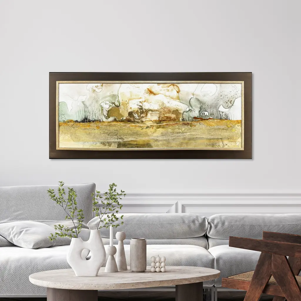 Mixed media giclee on wood with hand painted accents and gold leafing. A sleek champagne gold wood frame is mounted on a hand finished wood board.