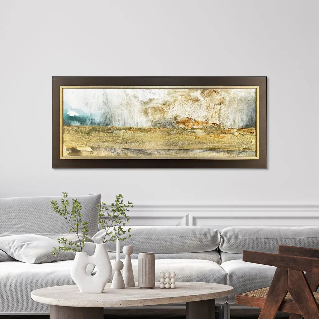 Mixed media giclee on wood with hand painted accents and gold leafing. A sleek champagne gold wood frame is mounted on a hand finished wood board.