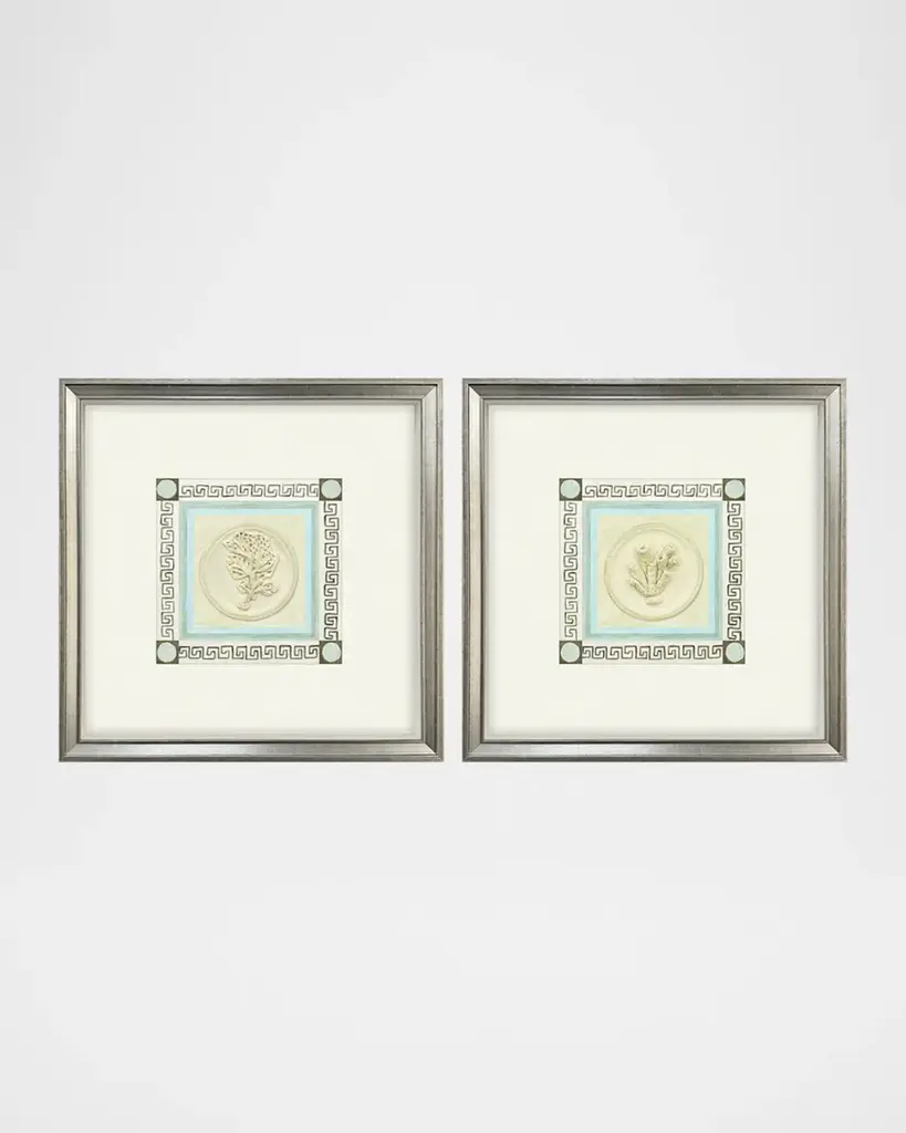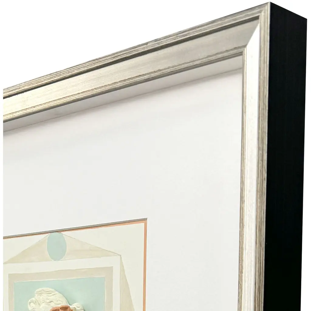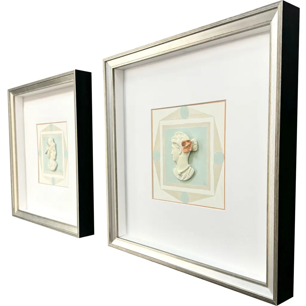 Playful hand cast and painted bust intaglios re-imagine classical sculptures. Shadow boxed and framed in a silver leaf wood with gold wash edging.