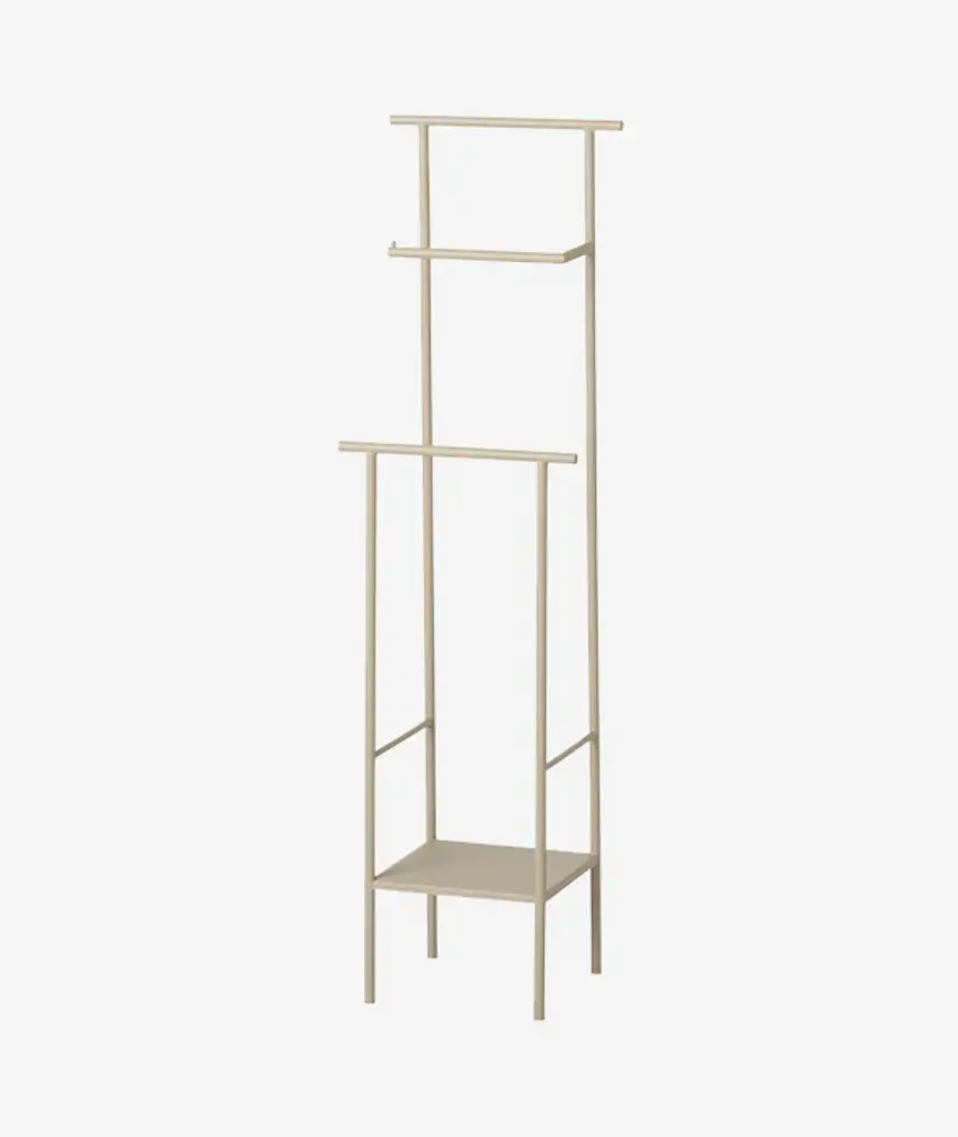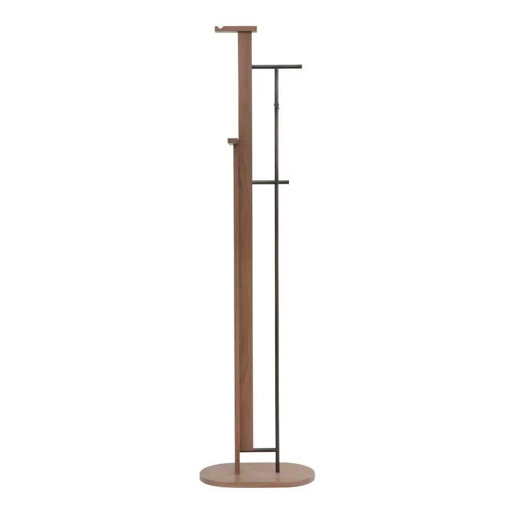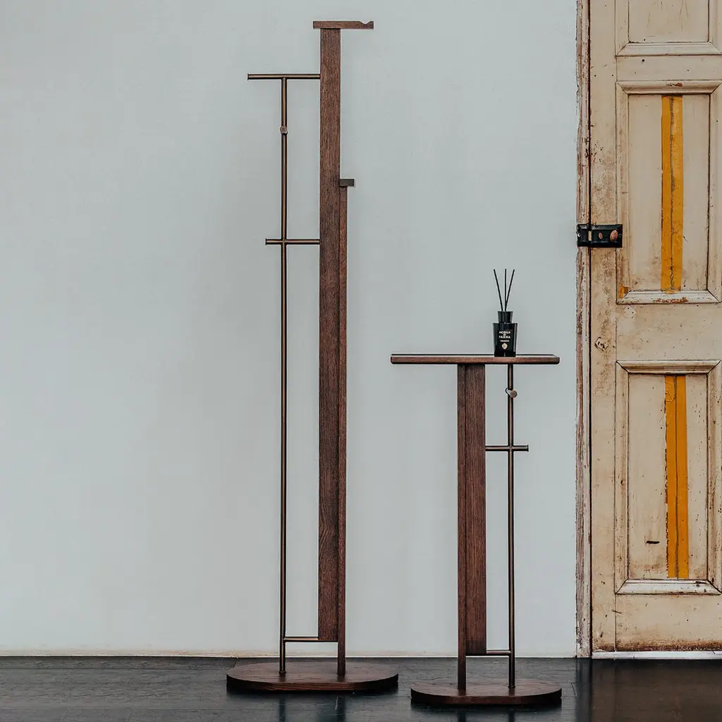 The Inter collection harness the inherent beauty of simple materials, blending them into pieces that seamlessly balance sculpture and furniture, art, and function. The interplay of vertical and horizontal elements defines each component's function, with deliberate dualistic contrastswood versus metal, tube versus plank. This not only enriches visual appeal but also enhances the collection's versatility for a wide range of spaces. Two distinct pieces within the collection echo this design spirit: one stands tall as an open coat hanger, while the other, with a lower profile, serves as a console .