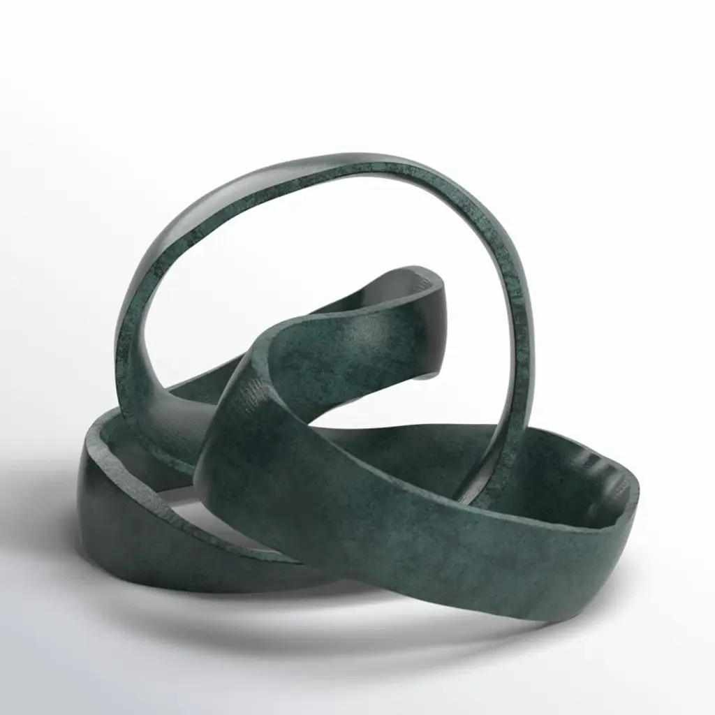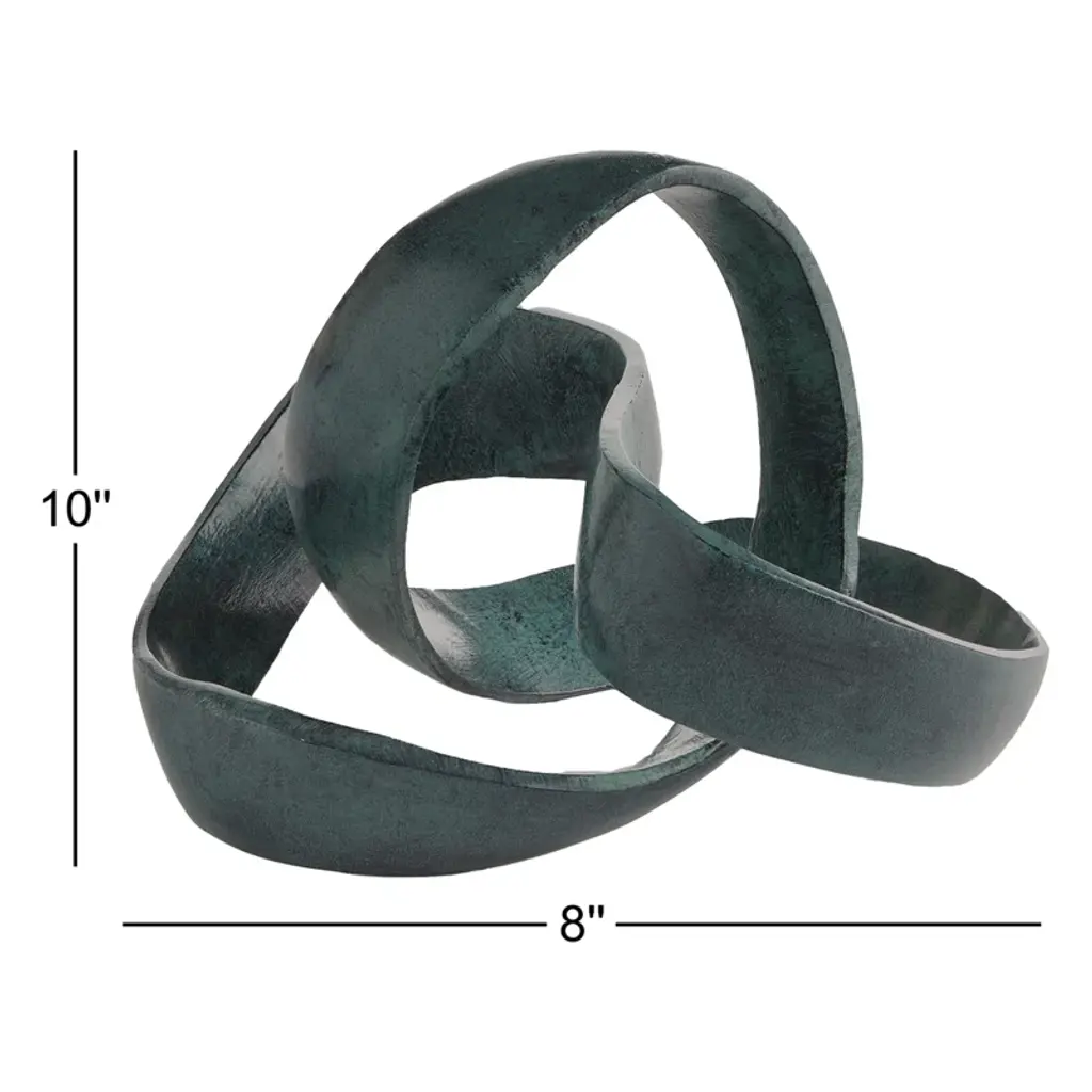 Add a touch of modern art to your bookshelf or desk with this geometric sculpture. Crafted from aluminum, it features a dynamic design with a ribbon-like band of metal twisted around itself in an infinite spiral that's balanced to sit firmly on any tabletop. A black hue with a teal patina makes it easy to pair with any aesthetic or color scheme. This piece measures 10'' tall, so it makes an impact on your coffee table or mantelpiece. And it weighs 2.5 lbs., so it works as a paperweight on your desk or filing cabinet.