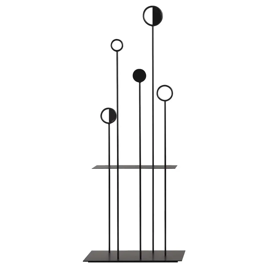 A striking and eclectic sculpture of modern flair, this piece is a coat hanger part of a series inspired by playing card suits. The Jack card is here represented by a series of cut-laser steel long stems ending with rectangular panels, and enriched with a short shelf supporting a splendid sphere that adds a sinuous accent to the piece. This piece is customizable in color upon request.