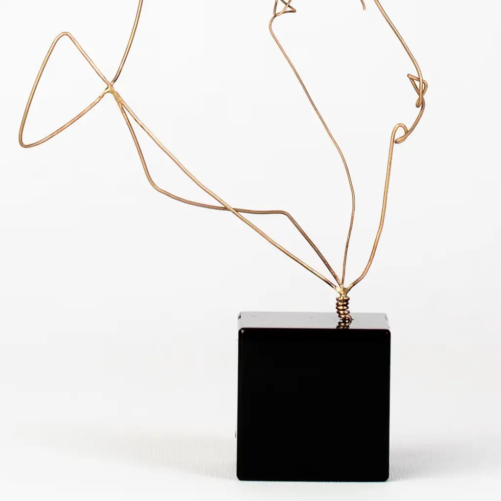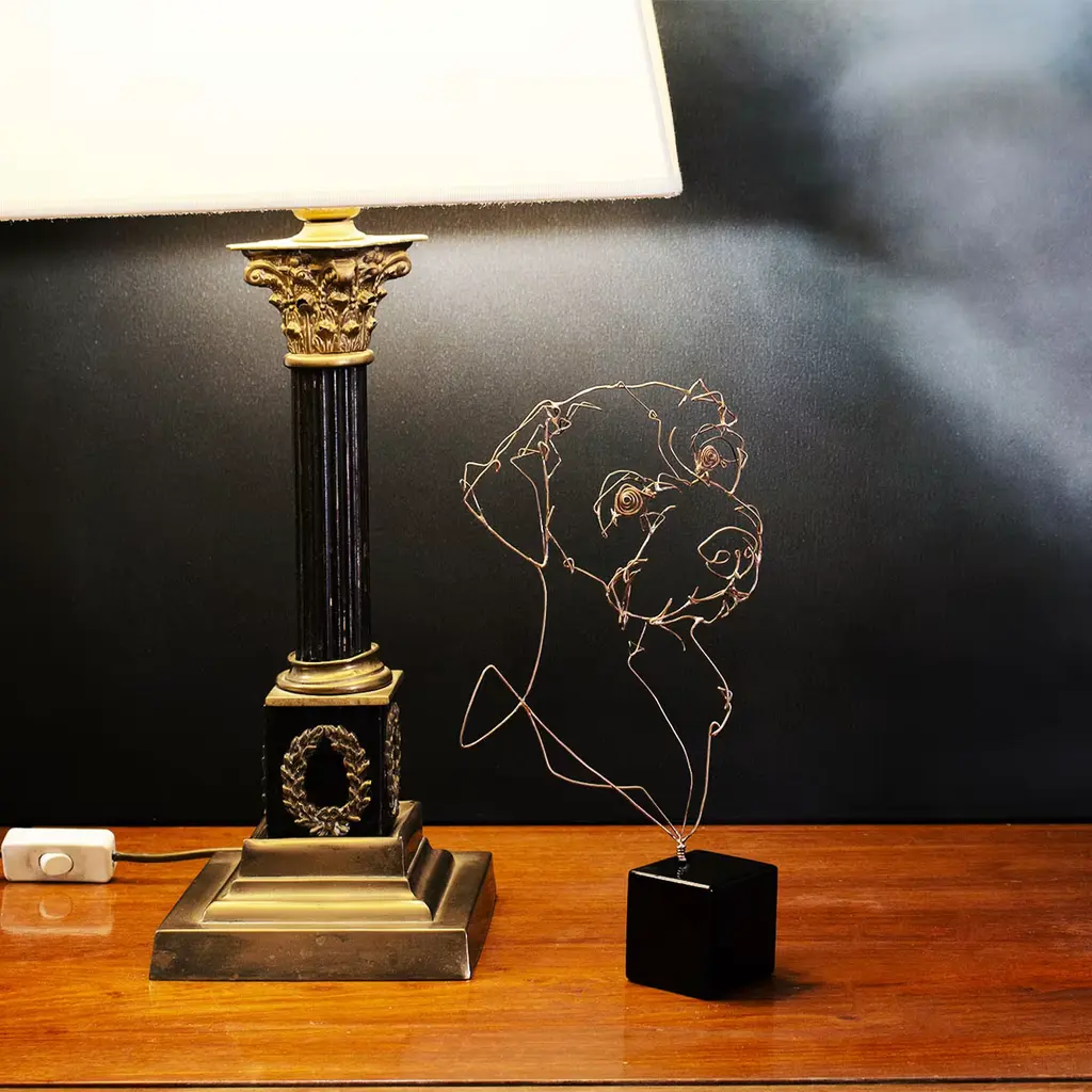 A deftly handmade miniature of a Jack Russell Terrier's snout, this statuette can be customized with a portrait of one's own dog, or any other dog breed. An original gift for an animal lover, it is fashioned of metal wire and supported with a polished black cube base. Other 69 dog breeds are available, please ask the Concierge for more information and customization options.Pomeranian bronze wire.