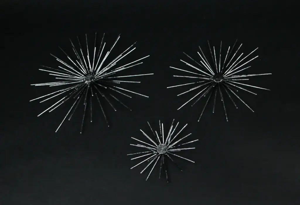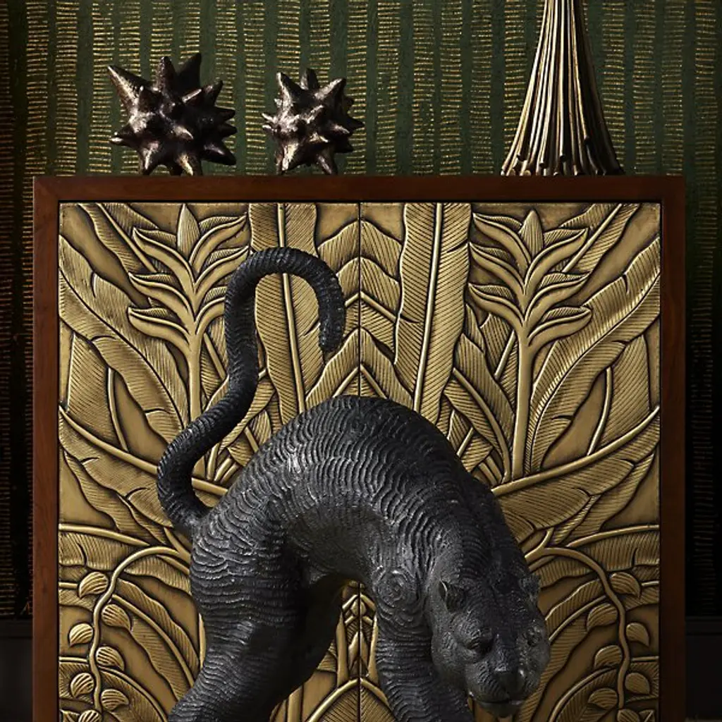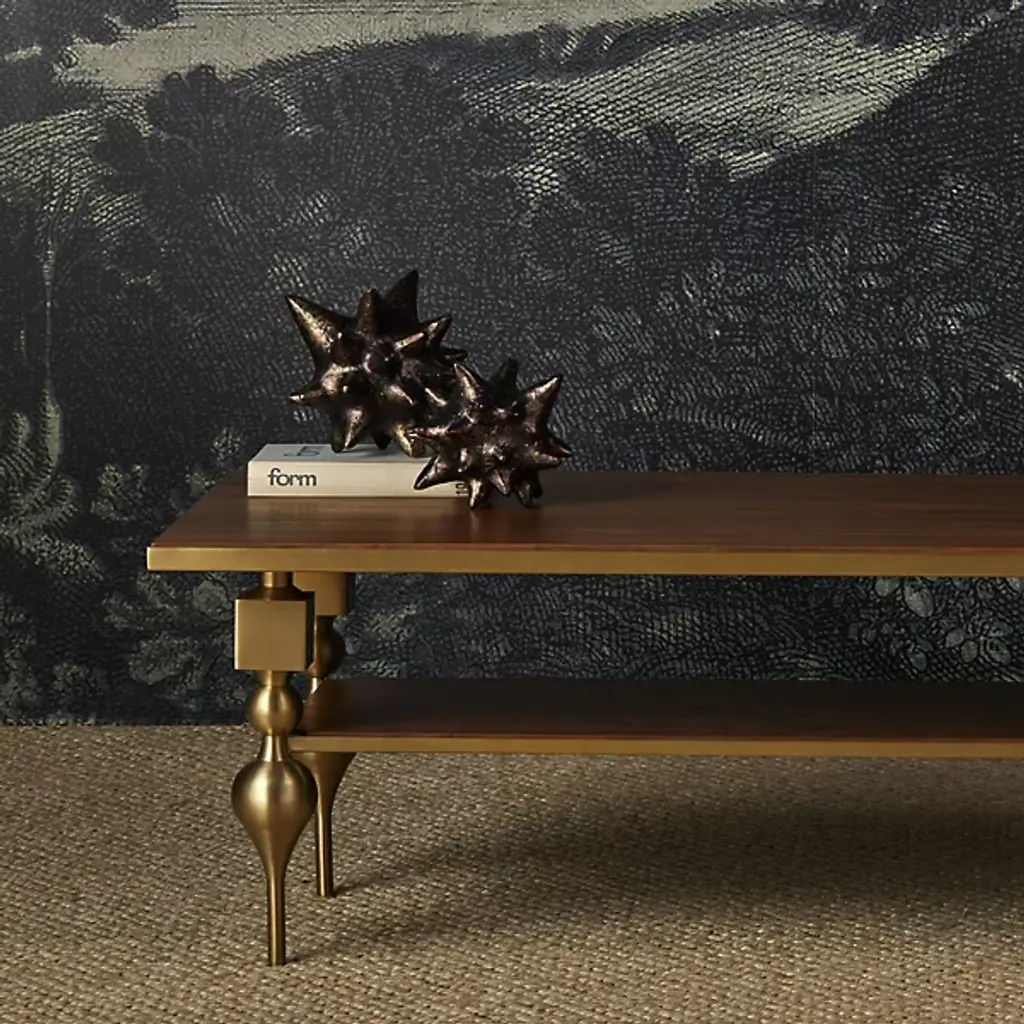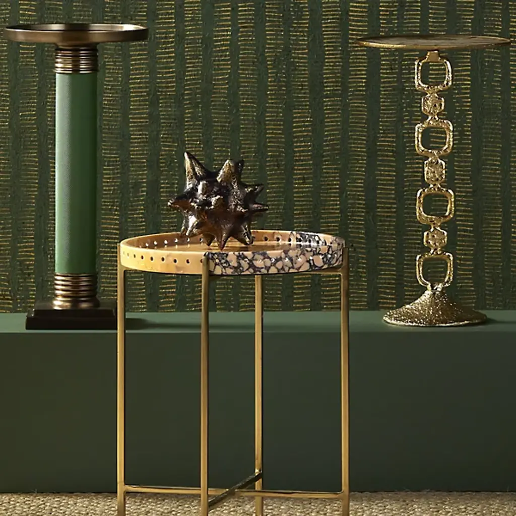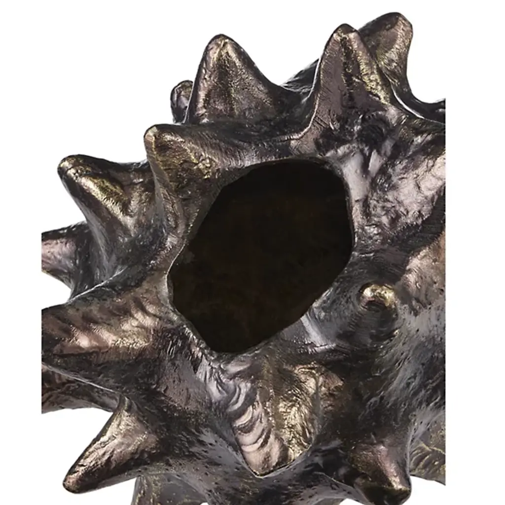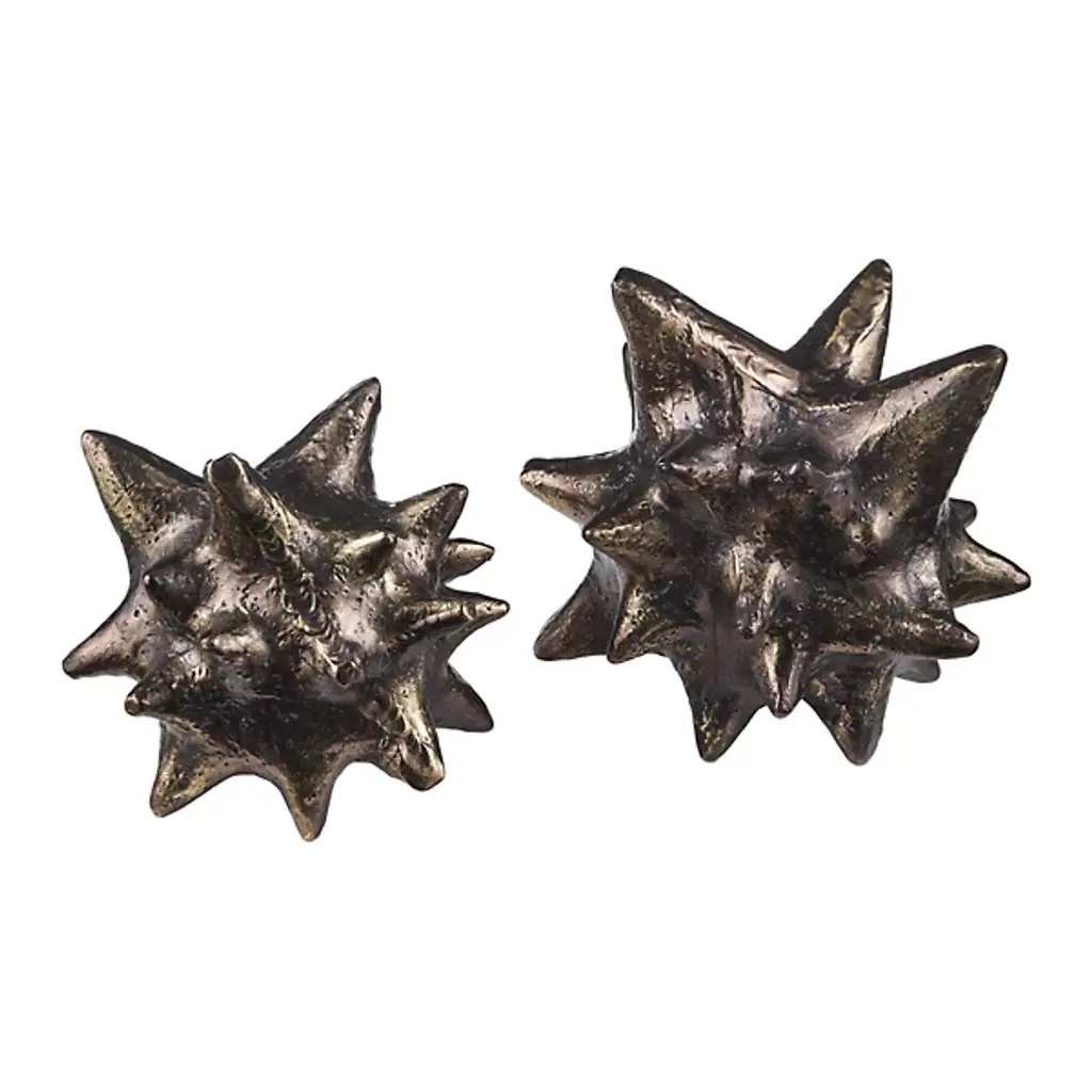 The Jacks Object, Set of 2 from Currey & Company turns childhood nostalgia into sophisticated decor. Each cast aluminum piece undergoes an artisanal aging process after being pulled from the mold, creating a distinctive mottled patina that varies slightly between items. The star-shaped points extend in multiple directions, creating an engaging play of light and shadow as they catch illumination from different angles. These solid sculptures take their inspiration from the classic children's game while serving as dynamic tabletop accents. Their substantial weight and three-dimensional presence make them ideal conversation pieces in both traditional and contemporary settings.