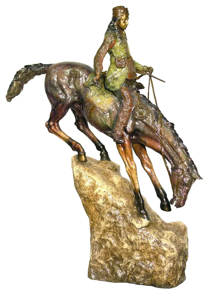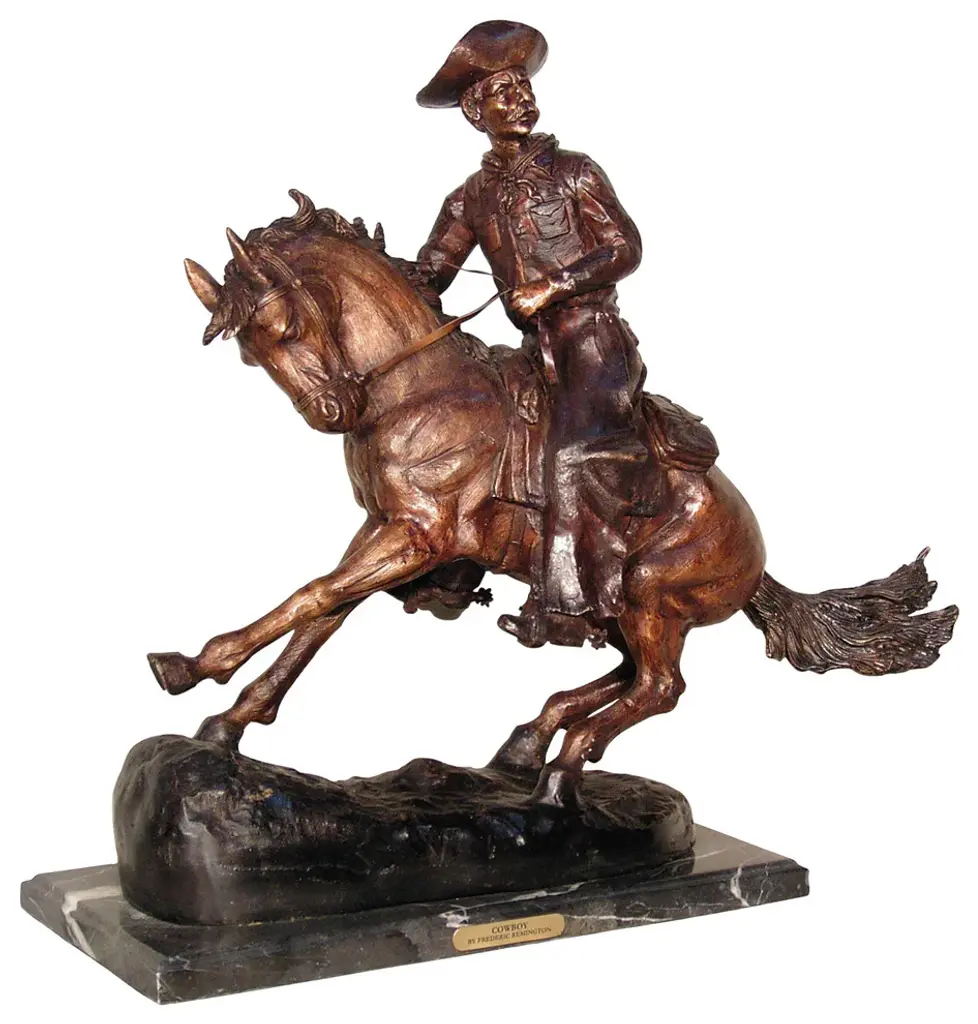 The James Fraser-inspired Bronze Statue, End of the Trail depicts a scene from the Wild West. Finished in bronze patina with the greatest attention to detail, mounted on a marble base. This piece is a true examples of a museum quality hand-casted bronze using the Lost Wax Process of bronze casting. This replica will add another perspective of the American history to your home. Size: 15"L x 6"W x 15"H. Weight is: 15Lb