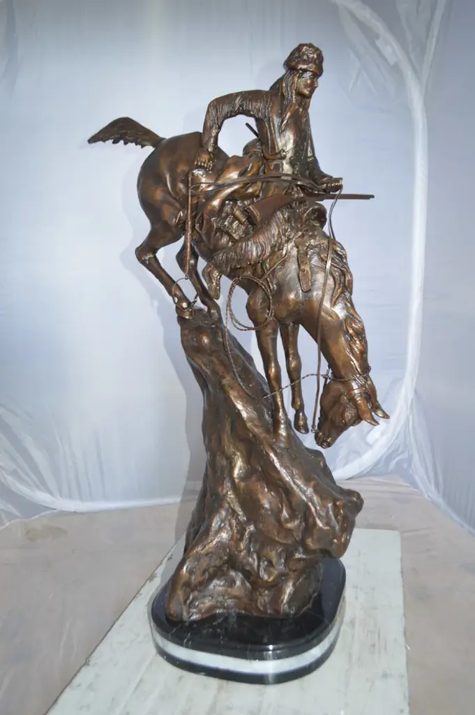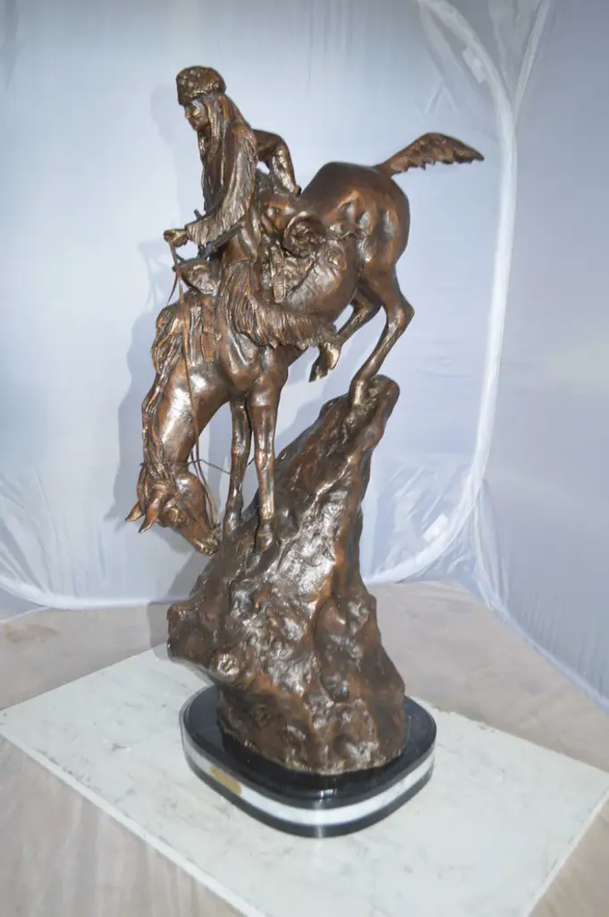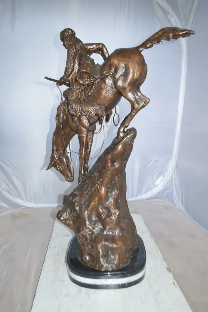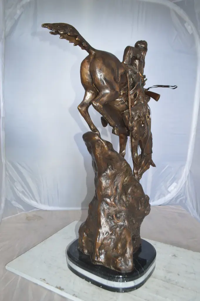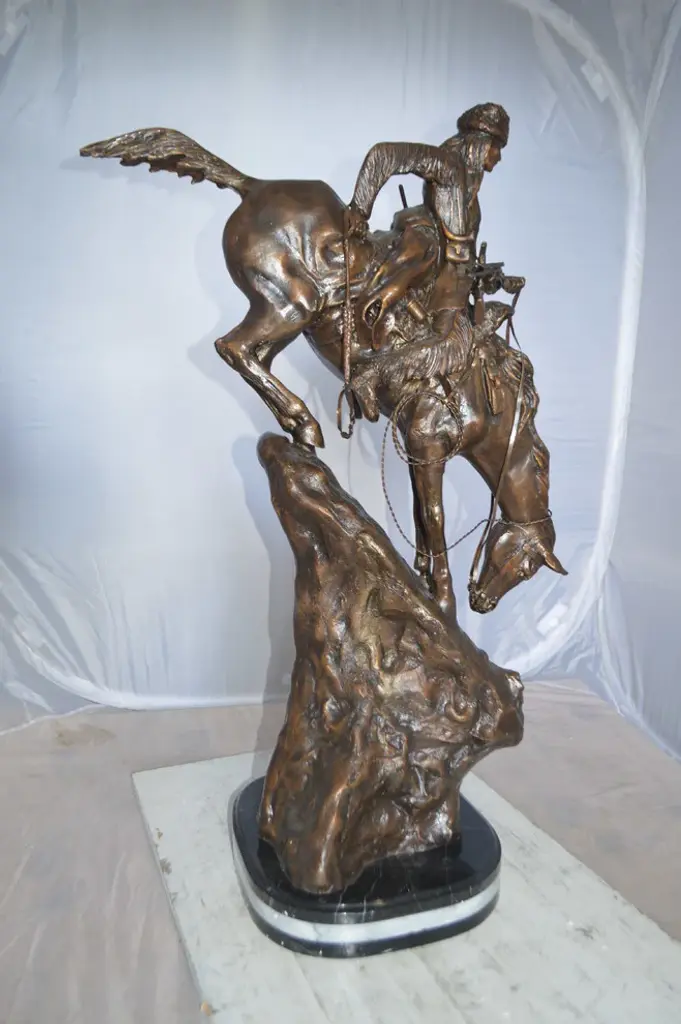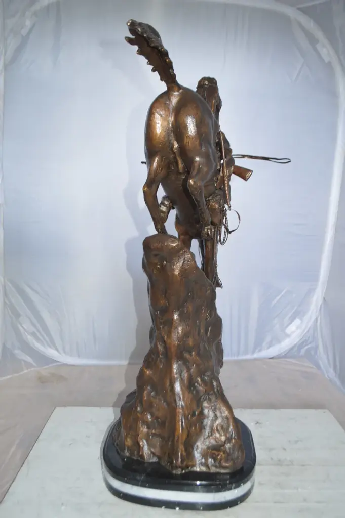 This is a jumbo size, 100% Bronze giant Statue of the Mountain Man by Frederic Remington replica. The Mountain Man depicts a dramatic moment in the daily life of a frontier trapper, in which he and his mount work together to descend a precarious slope. Cast in the lost-wax technique, the Mountain Man statue is sharply delineated with a rich variety of textures, from the fringed buckskin garment to the animal"™s hairy coat to the rocklike base. Size: 13"L x 13"W x 37"H. Weight is: 90Lb