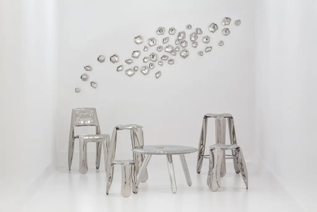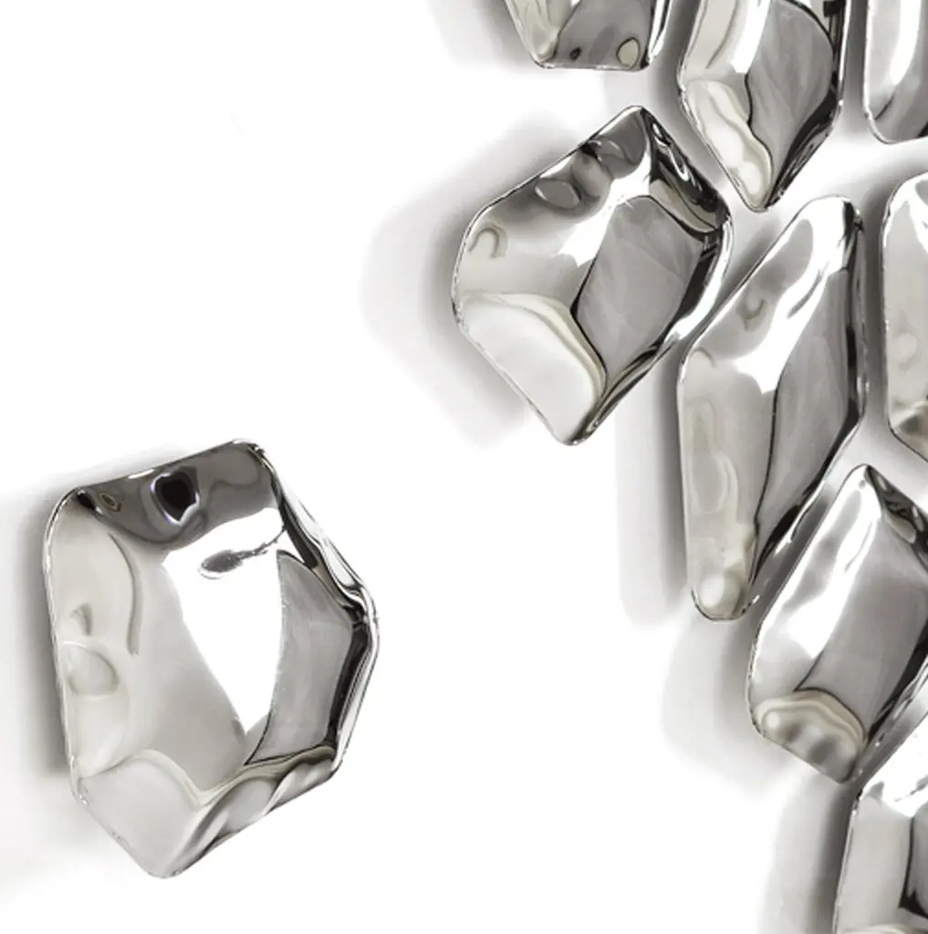 Kamyki is a series of wall hangers or decoration in unique but repeatable shapes. Kamyki are made of stainless steel polished to high gloss which gives them a very adorable look when mounted together to the wall to create a special pattern or design. They are often used to decorate the reception entrances, halls or bare and minimalistically structured walls inside or outside of the building. They have different diameters from 7 to 20 cm which can be easily adjusted according to the customer´s needs.Kamyki 12 set is available in carbon steel and stainless steel with the following finish options;Carbon steel:Cosmic blueStainless steel:PolishedEmeraldSapphireFlamed goldAbout the artist/ designer:Oskar Zieta - an architect, designer, artist and innovator. Born in 1975, after he graduated architecture at Szczecin University of Technology in 2000, he has got a scholarship at ETH Zurich. Over the course of 2 years of postgraduate studies he developed skills in parametric design and modern manufacturing technologies finalized with PhD graduation. Currently he runs the department of Industrial Design at School of Form. Laureate of many prestigious awards in design and technology. Inventor of FiDU - inner pressure metal forming technology - the keystone to Zieta Collection, Zieta Out of Ordinary as well as large scale sculptures like NAWA on Daliowa Island in Wroclaw and WIR in Galeria Pólnocna in Wroclaw.Ambassador of Warsaw Home & Contract Fair. Oskar Zieta has been awarded the AUDI - Mentor-Price 2011, the Red Dot Award 2008, DMY Award for Innovation in production process 2008, the YDMI 2008, the German Design Council Prize 2009, the Forum Aid Awards 2009, Technology Award Materialica 2009, MUST HAVE Design Lódz 2011 and was nominated to Mies Van Der Rohe Award 2019, the Schweizer Design Preis 2009 and the Dobry Wzór, 2009. His designs carved out their way into numerous prestigious collections including Centre Pompidou in Paris, the Pinakothek der Moderne in Munich, Zurich Design Museum and the Baden State Museum In Karlsruhe.Oskar Zieta is a CEO of Zieta Studio established in 2010 in Wroclaw. The company is an interdisciplinary team of architects, designers, engineers and technologists as well as production line and Industrial implementation workers. Specialists in many fields are permanent collaborators of Zieta Studio - psychologists, biologists, scientists and many others. FiDU Innovation Lab develops its own, innovative technologies of stabilizing sheet metal, i.e. FiDU and 3+ and their application to modern architecture, engineering and design.