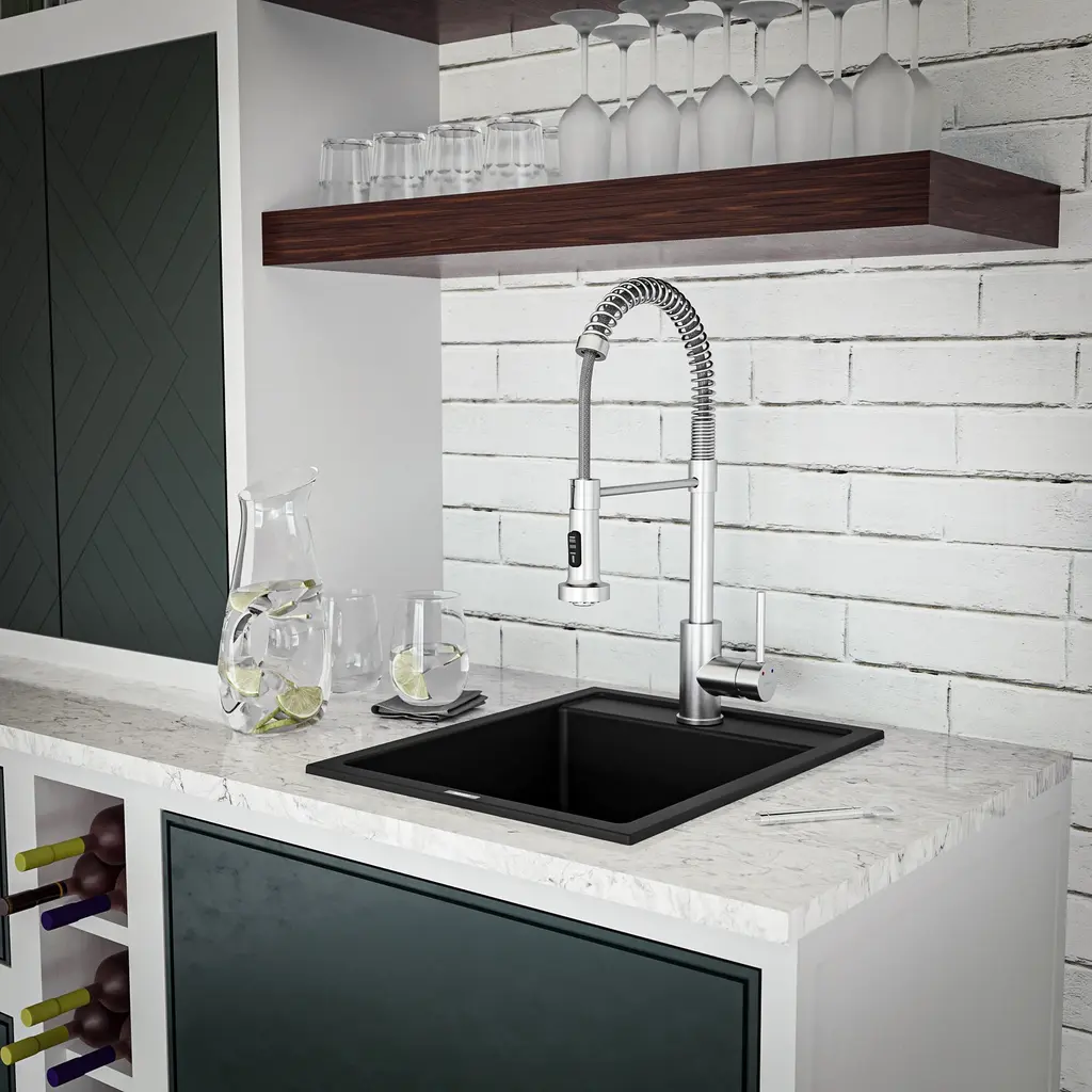 The Karran QT-825 Bar Sink, with its modern linear styling, enhances kitchen and bar functionality and aesthetics. This 15-inch top mount/drop-in bar sink, crafted from robust quartz composite material, is designed for seamless integration into any countertop material. It features a unique ledge to accommodate a cutting board and is available in a selection of 6 elegant color choices to complement any décor, ensuring your bar or kitchen is as stylish as it is functional.Features & Benefits• Quartz Composite Material: Constructed with 80% natural quartz crystals and pure acrylic resin, offering outstanding durability and a long lifespan.• Heat Resistant: Withstands temperatures up to 535°F, accommodating rapid temperature changes without damage.• Easy Maintenance: The smooth surface ensures food residue and watermarks do not stick or stain, making cleanup straightforward with just a cloth and soapy water.• Durability: Highly resistant to stains, scratches, abrasions, and impacts, maintaining its aesthetic appeal over time.• Noise Reduction: Engineered to absorb vibration and minimize noise, contributing to a quieter environment.• Color Selection: Choose from 6 deep, rich colors with UV stabilization to ensure the sink remains vibrant and does not fade over time.• Ample Space: The design includes 8” deep bowls, providing plenty of room to accommodate all your barware and kitchenware.Specifications• Series: Quartz QT Series - Bar Sink• Configuration: Single bowl• Overall Dimensions: 15-3/4” (length) x 19-34” (width) x 7-7/8” (depth)• Inside Bowl Dimensions: 13-3/4” (length) x 14-3/4” (width) x 7-7/8” (depth)• Minimum Cabinet Size: Requires an 18" sink base cabinet• Drain Opening: 3-1/2”, compatible with most garbage disposal systems• Faucet Hole: Pre-drilled with one faucet hole, additional holes marked underneath• Weight: Approximately 20 lbs.• Certifications: cUPC certified