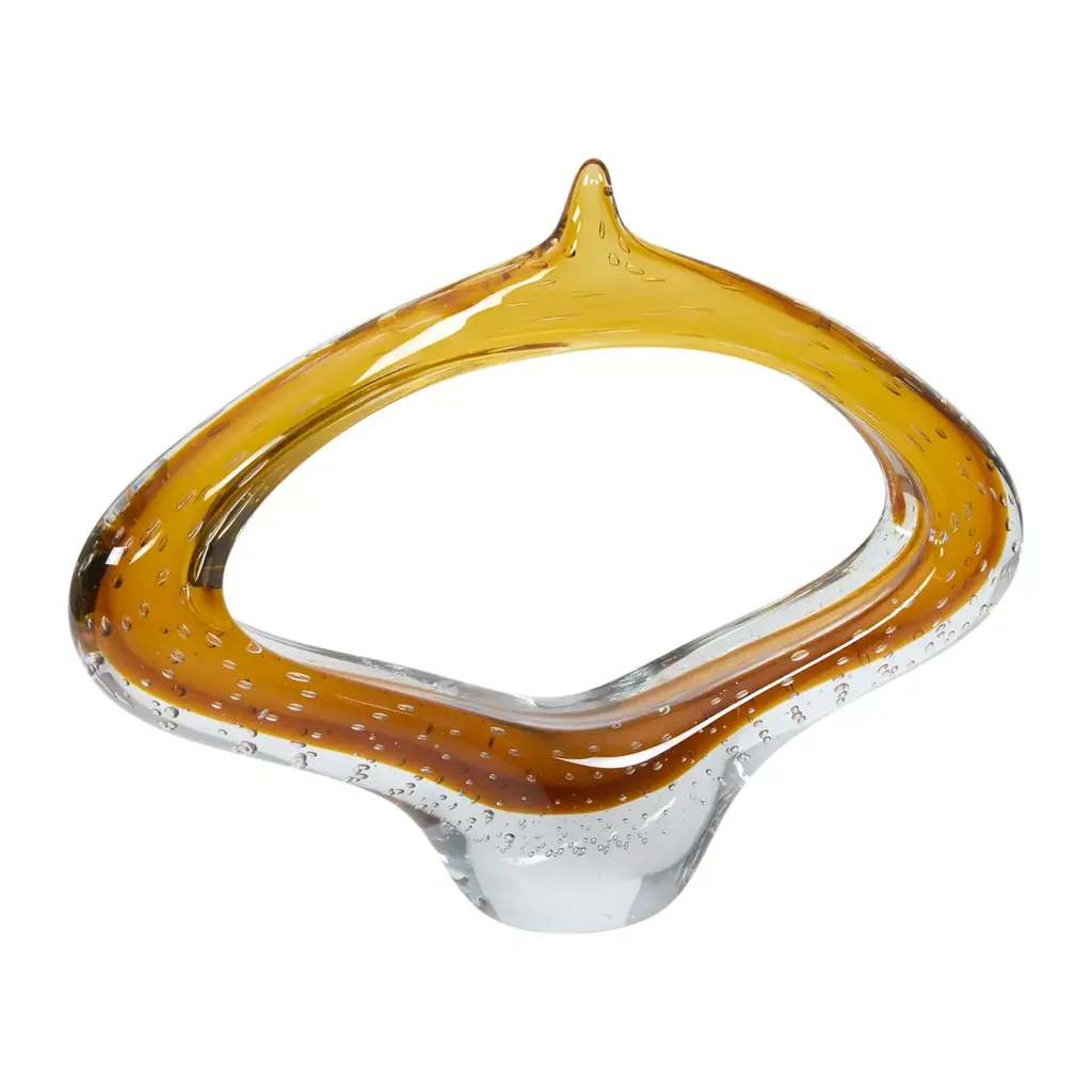 Commanding your attention with its abstract silhouette, our Kelis sculpture is crafted from glass and sits on a stand that showcases its stunning presence. This sculpture is available in a 12-inch size with blue-colored glass or a 15-inch clear-colored glass option. Please select your size before adding to cart.