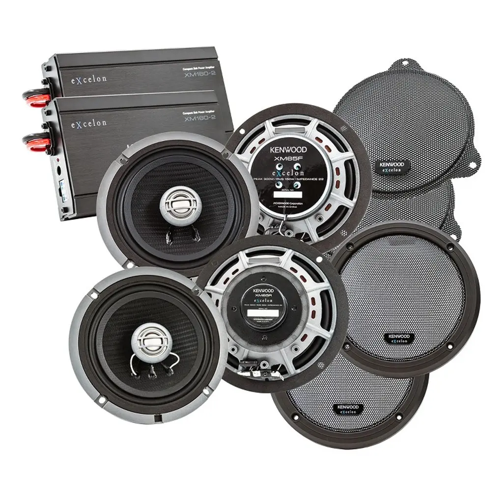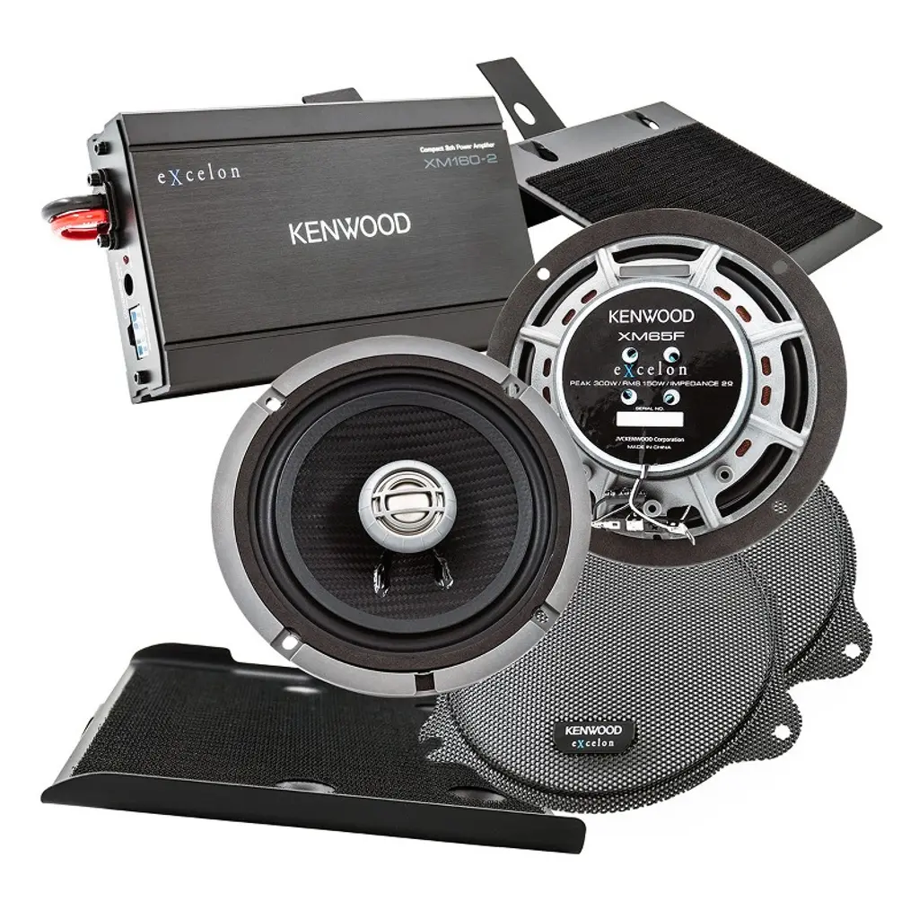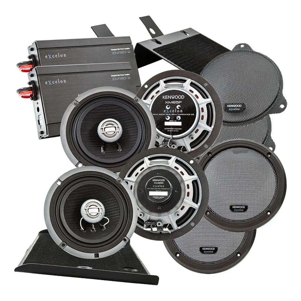 Elevate your Harley-Davidson riding experience with the Kenwood Excelon P-HD4UT audio package meticulously crafted to enhance sound quality for 2014 and newer Ultra models equipped with a rear seat and Tour Pak. This comprehensive kit ensures riders enjoy premium audio performance on every journey.Features•Complete Audio System Upgrade•Dual Class D Amplifiers for Powerful Sound•Premium 6.5" Speakers•No Radio Flashing Required•Expandable System with Bypass Port•Motorcycle-Specific Design for a Perfect FitComprehensive Audio UpgradeThe P-HD4UT package includes two 2-channel amplifiers 6.5-inch front speakers and 6.5-inch rear speakers providing a full-range audio enhancement tailored for your motorcycle. Designed for seamless integration it comes with all necessary wiring and mounting plates for a straightforward plug-and-play installation.High-Performance AmplifiersAt the heart of this package are two Class D 2-channel amplifiers each delivering 80 watts RMS per channel at 2 ohms. These amplifiers feature a high-efficiency design that ensures your bike's electrical system remains uncompromised. With speaker-level inputs compatible with both Harley-Davidson OEM radios and aftermarket receivers no radio flashing is required. Additionally a bypass port allows for future system expansions.Premium Speaker DesignThe included 6.5-inch front and rear speakers boast Injection Molded Polypropylene (IMPP) woofer cones paired with 1-inch PEI dome tweeters delivering clear and dynamic sound across a frequency response of 40Hz to 25kHz. With a sensitivity of 92dB and impedance of 2 ohms these speakers handle up to 150W RMS (300W peak) ensuring robust audio performance even at highway speeds.Tailored Fit for Specific ModelsThis audio package is specifically engineered for 2014 and newer Harley-Davidson Ultra motorcycles featuring a rear seat and Tour Pak. The kit includes mounting plates suitable for both Street Glide and Road Glide models ensuring a precise fit and easy installation.Whats in the Box•Front and Rear Amplified Speaker Package for 2014-Up Select Harley Davidson Motorcycles•(2) XM160-2 Amplifiers•(2) XM65F Front Speakers•(2) XM65R Rear Speakers•CA-HRN14UT Wiring Harness•Mounting Plates•ManualSpecifications•Amplifiers (XM160-2)•Type: Class D 2-Channel Amplifiers (2 included)•Power Output•80W RMS per channel at 2•160W RMS total per amplifier•Frequency Response: 20Hz 20kHz•Signal-to-Noise Ratio: 86dB•Front Rear Speakers (XM65F XM65R)•Speaker Size: 6.5 inches•Woofer Cone Material: Injection Molded Polypropylene (IMPP)•Tweeter Type: 1-inch PEI dome tweeter•Power Handling•150W RMS•300W Peak•Impedance: 2•Sensitivity: 92dB•Frequency Response: 40Hz 25kHz