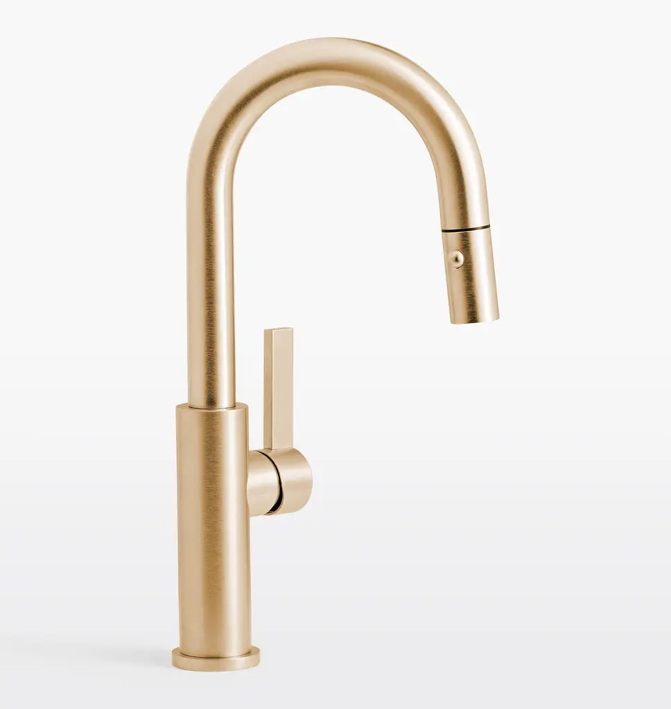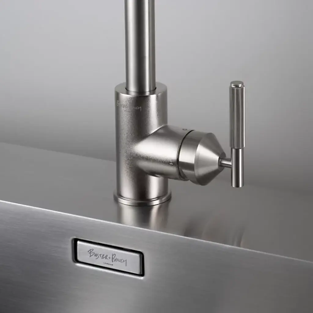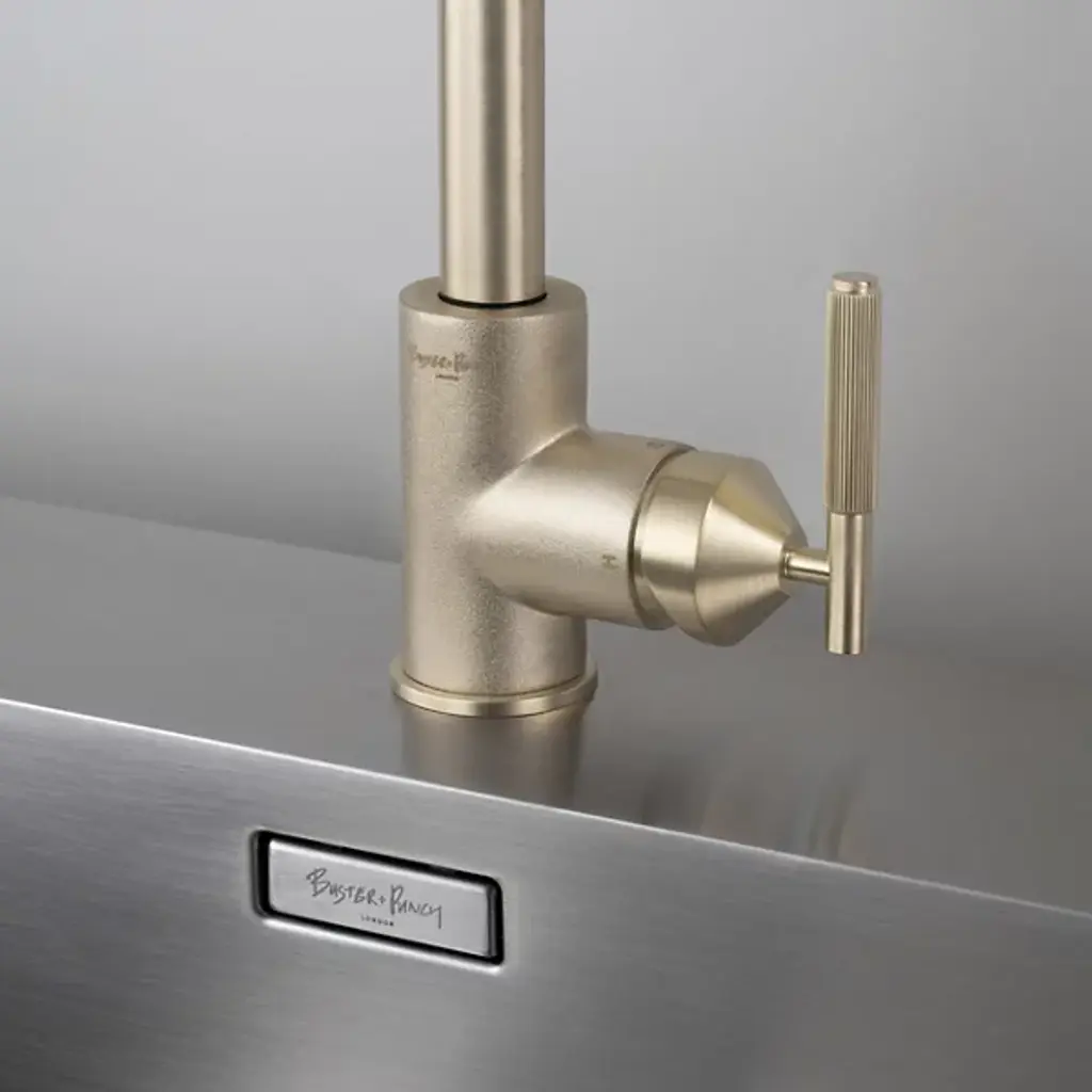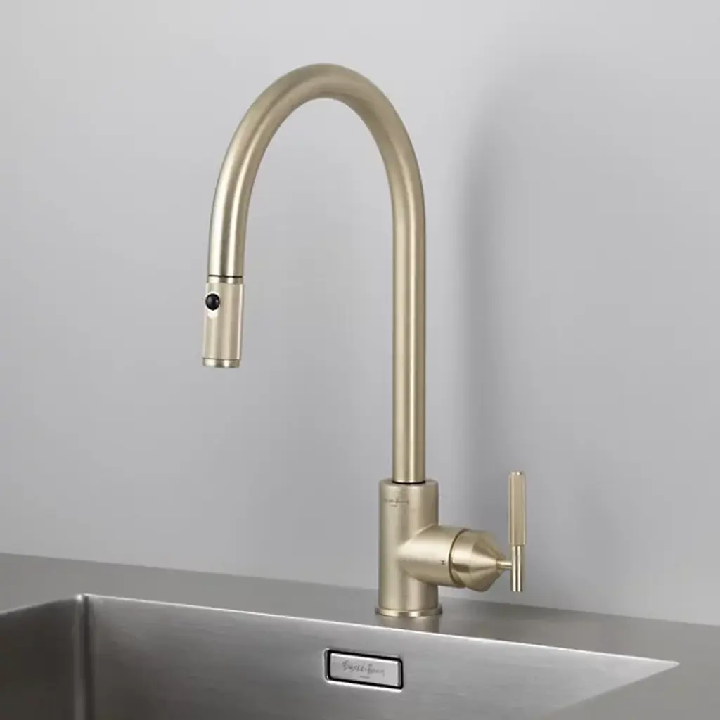The Kitchen Dual-Spray Pull-Out Mixer Linear Faucet from Buster + Punch seamlessly blends transitional style with exceptional functionality. Crafted from sturdy brass, this faucet boasts a cane-like profile that adds charm to your kitchen. It's designed to effortlessly mix hot and cold water lines so that you have the temperature that you desire. The faucet comes equipped with a cross-knurled lever and aerator cap, adding an extra layer of elegance and ease of use. The spout swivels a full 360 degrees.
