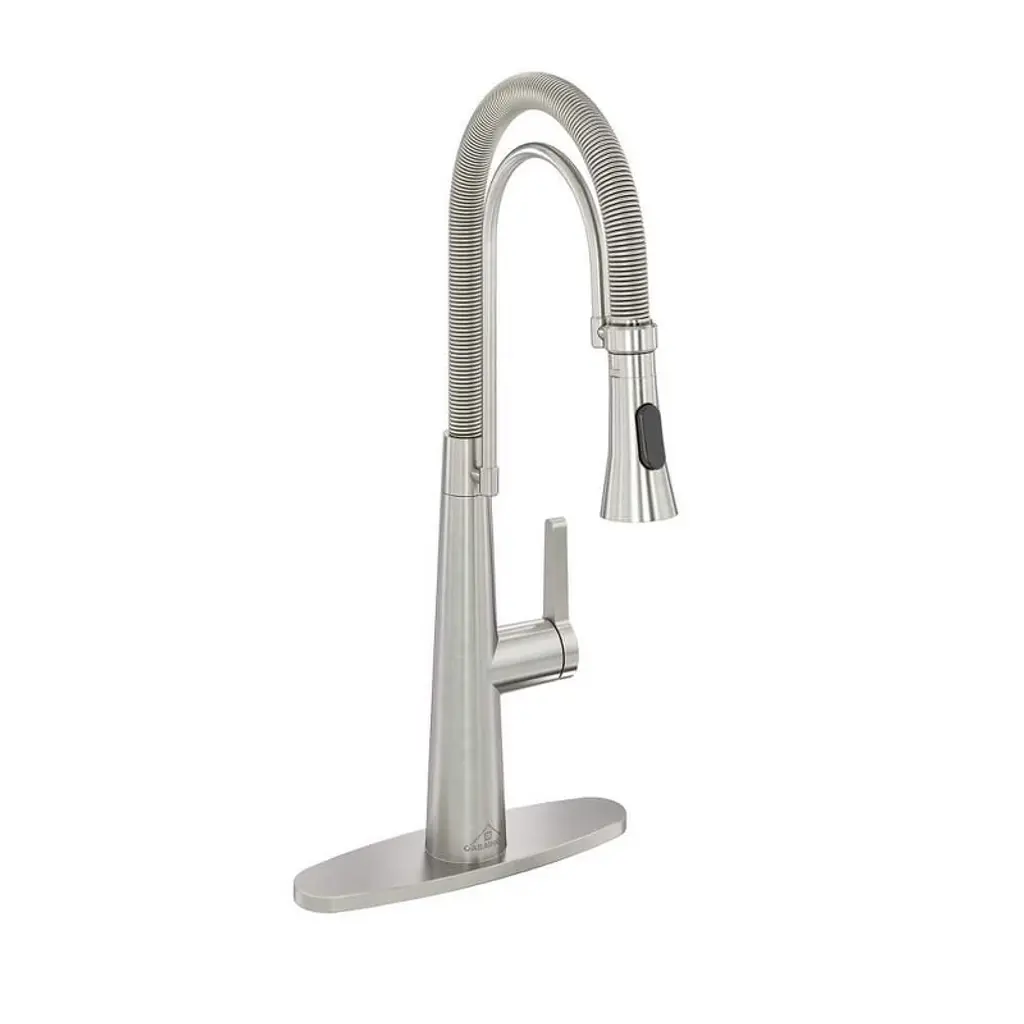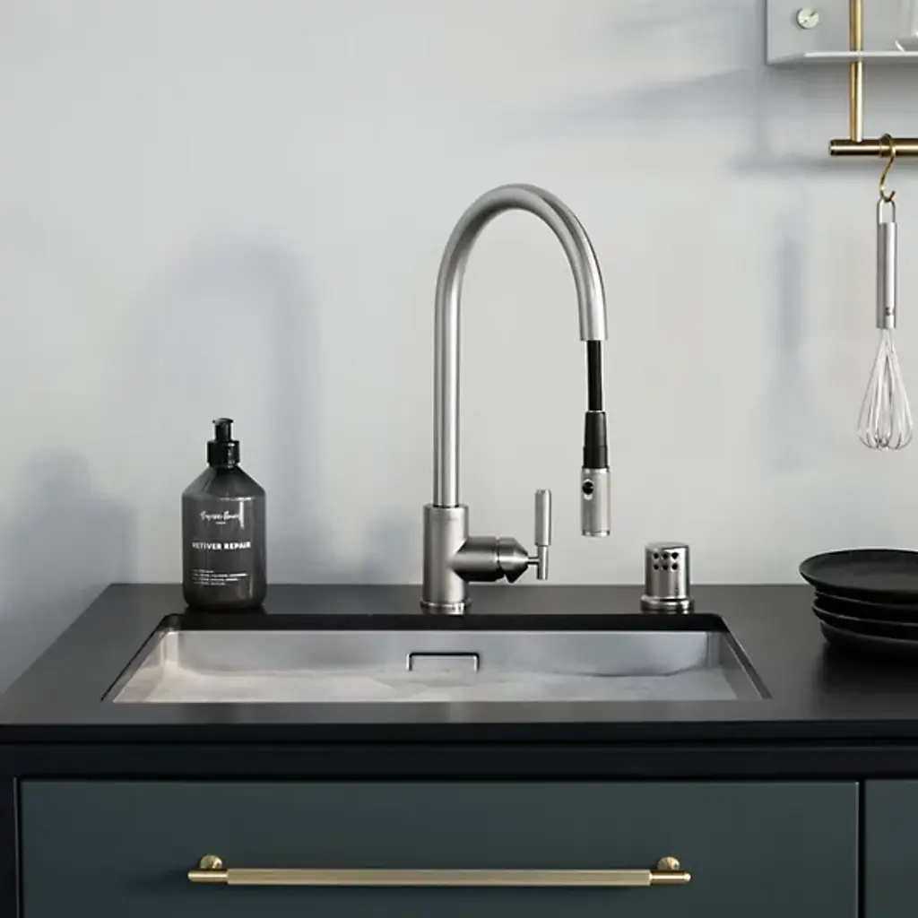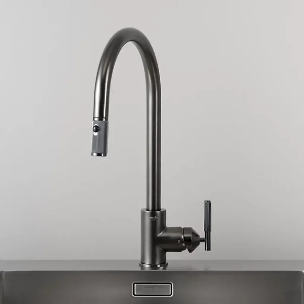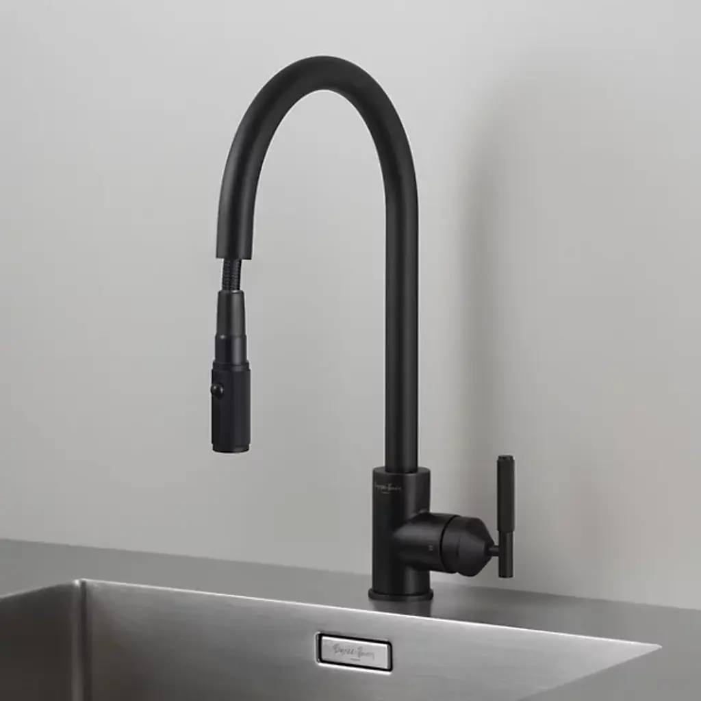 The Kitchen Dual-Spray Pull-Out Mixer Linear Faucet from Buster + Punch seamlessly blends transitional style with exceptional functionality. Crafted from sturdy brass, this faucet boasts a cane-like profile that adds charm to your kitchen. It's designed to effortlessly mix hot and cold water lines so that you have the temperature that you desire. The faucet comes equipped with a cross-knurled lever and aerator cap, adding an extra layer of elegance and ease of use. The spout swivels a full 360 degrees.