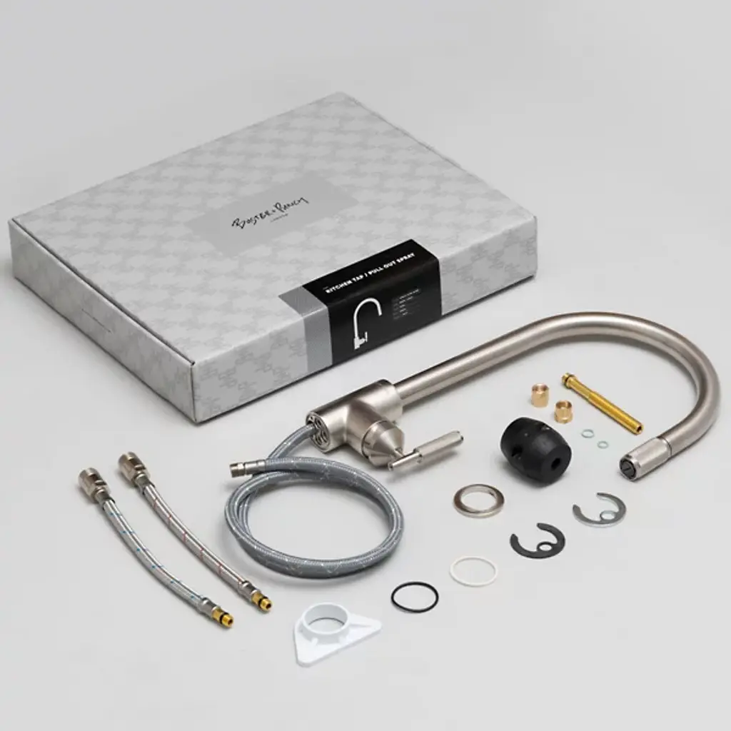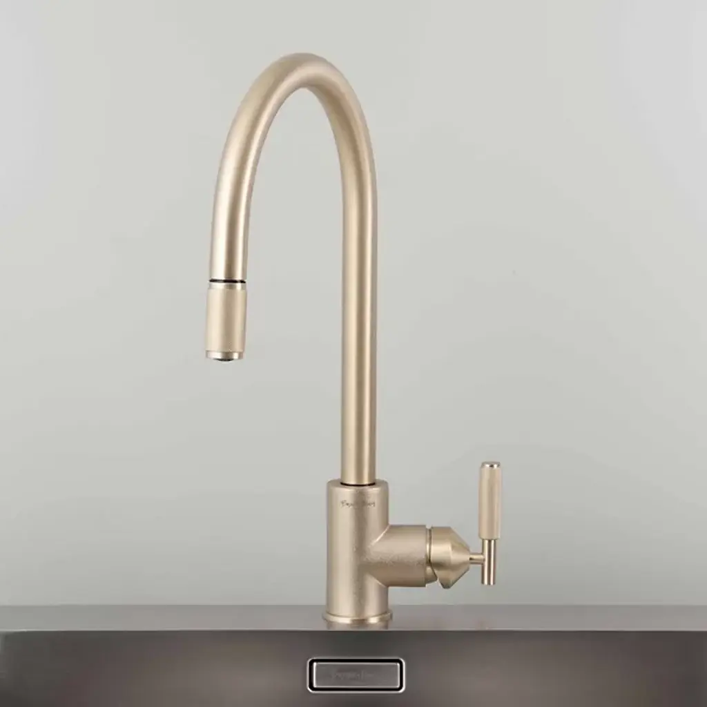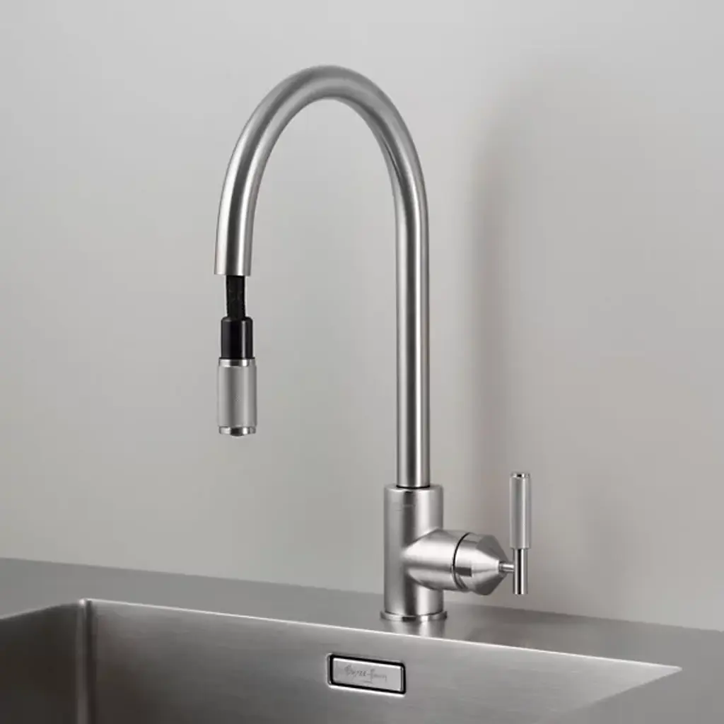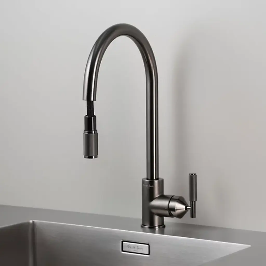 The Kitchen Pull-Out Mixer Cross Faucet from Buster + Punch effortlessly blends form and function. With its arching shape that creates a fluid and elegant look, this faucet complements your transitional kitchen. Crafted from durable brass, it is built to withstand the demands of everyday use. The vertically oriented handle allows for easy control of the volume of water for precise hand washing or dish cleaning. The faucet’s pull-out design offers convenience.